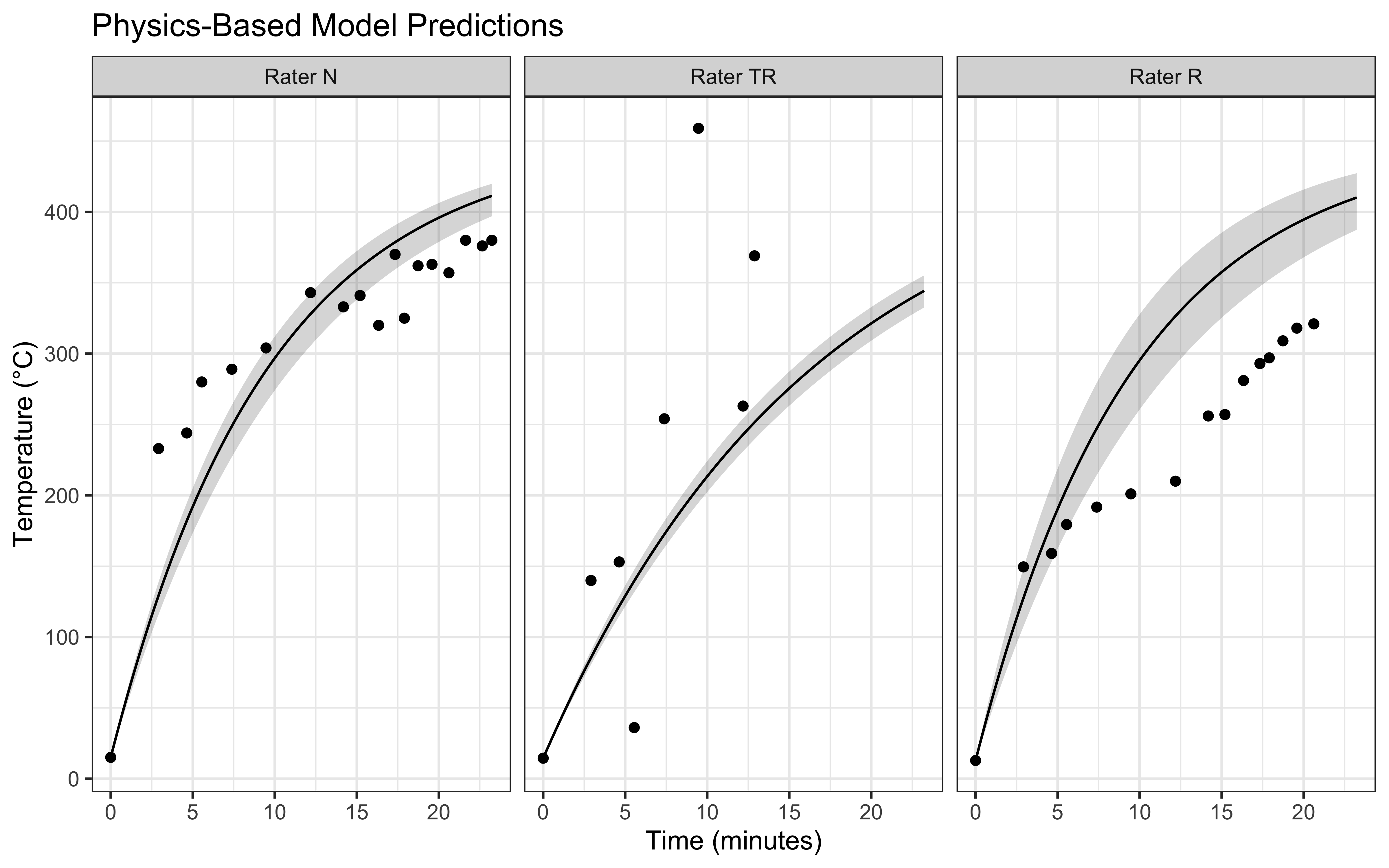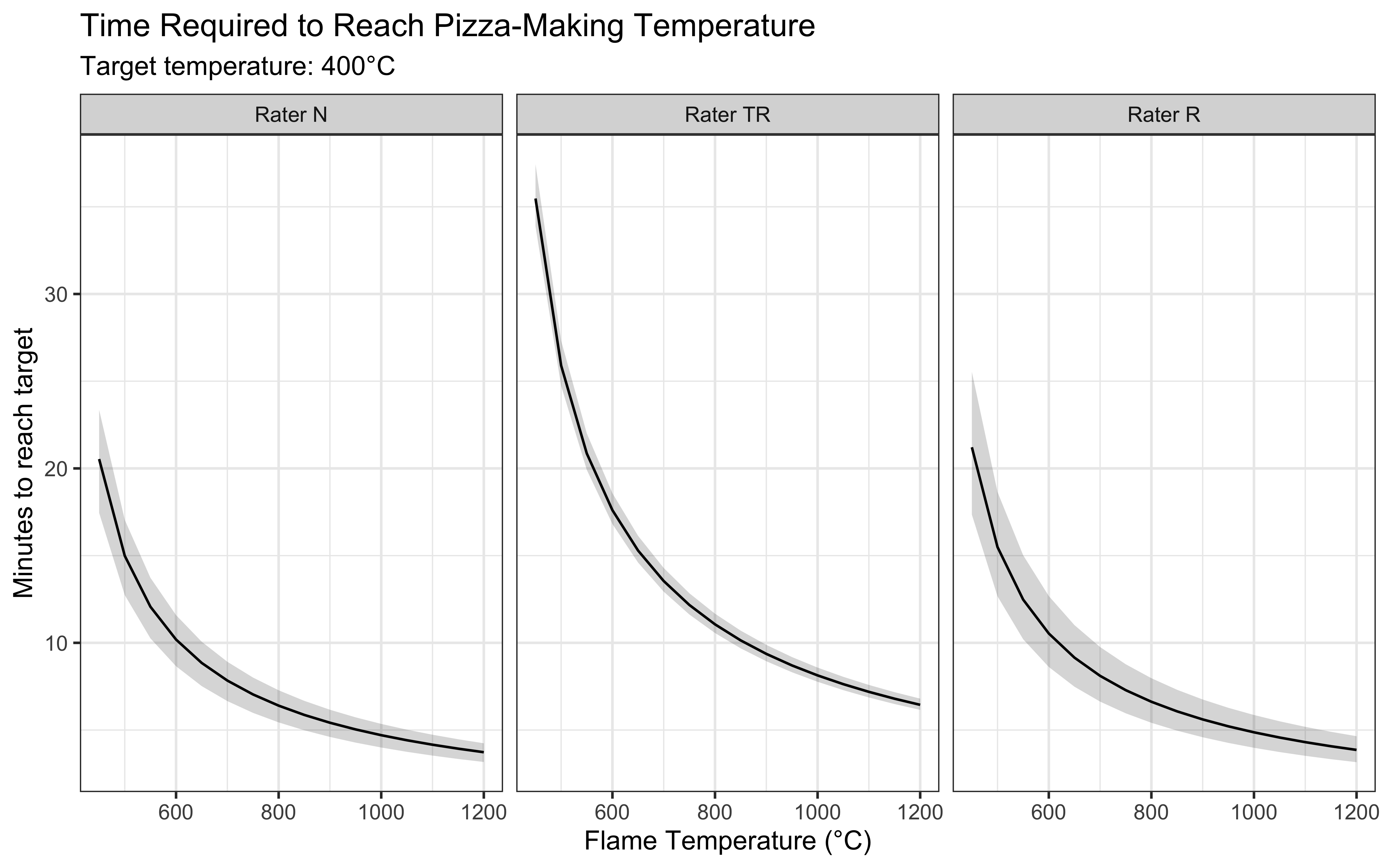 However, we should also consider that the model best fits the measurements from Rater N, who measured at the boundary between flame and stone. This suggests that our predictions are most applicable to the border of the stone, and less to the center (measured by R). Yet, it is the center of the stone that is a better index of the temperature all of our pizza will receive. Therefore we should add a few minutes to the model estimates to ensure best real-world outcomes.