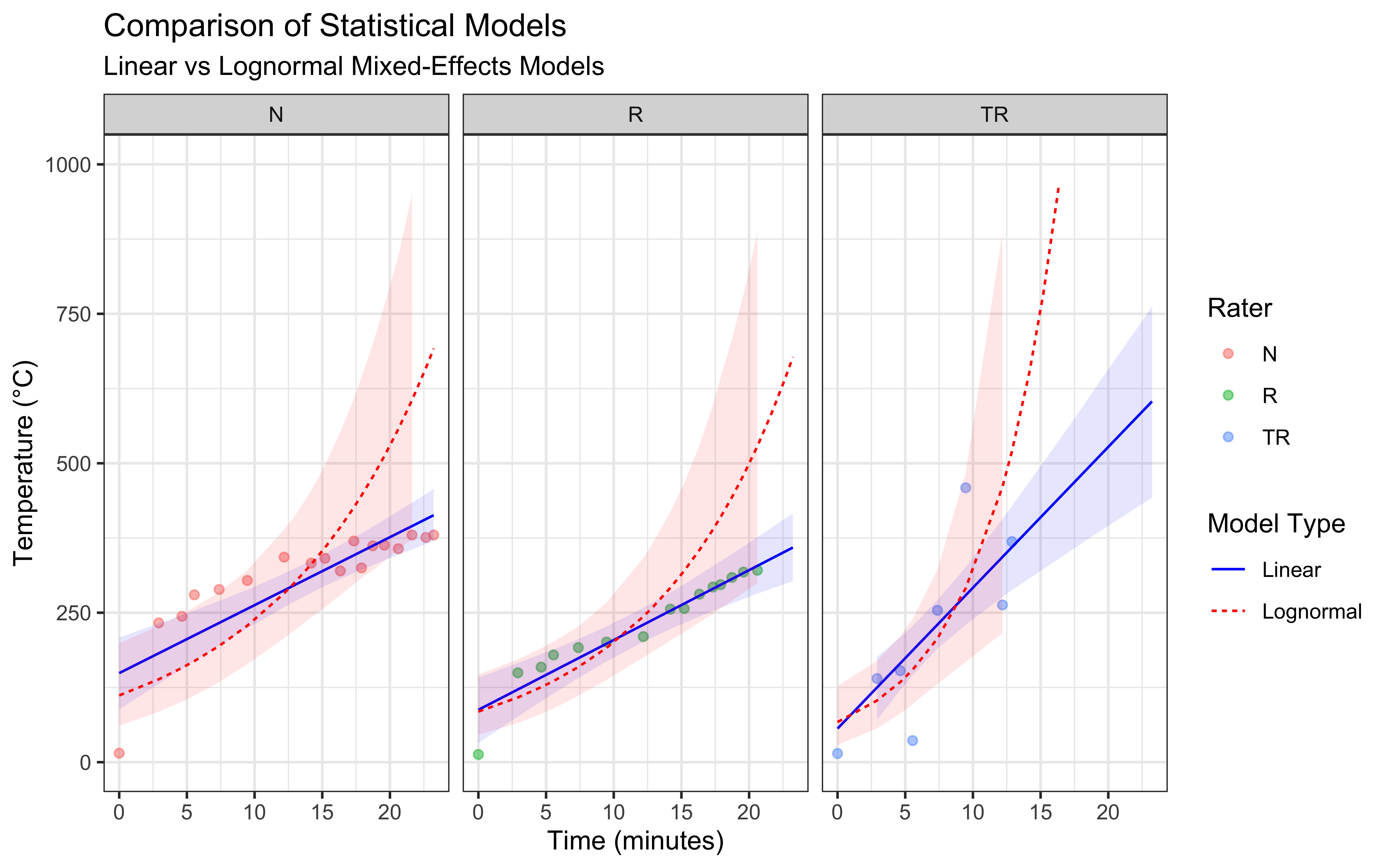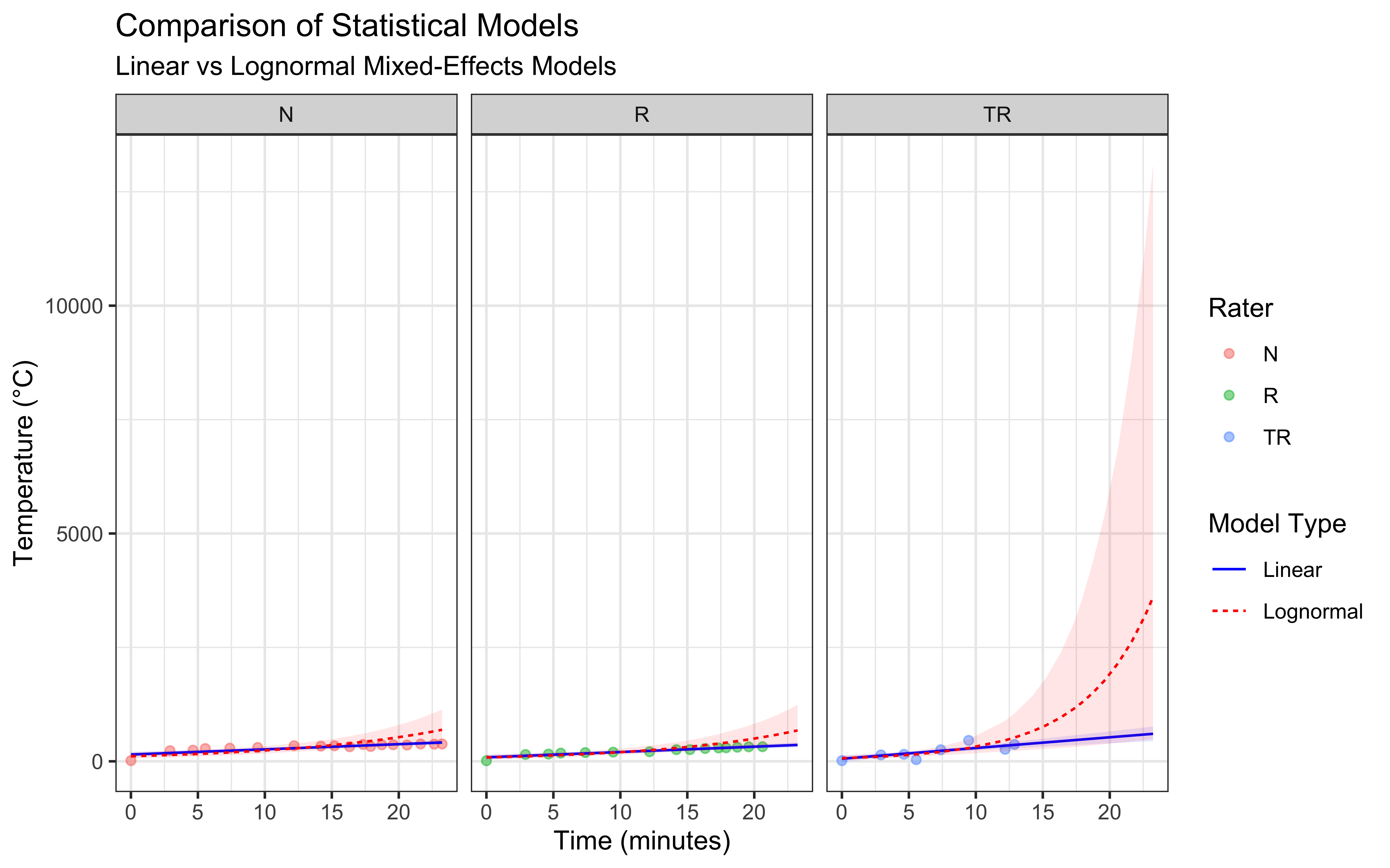 Missing Data: Some measurements are missing (NA values), particularly in the later time points for Rater TR. This is common in real-world data collection and needs to be considered in our analysis.
