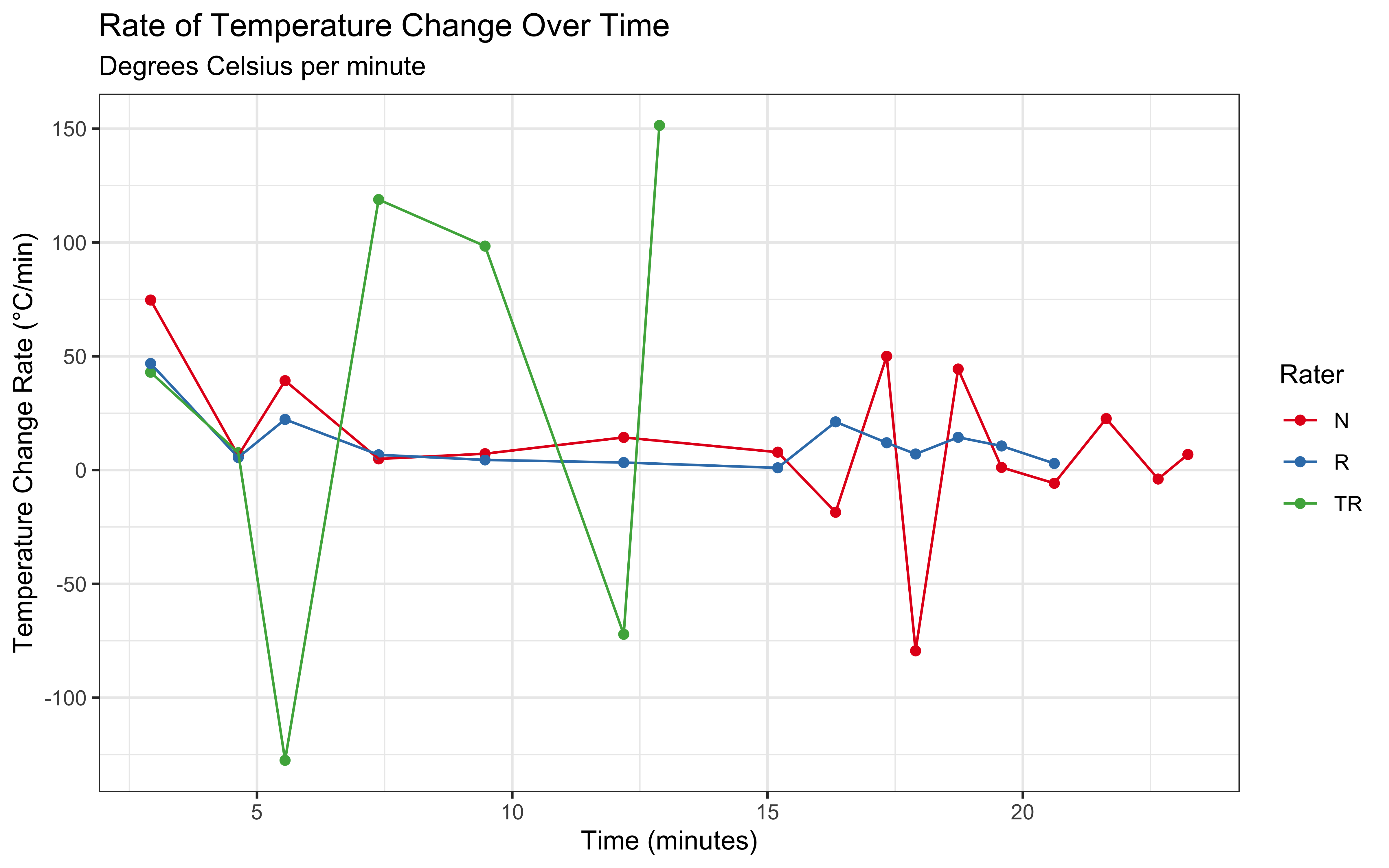 - Rater R shows a more gradual temperature increase pattern
