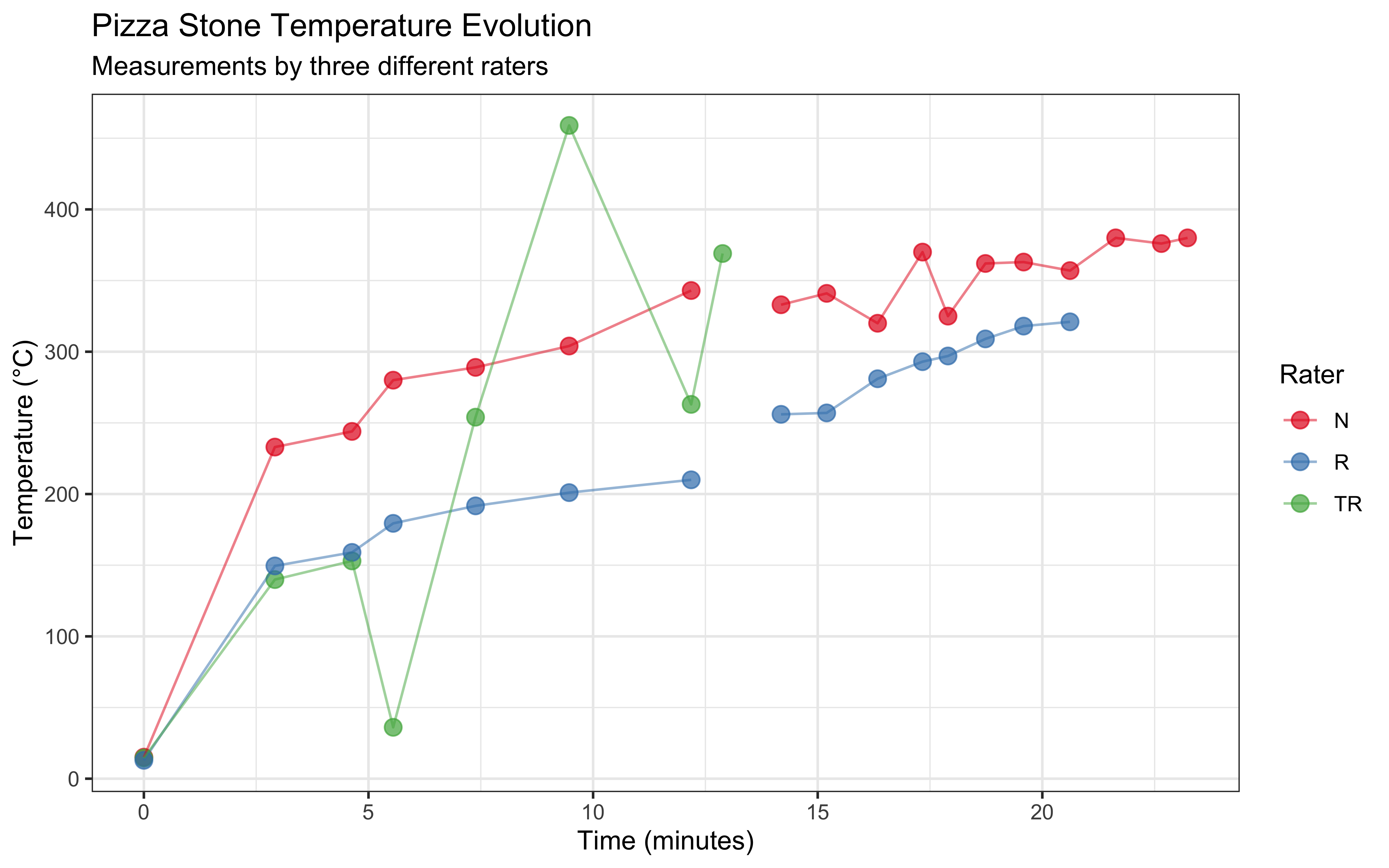 In this study, we collected temperature measurements from a pizza stone in a gas-fired oven using an infrared temperature gun. Three different raters (N, TR, and R) took measurements over time to track how the stone heated up. Understanding how pizza stones heat up is crucial for achieving the perfect pizza crust, as consistent and sufficient stone temperature is essential for proper baking.