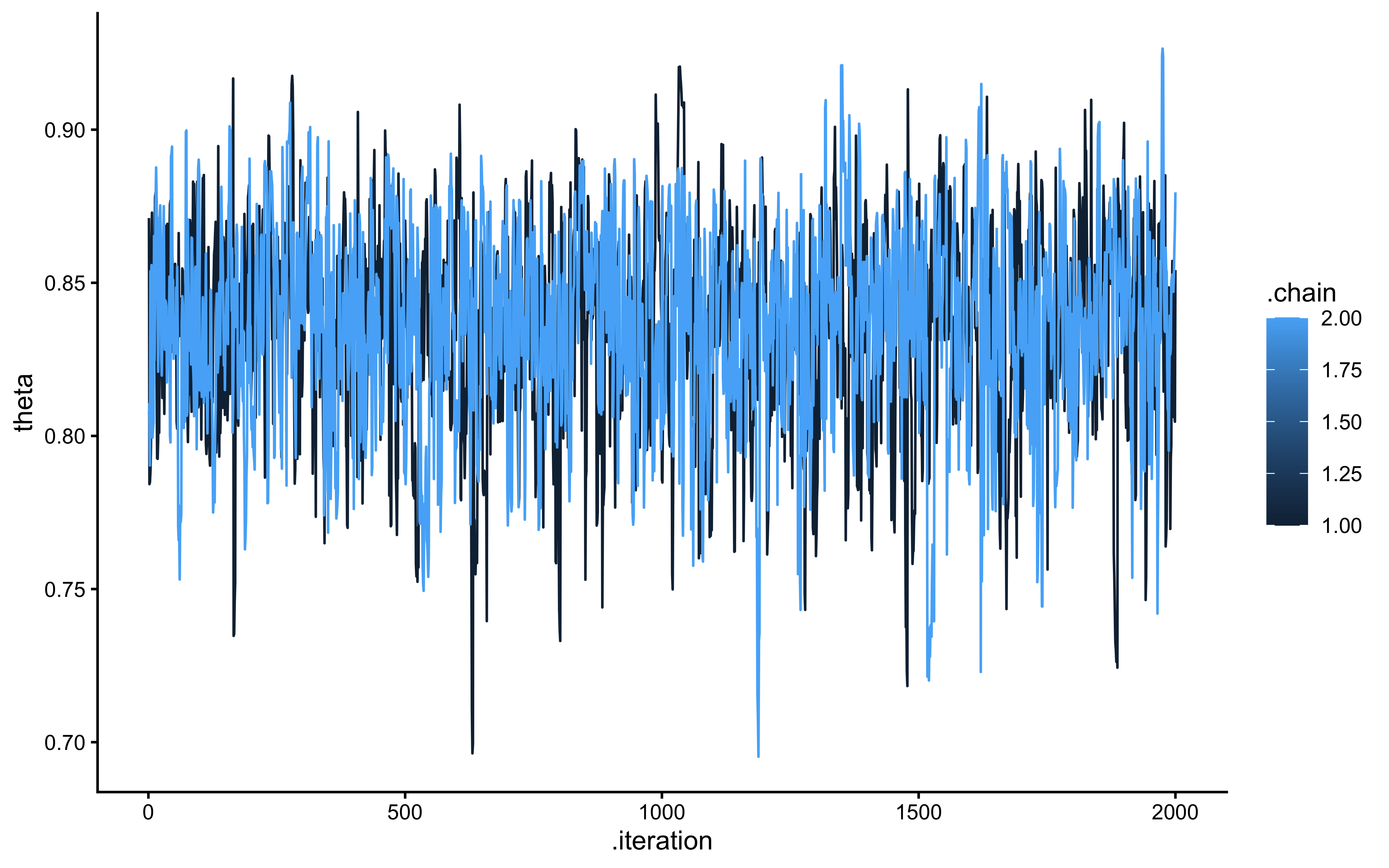 ggplot(draws_df_biased_logodds, aes(.iteration, theta, group = .chain, color = .chain)) +geom_line() +theme_classic()