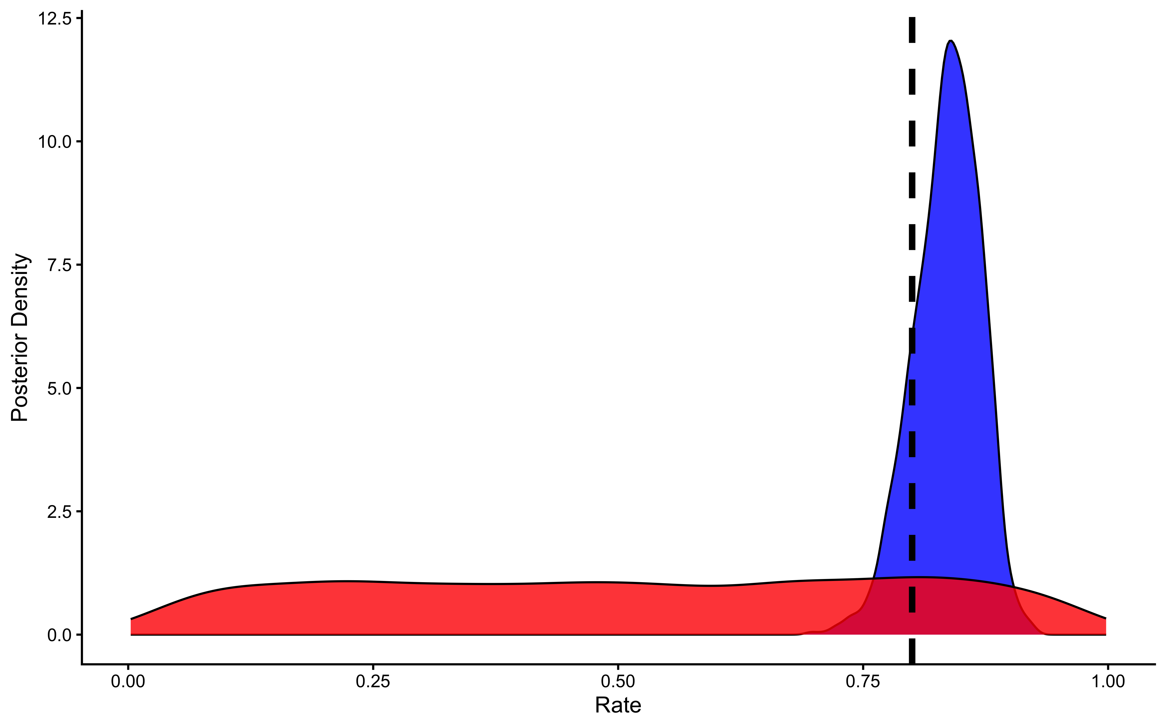 # Now let's plot the density for theta (prior and posterior)ggplot(draws_df_biased_logodds) +geom_density(aes(theta), fill ="blue", alpha =0.8) +geom_density(aes(prior_theta), fill ="red", alpha =0.8) +geom_vline(xintercept =0.8, linetype ="dashed", color ="black", size =1.5) +xlab("Rate") +ylab("Posterior Density") +theme_classic()