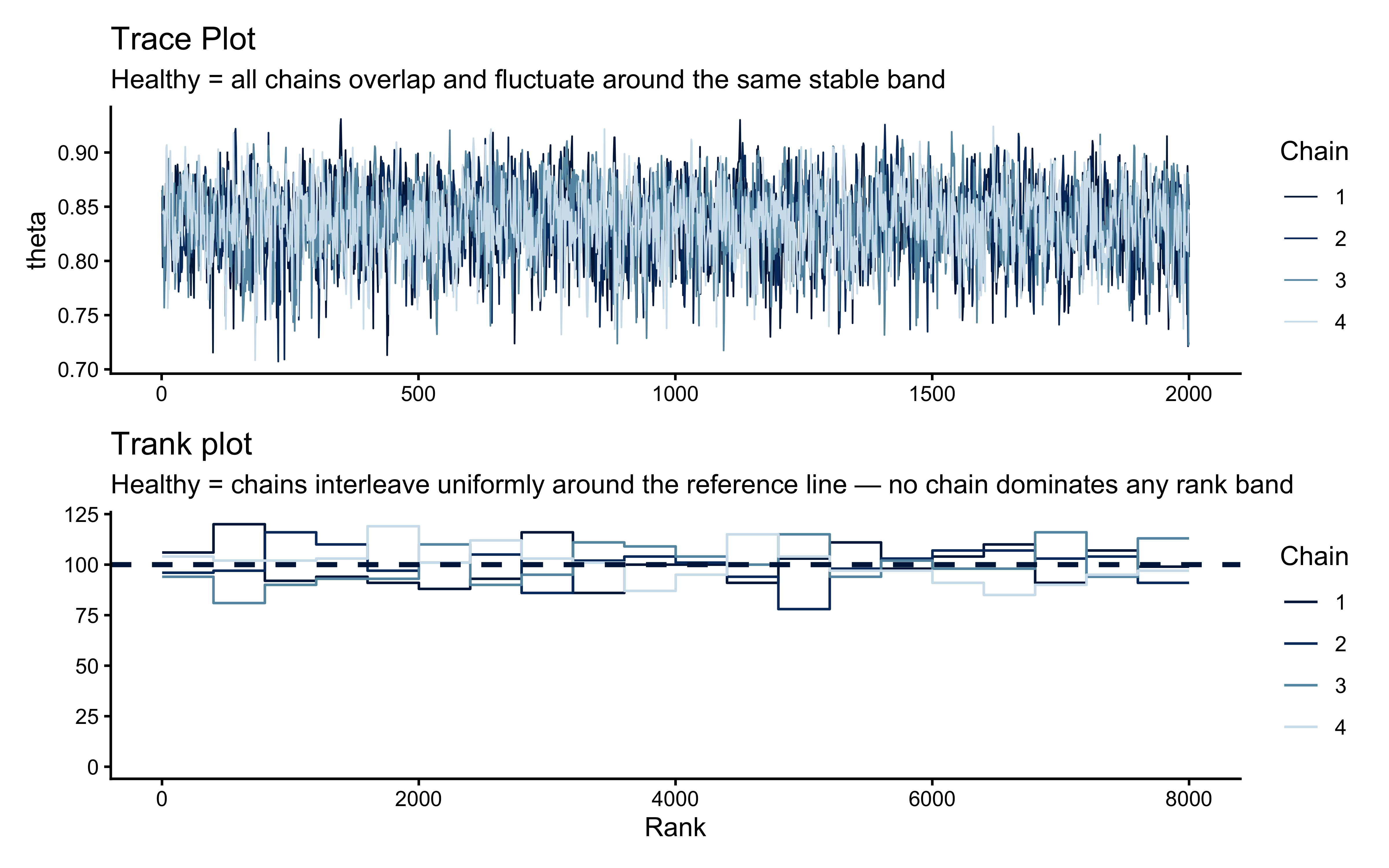 # 3. Visual Checks (Trace and Rank Plots)draws_df <-as_draws_df(fit_bernoulli$draws())# A healthy trace plot is well-mixed with no wanderingp_trace <-mcmc_trace(draws_df, pars ="theta") +theme_classic() +ggtitle("Trace Plot", subtitle ="Healthy = all chains overlap and fluctuate around the same stable band")# A healthy rank histogram has uniform bars across all chainsp_rank <-mcmc_rank_overlay(draws_df, pars ="theta", ref_line =TRUE) +theme_classic() +ggtitle("Trank plot", subtitle ="Healthy = chains interleave uniformly around the reference line — no chain dominates any rank band")p_trace / p_rank
