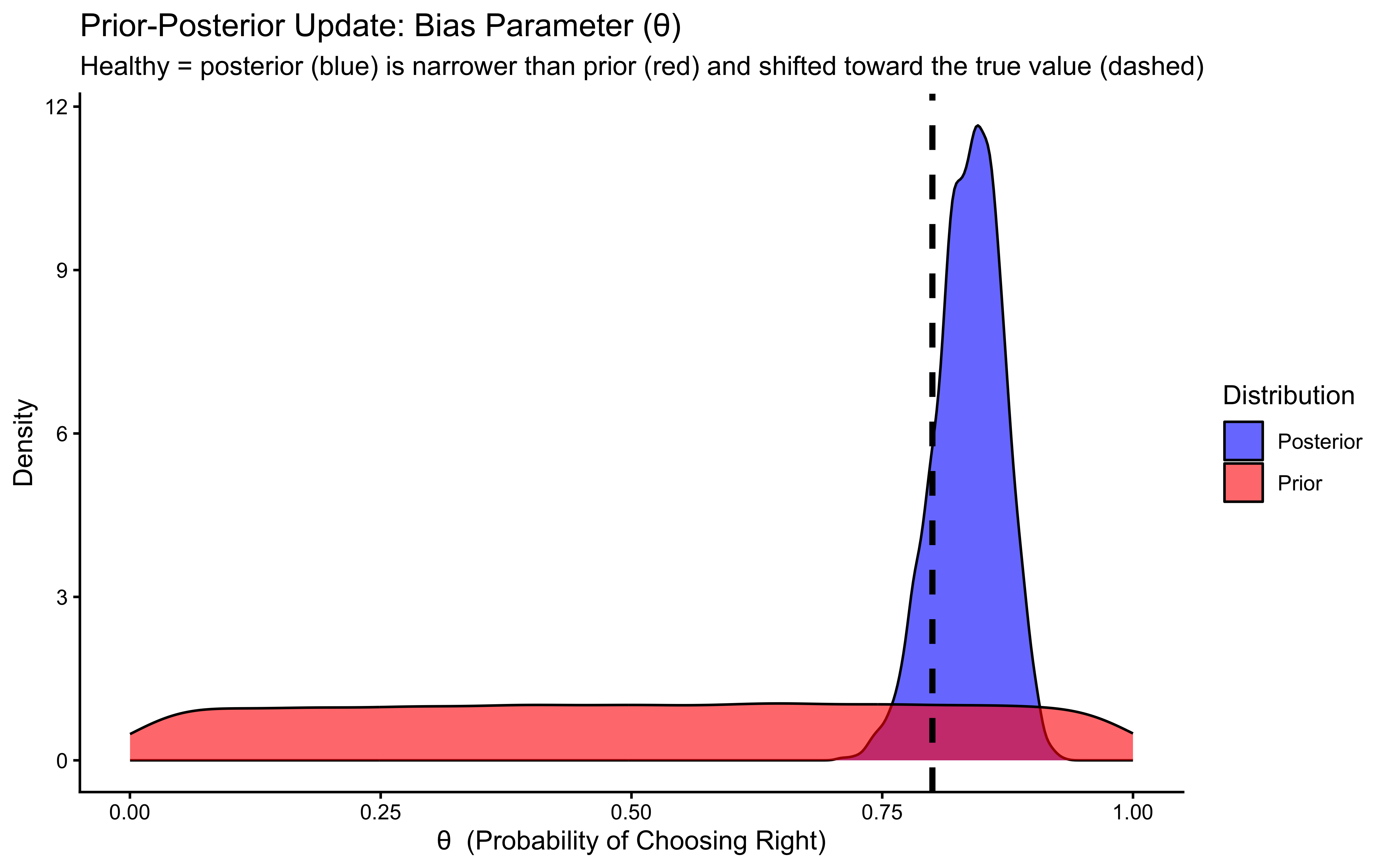 # 4. Look at the Posterior Estimateggplot(draws_df) +geom_density(aes(theta, fill ="Posterior"), alpha =0.6) +geom_density(aes(prior_theta, fill ="Prior"), alpha =0.6) +geom_vline(xintercept =0.8, linetype ="dashed", color ="black", linewidth =1.2) +scale_fill_manual(values =c("Posterior"="blue", "Prior"="red")) +labs(title ="Prior-Posterior Update: Bias Parameter (θ)",subtitle ="Healthy = posterior (blue) is narrower than prior (red) and shifted toward the true value (dashed)",x ="θ (Probability of Choosing Right)",y ="Density",fill ="Distribution" ) +theme_classic()
