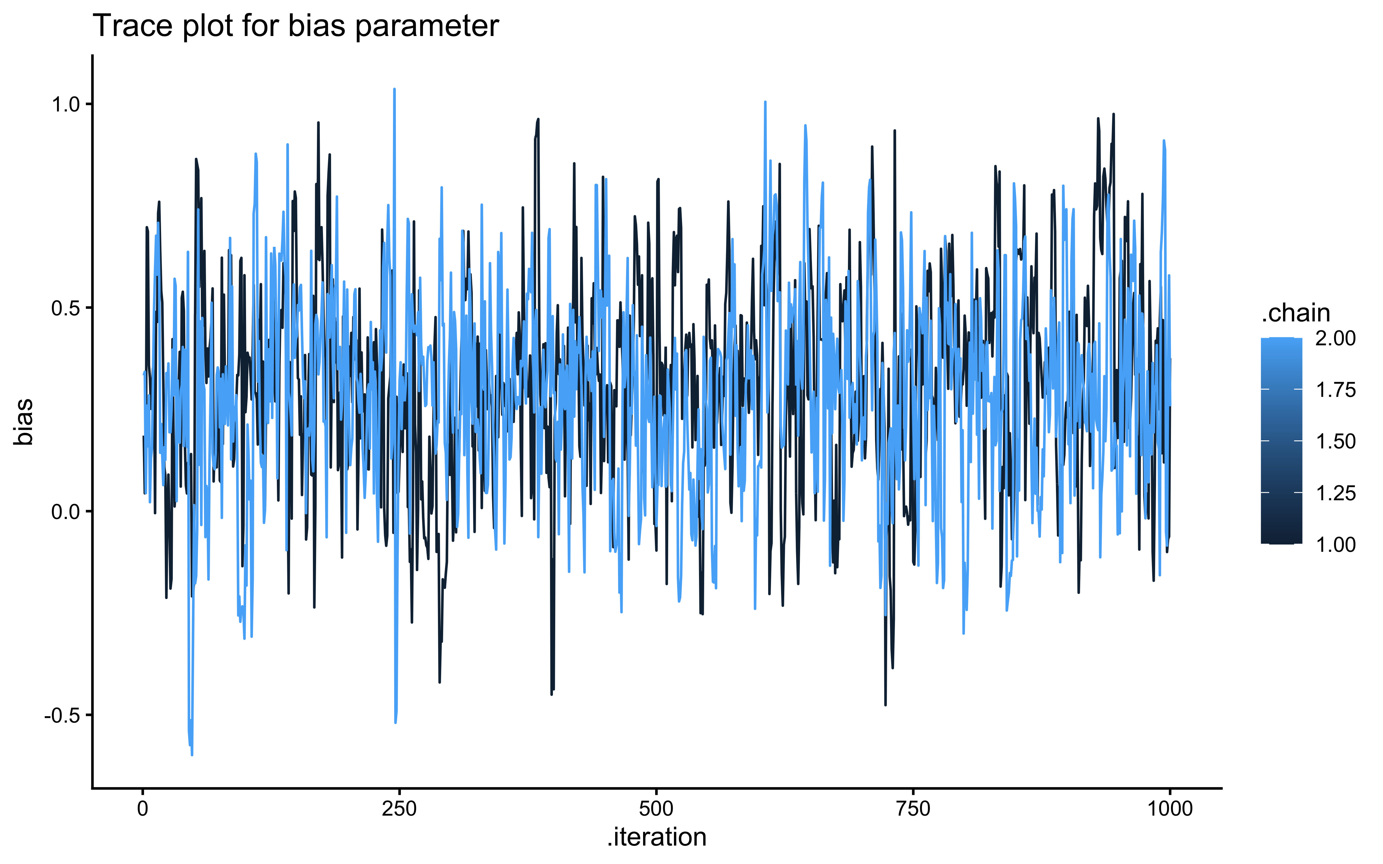 # Trace plot for biasggplot(draws_df_memory, aes(.iteration, bias, group = .chain, color = .chain)) +geom_line() +labs(title ="Trace plot for bias parameter") +theme_classic()