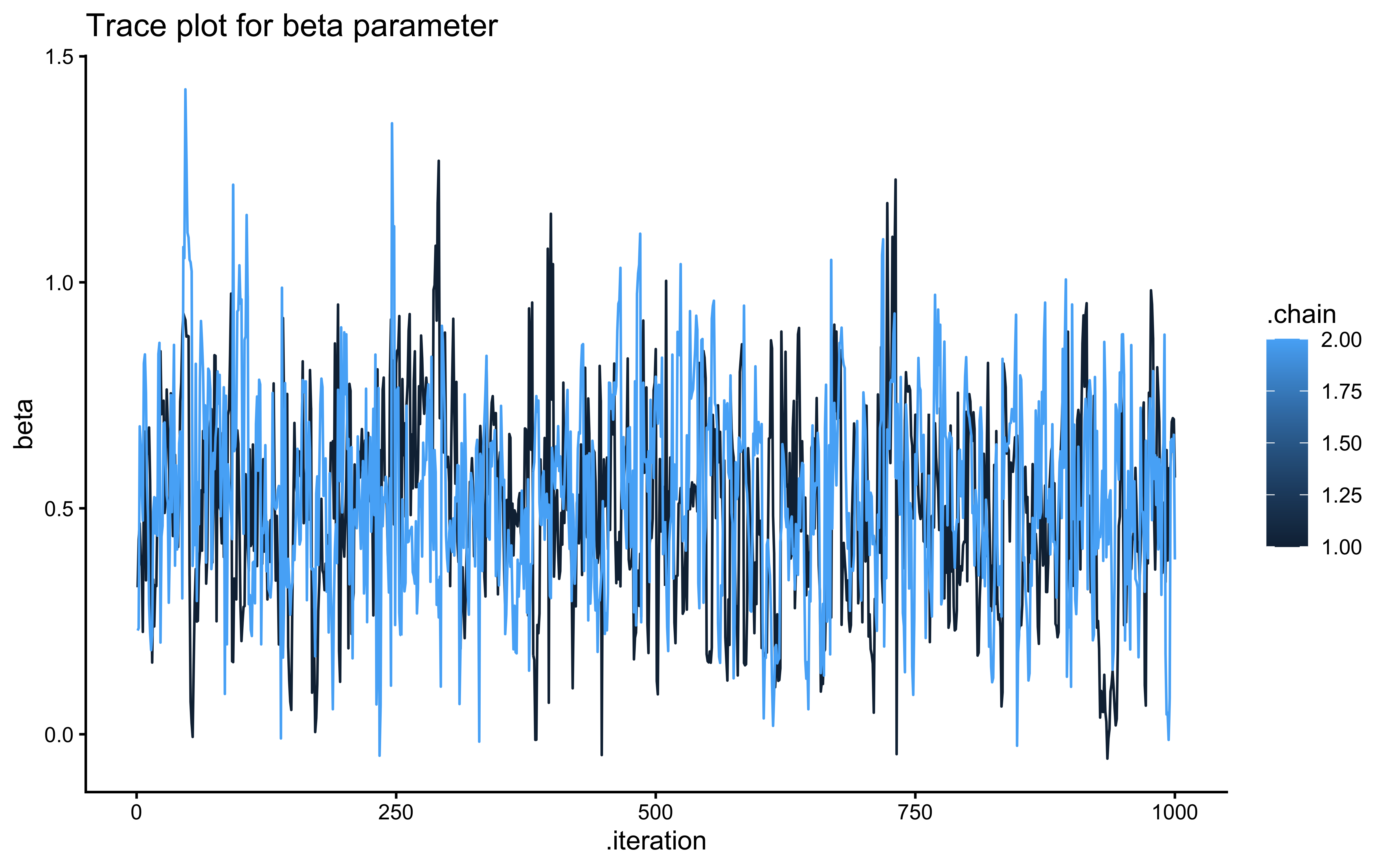# Trace plot for betaggplot(draws_df_memory, aes(.iteration, beta, group = .chain, color = .chain)) +geom_line() +labs(title ="Trace plot for beta parameter") +theme_classic()