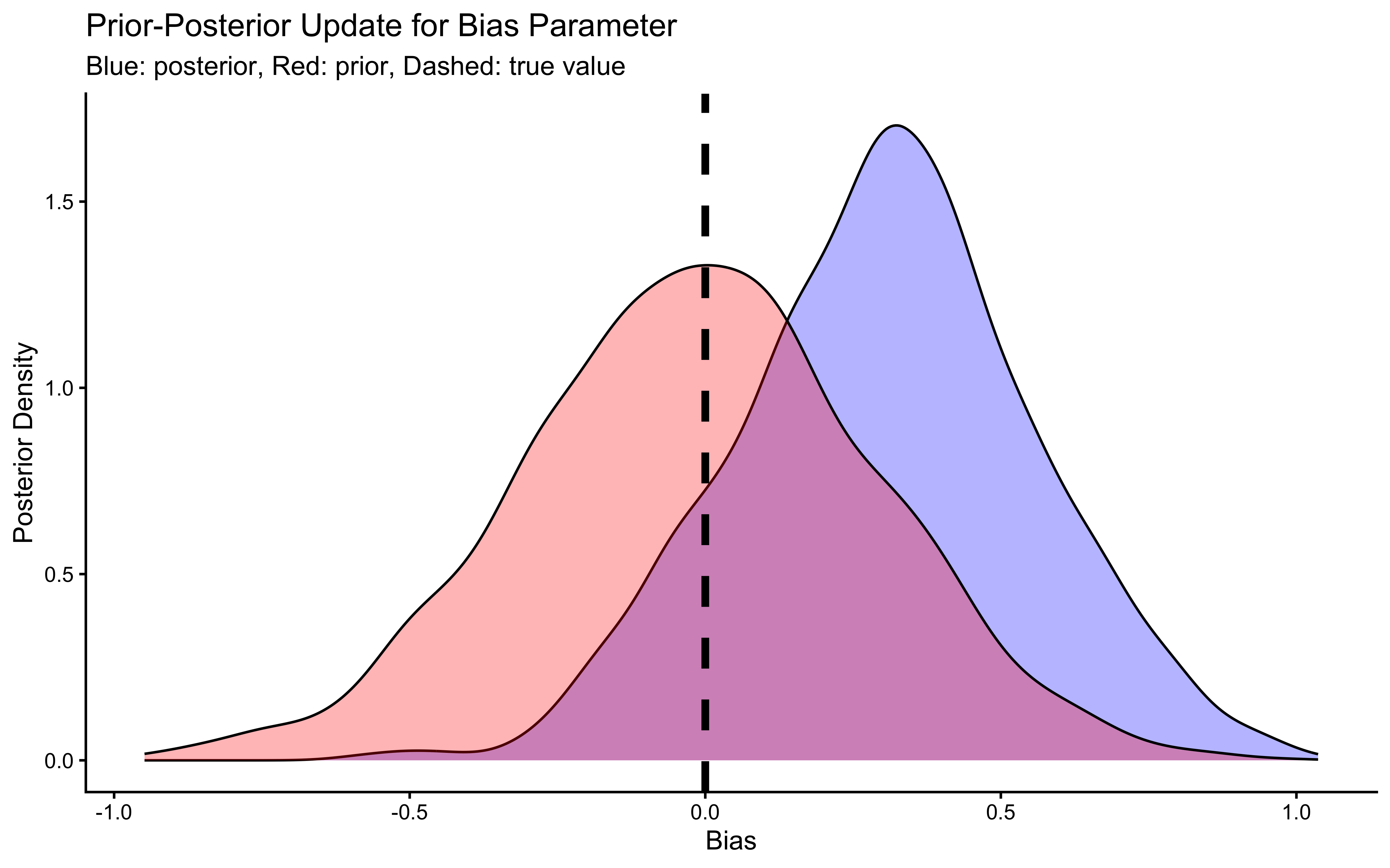 # Now let's plot the density for bias (prior and posterior)ggplot(draws_df_memory) +geom_density(aes(bias), fill ="blue", alpha =0.3) +geom_density(aes(bias_prior), fill ="red", alpha =0.3) +geom_vline(xintercept =0, linetype ="dashed", color ="black", size =1.5) +labs(title ="Prior-Posterior Update for Bias Parameter",subtitle ="Blue: posterior, Red: prior, Dashed: true value") +xlab("Bias") +ylab("Posterior Density") +theme_classic()