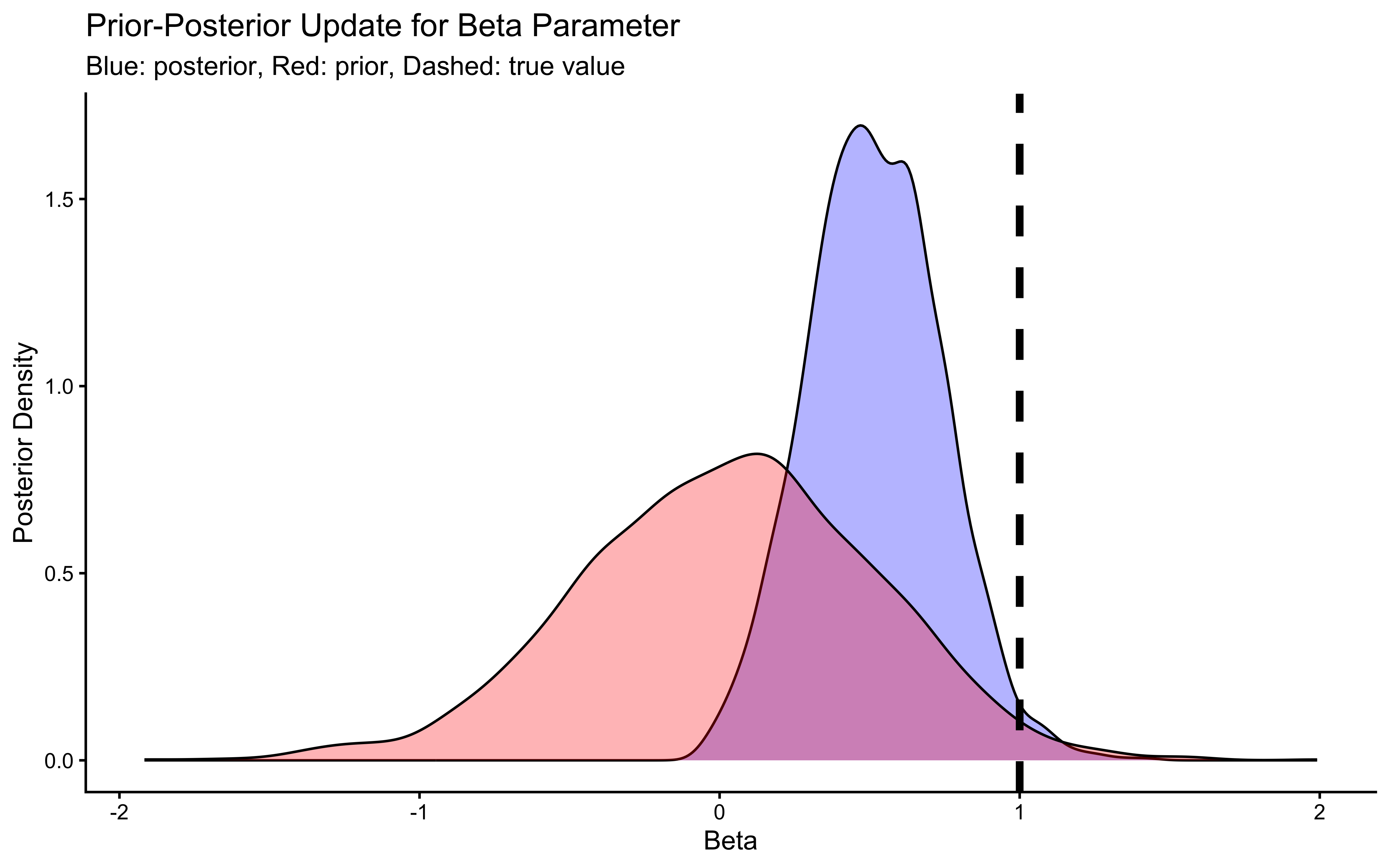 # Now let's plot the density for beta (prior and posterior)ggplot(draws_df_memory) +geom_density(aes(beta), fill ="blue", alpha =0.3) +geom_density(aes(beta_prior), fill ="red", alpha =0.3) +geom_vline(xintercept =1, linetype ="dashed", color ="black", size =1.5) +labs(title ="Prior-Posterior Update for Beta Parameter",subtitle ="Blue: posterior, Red: prior, Dashed: true value") +xlab("Beta") +ylab("Posterior Density") +theme_classic()