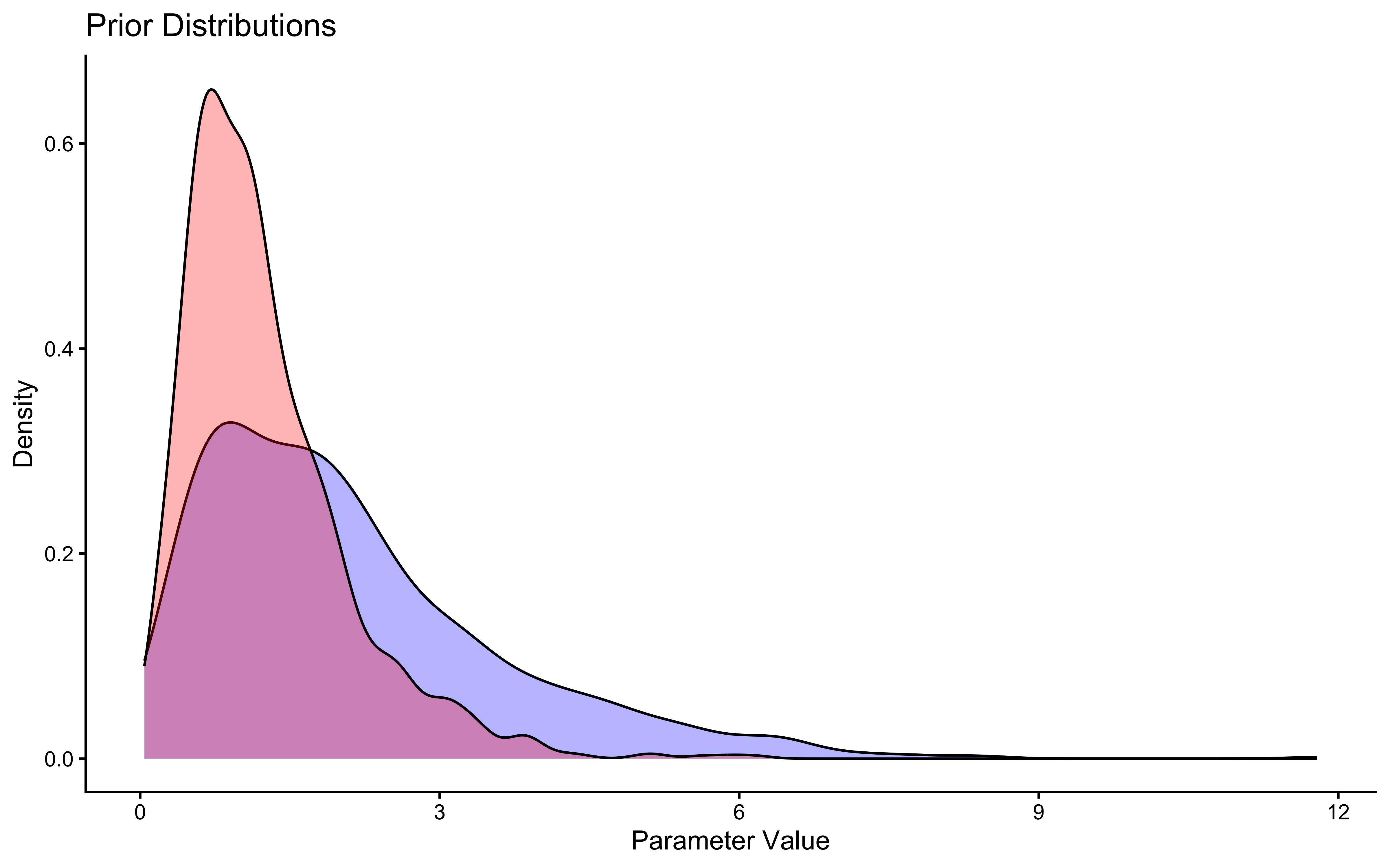 # Extract drawsdraws_df <-as_draws_df(samples_memory_bayes$draws())# First let's look at the priorsggplot(draws_df) +geom_density(aes(alpha_prior), fill ="blue", alpha =0.3) +geom_density(aes(beta_prior), fill ="red", alpha =0.3) +theme_classic() +labs(title ="Prior Distributions",x ="Parameter Value",y ="Density")
