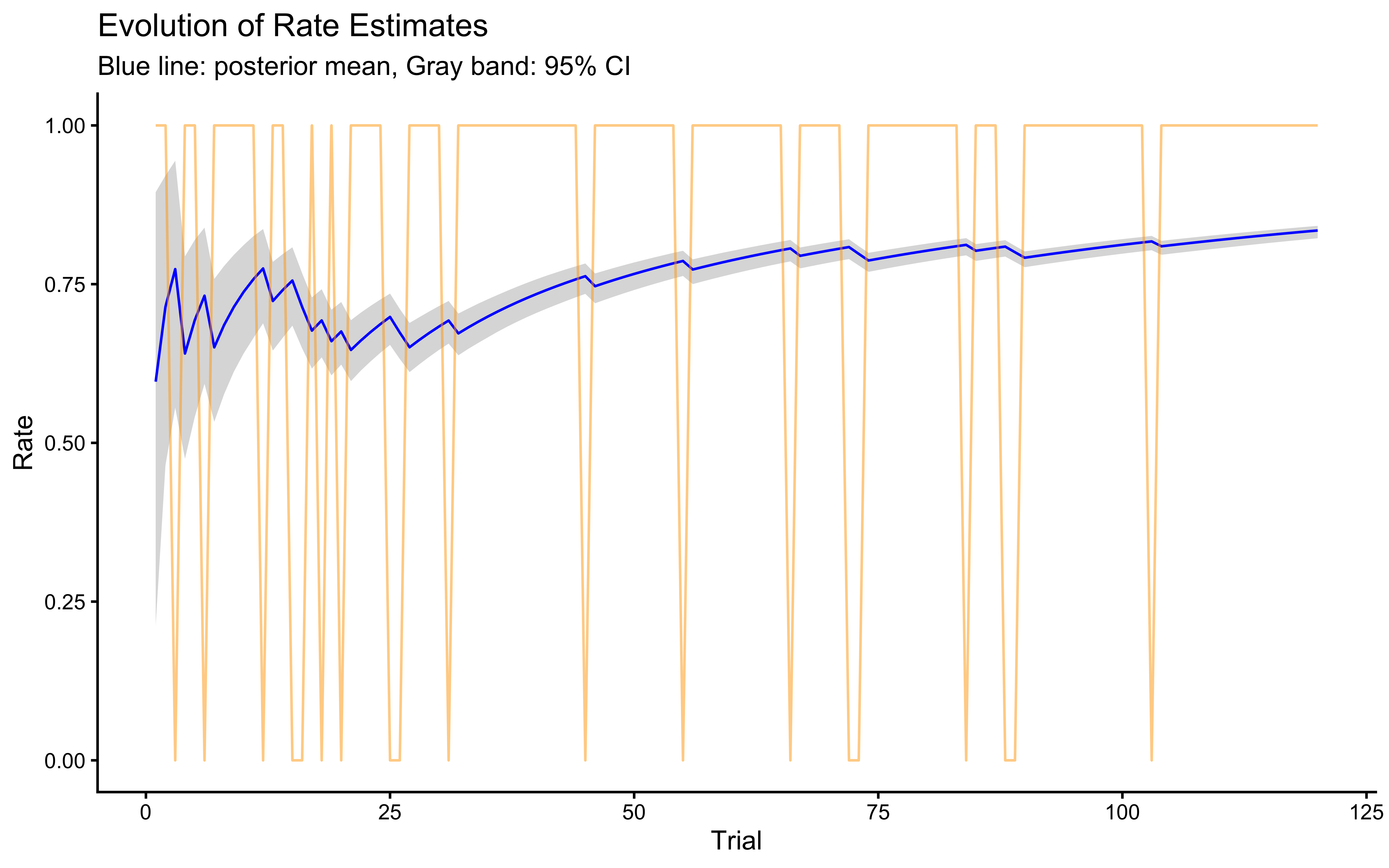# Now let's look at how the rate evolves over trials# First melt the rate values across trials into long formatrate_df <- draws_df %>% dplyr::select(starts_with("rate[")) %>%pivot_longer(everything(), names_to ="trial",values_to ="rate",names_pattern ="rate\\[(\\d+)\\]") %>%mutate(trial =as.numeric(trial))# Calculate summary statistics for each trialrate_summary <- rate_df %>%group_by(trial) %>%summarise(mean_rate =mean(rate),lower =quantile(rate, 0.025),upper =quantile(rate, 0.975) )plot_data <-tibble(trial =seq(120), choices = data$other)# Plot the evolution of rate estimatesggplot(rate_summary, aes(x = trial)) +geom_ribbon(aes(ymin = lower, ymax = upper), alpha =0.2) +geom_line(aes(y = mean_rate), color ="blue") +# Add true data pointsgeom_line(data = plot_data, aes(x = trial, y = choices), color ="orange", alpha =0.5) +theme_classic() +labs(title ="Evolution of Rate Estimates",x ="Trial",y ="Rate",subtitle ="Blue line: posterior mean, Gray band: 95% CI") +ylim(0, 1)