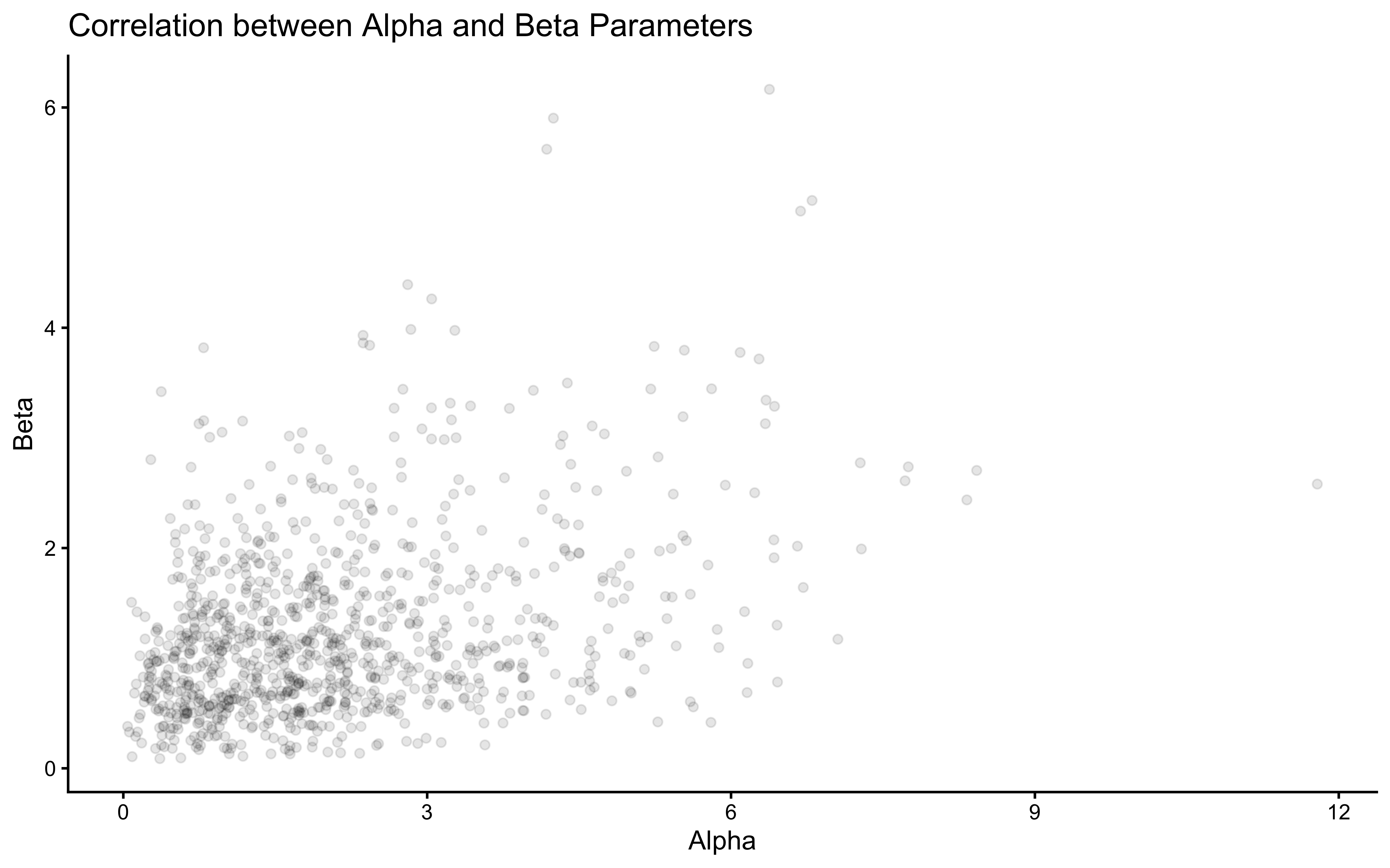 # Let's also look at the correlation between alpha and beta parametersggplot(draws_df) +geom_point(aes(alpha_prior, beta_prior), alpha =0.1) +theme_classic() +labs(title ="Correlation between Alpha and Beta Parameters",x ="Alpha",y ="Beta")