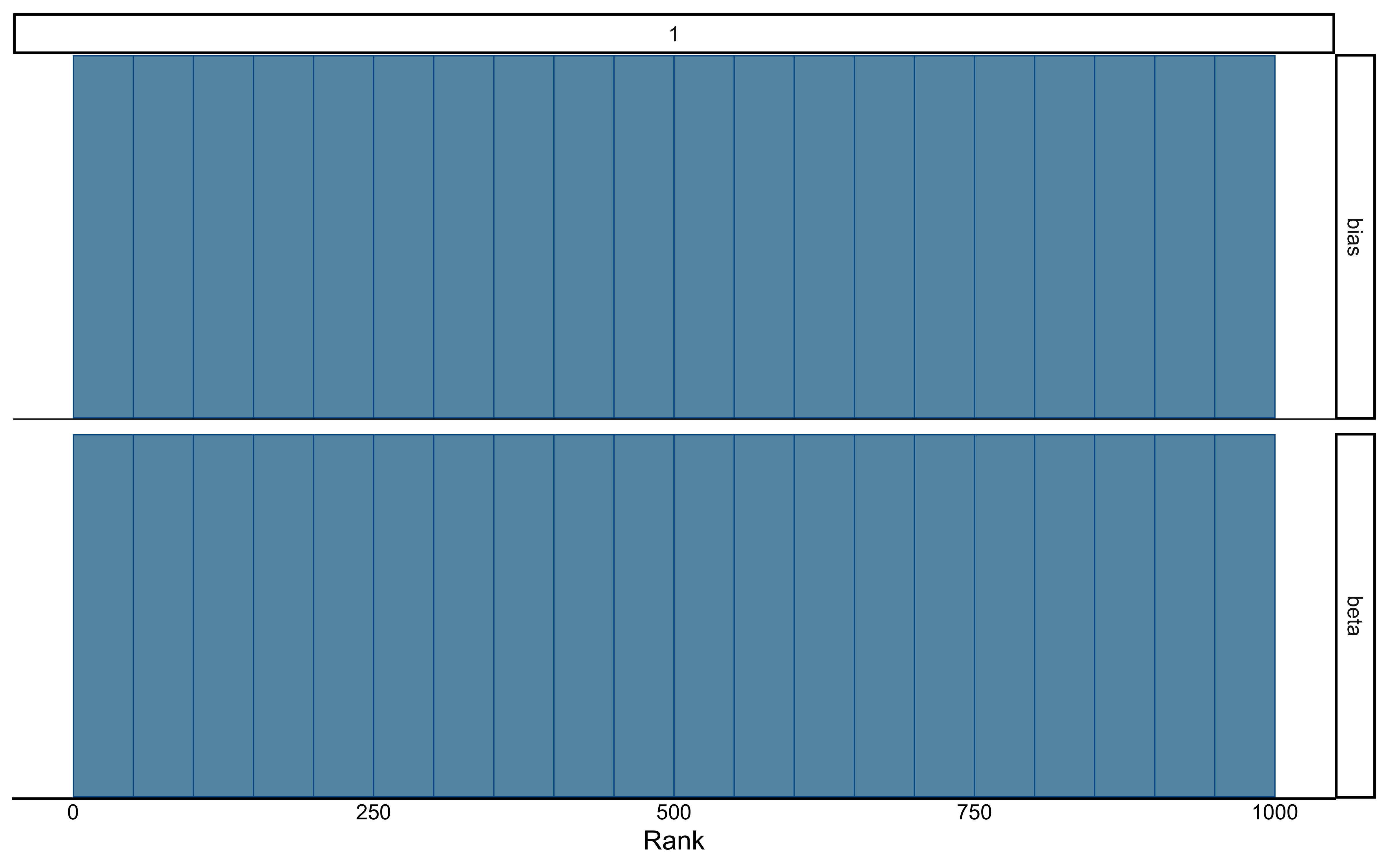 # Plot rank histograms to check mixingmcmc_rank_hist(draws_df, pars =c("bias", "beta"))