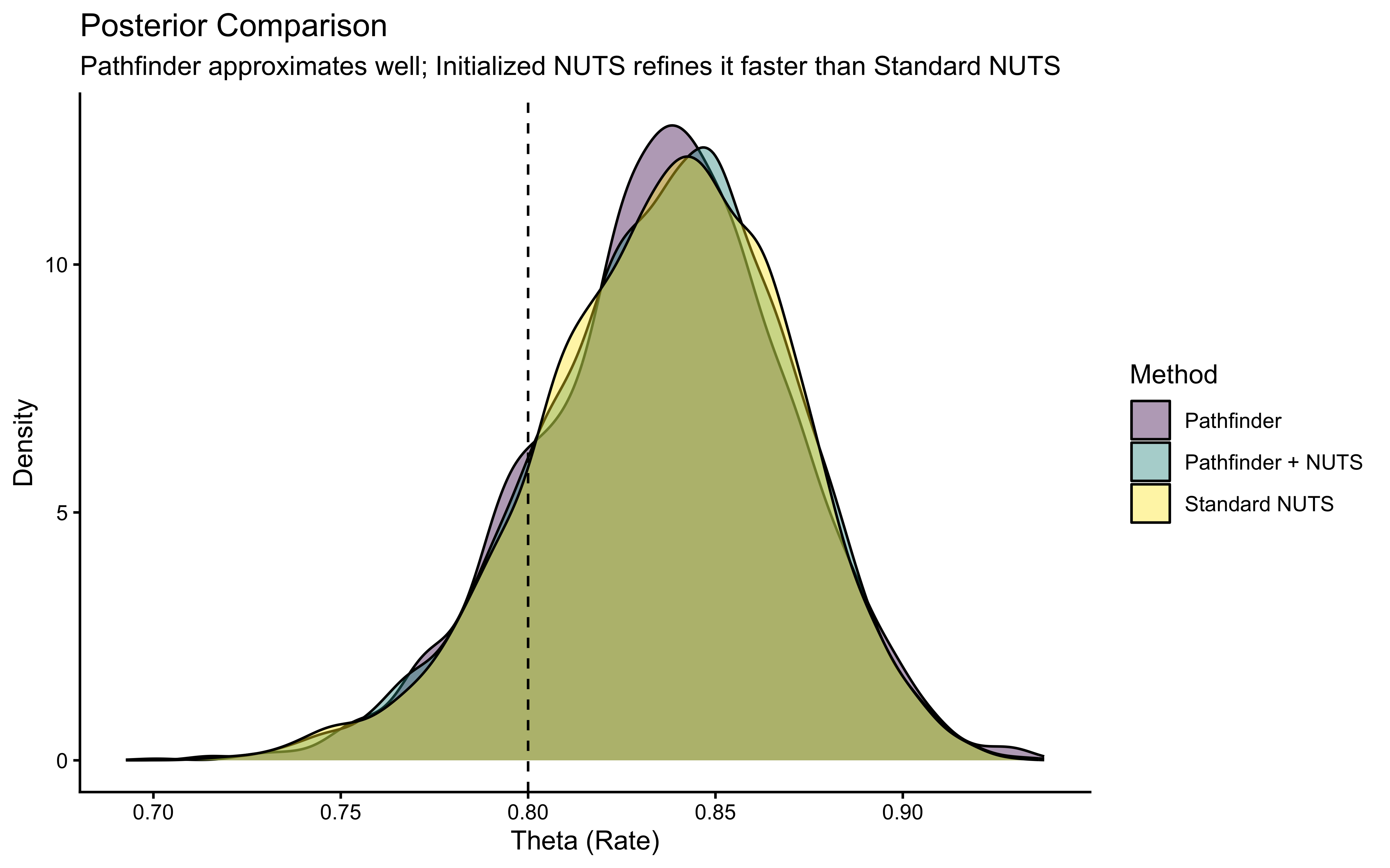## Bonus content: Benchmarking NUTS, Pathfinder, and Pathfinder-initialized NUTS# We will compare three methods:# 1. Standard NUTS (MCMC)# 2. Pathfinder (Variational Inference)# 3. NUTS initialized with Pathfinder# Define file paths for all three modelsfile_nuts_std <-here("simmodels", "ch06_benchmark_nuts_std.rds")file_pathfinder <-here("simmodels", "ch06_benchmark_pathfinder.rds")file_nuts_init <-here("simmodels", "ch06_benchmark_nuts_init.rds")stan_file_logit <- here::here("stan", "ch06_SimpleBernoulli_logodds.stan")mod <-cmdstan_model( stan_file_logit, cpp_options =list(stan_threads =FALSE),stanc_options =list("O1"))# --- 1. Run Standard NUTS (Baseline) ---if (regenerate_simulations ||!file.exists(file_nuts_std)) {cat("Running Standard NUTS...\n") fit_nuts_std <- mod$sample(data = data_for_stan,seed =123,chains =4,parallel_chains =4,iter_warmup =1000, # Standard warmupiter_sampling =2000,refresh =0 ) fit_nuts_std$save_object(file_nuts_std)} else { fit_nuts_std <-readRDS(file_nuts_std)}# --- 2. Run Pathfinder ---if (regenerate_simulations ||!file.exists(file_pathfinder)) {cat("Running Pathfinder...\n") fit_pathfinder <- mod$pathfinder(data = data_for_stan,seed =123,draws =4000, num_paths =4,single_path_draws =1000,history_size =50 ) fit_pathfinder$save_object(file_pathfinder)} else { fit_pathfinder <-readRDS(file_pathfinder)}# --- 3. Run NUTS initialized with Pathfinder ---if (regenerate_simulations ||!file.exists(file_nuts_init)) {cat("Running NUTS initialized with Pathfinder...\n") fit_nuts_init <- mod$sample(data = data_for_stan,seed =123,chains =4,parallel_chains =4,iter_warmup =500, # Reduced warmup allowed by better init!iter_sampling =2000,init = fit_pathfinder, # <--- The Magic Linerefresh =0 ) fit_nuts_init$save_object(file_nuts_init)} else { fit_nuts_init <-readRDS(file_nuts_init)}# --- COMPARISON: TIMING ---# Extract execution times (in seconds)# Note: $time()$total gives the wall clock time for the computationtime_nuts_std <- fit_nuts_std$time()$totaltime_pathfinder <- fit_pathfinder$time()$total# For the initialized model, the total workflow time is Pathfinder + NUTStime_nuts_init <- time_pathfinder + fit_nuts_init$time()$total # Create a summary tablebenchmarks <-tibble(Method =c("Standard NUTS", "Pathfinder", "Pathfinder + NUTS"),Time_Sec =c(time_nuts_std, time_pathfinder, time_nuts_init),Speedup_vs_Std = time_nuts_std / Time_Sec)print(benchmarks)