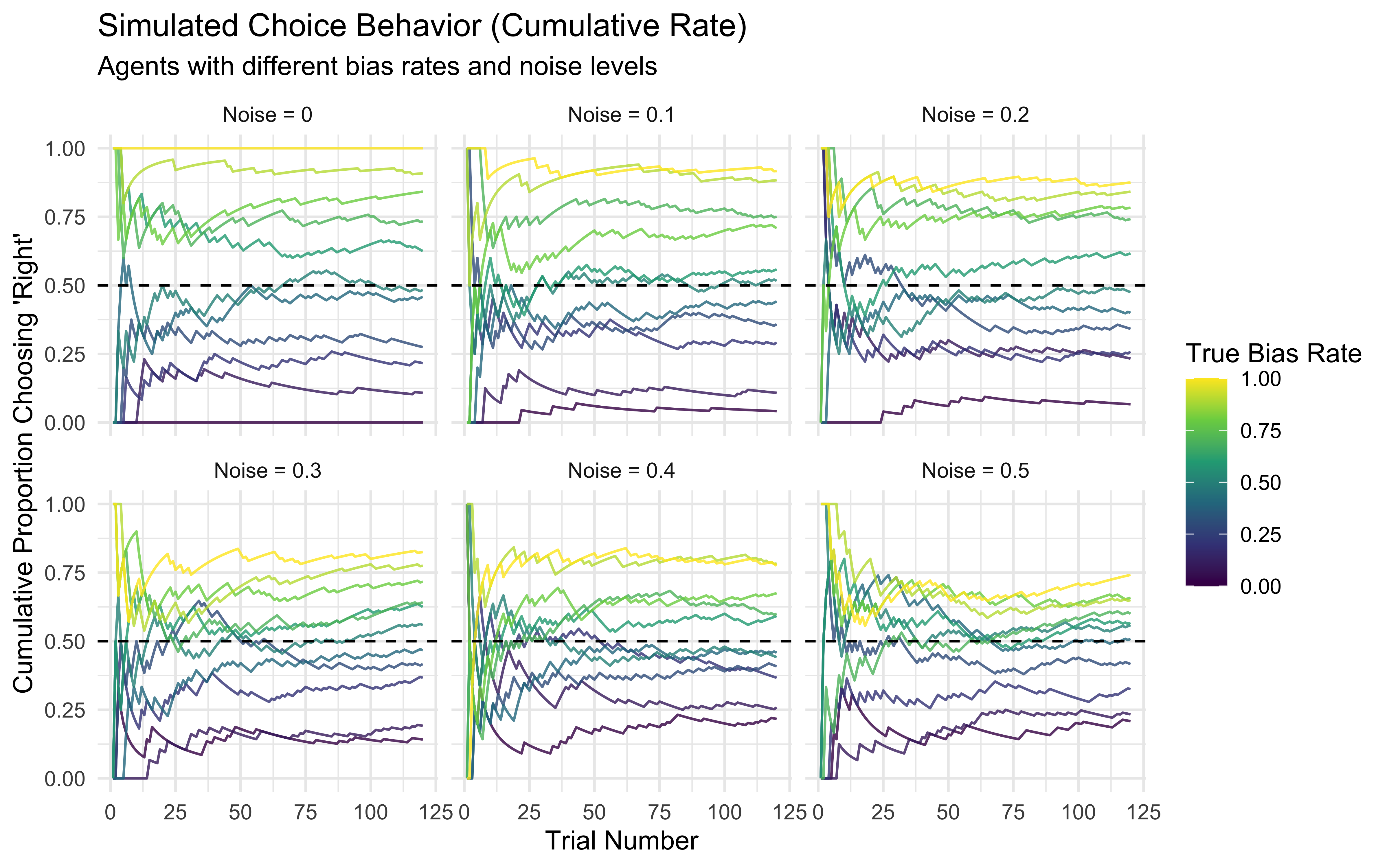 # --- Visualize Simulated Data ---# Plot cumulative rate, faceted by noise levelp1 <-ggplot(d, aes(x = trial, y = cumulative_rate, group = true_rate, color = true_rate)) +geom_line(alpha =0.8) +geom_hline(yintercept =0.5, linetype ="dashed") +scale_color_viridis_c() +# Use perceptually uniform color scalefacet_wrap(~paste("Noise =", true_noise)) +# Facet by noise levellabs(title ="Simulated Choice Behavior (Cumulative Rate)",subtitle ="Agents with different bias rates and noise levels",x ="Trial Number",y ="Cumulative Proportion Choosing 'Right'",color ="True Bias Rate" ) +theme_minimal() +ylim(0, 1)print(p1)