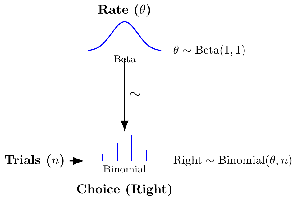 Let’s use Stan to estimate the underlying bias rate (which we’ll call theta in the model) from just the sequence of choices (h) generated by one of our simulated agents. This model is represented in the