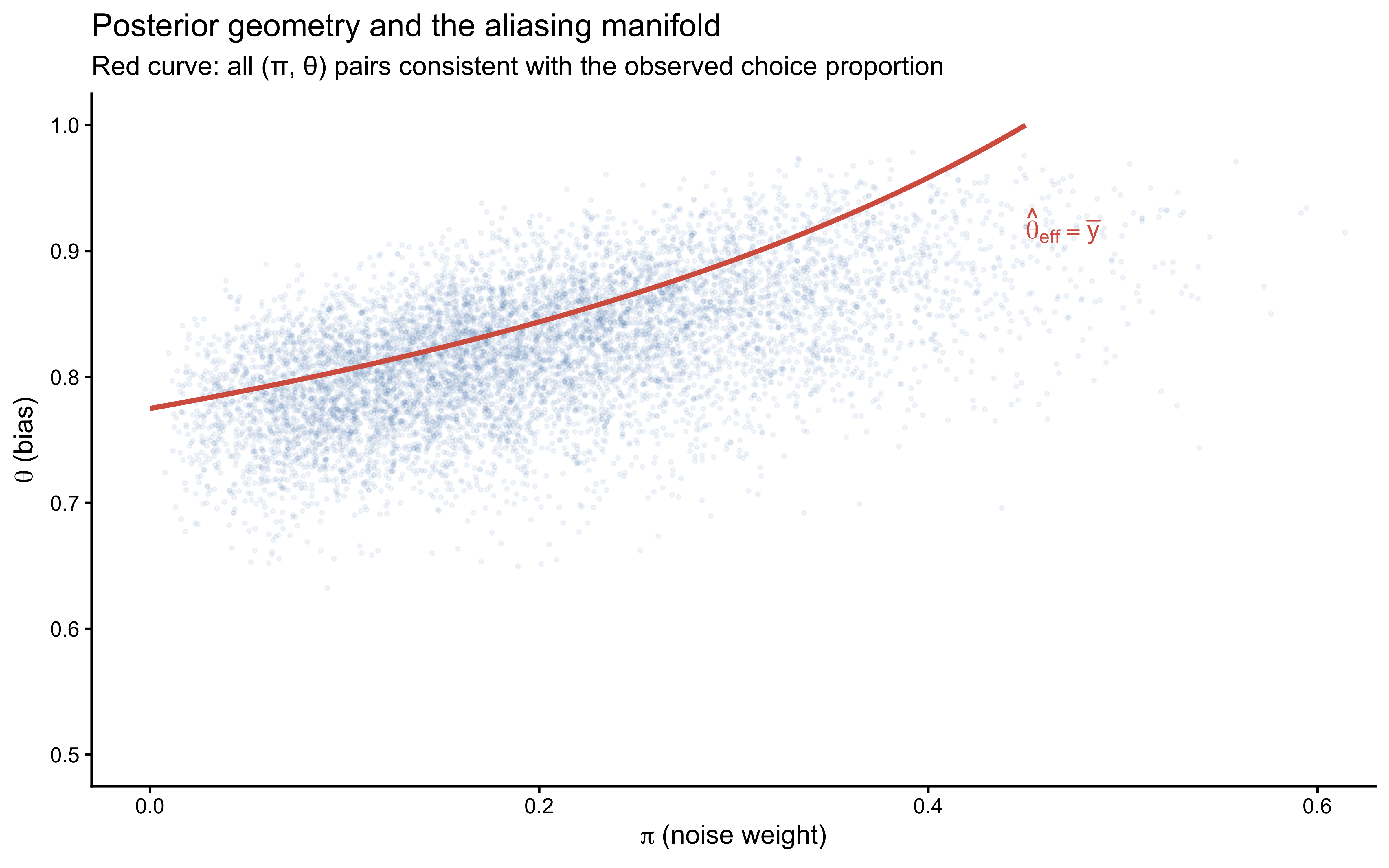 draws_prob <-as_draws_df(fit_single$draws()) |> dplyr::select(theta, pi_hat)obs_prop <-mean(data$h)# Aliasing manifold: all (theta, pi) consistent with observed proportionpi_grid <-seq(0, 0.95, by =0.002)theta_mani <- (obs_prop -0.5* pi_grid) / (1- pi_grid)manifold <-tibble(pi_hat = pi_grid, theta = theta_mani) |> dplyr::filter(theta >=0, theta <=1)ggplot(draws_prob, aes(x = pi_hat, y = theta)) +geom_point(alpha =0.06, size =0.5, colour ="#2166AC") +geom_line(data = manifold, colour ="#D6604D", linewidth =1.0) +annotate("text", x =0.45, y =0.92, colour ="#D6604D", hjust =0,label =expression(hat(theta)[eff] ==bar(y))) +labs(title ="Posterior geometry and the aliasing manifold",subtitle ="Red curve: all (π, θ) pairs consistent with the observed choice proportion",x =expression(pi ~"(noise weight)"),y =expression(theta ~"(bias)") ) +coord_cartesian(xlim =c(0, 0.6), ylim =c(0.5, 1.0))