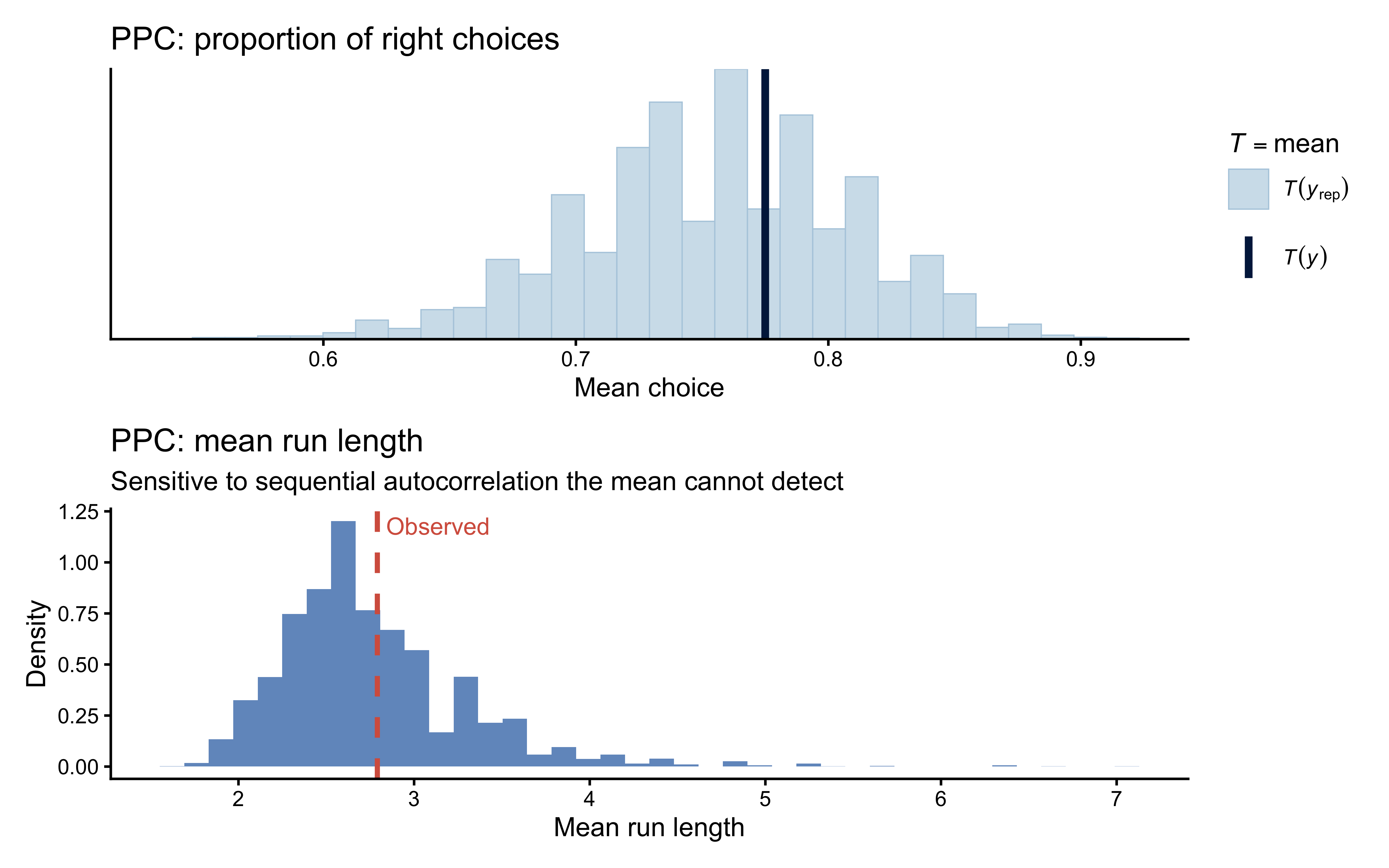# S x n matrix of posterior predictive choices (0/1)yrep <- fit_single$draws("pred_choice", format ="matrix")y <-as.integer(data$h)# PPC 1: proportion of "1" choicesp_mean <- bayesplot::ppc_stat(y = y,yrep = yrep,stat ="mean") +labs(title ="PPC: proportion of right choices", x ="Mean choice")# PPC 2: mean run length — sensitive to serial structureobs_run <-mean(rle(y)$lengths)pred_run <-apply(yrep, 1, function(x) mean(rle(x)$lengths))p_run <-ggplot(tibble(run = pred_run), aes(x = run)) +geom_histogram(aes(y =after_stat(density)),bins =40, fill ="#2166AC", alpha =0.7) +geom_vline(xintercept = obs_run, colour ="#D6604D",linewidth =1.0, linetype ="dashed") +annotate("text", x = obs_run +0.05, y =Inf, vjust =1.5,label ="Observed", colour ="#D6604D", size =3.5, hjust =0) +labs(title ="PPC: mean run length",subtitle ="Sensitive to sequential autocorrelation the mean cannot detect",x ="Mean run length", y ="Density")p_mean / p_run