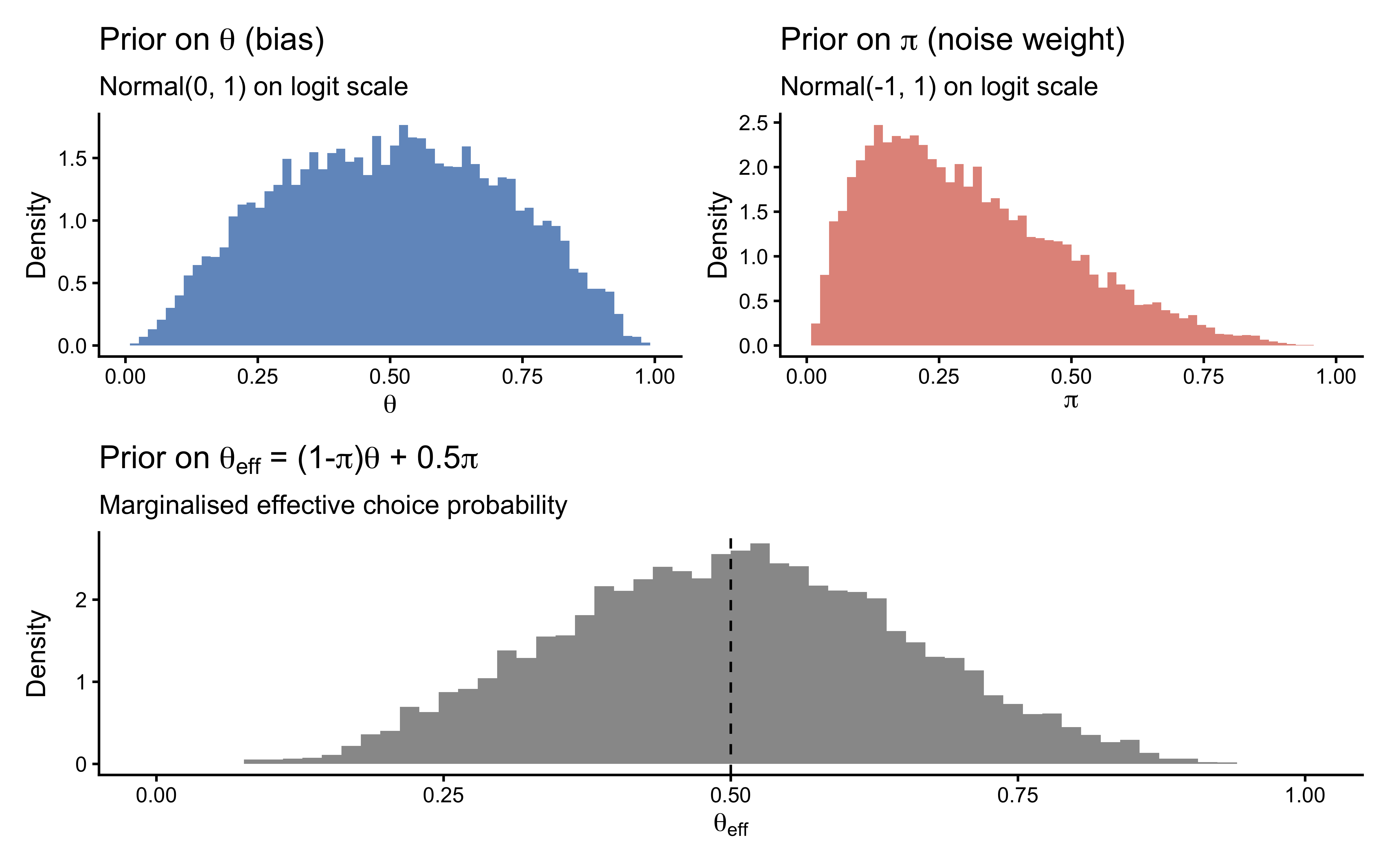 set.seed(8)n_prior <-10000prior_df <-tibble(alpha =rnorm(n_prior, 0, 1),nu =rnorm(n_prior, -1, 1),theta =plogis(alpha),pi_noise =plogis(nu),# Marginalised effective probability of choosing "right"theta_eff = (1-plogis(nu)) *plogis(alpha) +0.5*plogis(nu))p_bias <-ggplot(prior_df, aes(x = theta)) +geom_histogram(aes(y =after_stat(density)),bins =60, fill ="#2166AC", alpha =0.7) +labs(title =expression("Prior on "* theta *" (bias)"),subtitle ="Normal(0, 1) on logit scale",x =expression(theta), y ="Density") +scale_x_continuous(limits =c(0, 1))p_noise <-ggplot(prior_df, aes(x = pi_noise)) +geom_histogram(aes(y =after_stat(density)),bins =60, fill ="#D6604D", alpha =0.7) +labs(title =expression("Prior on "* pi *" (noise weight)"),subtitle ="Normal(-1, 1) on logit scale",x =expression(pi), y ="Density") +scale_x_continuous(limits =c(0, 1))p_eff <-ggplot(prior_df, aes(x = theta_eff)) +geom_histogram(aes(y =after_stat(density)),bins =60, fill ="grey40", alpha =0.7) +geom_vline(xintercept =0.5, linetype ="dashed", colour ="black") +labs(title =expression("Prior on "* theta[eff] *" = (1-"* pi *")"* theta *" + 0.5"* pi),subtitle ="Marginalised effective choice probability",x =expression(theta[eff]), y ="Density") +scale_x_continuous(limits =c(0, 1))(p_bias + p_noise) / p_eff