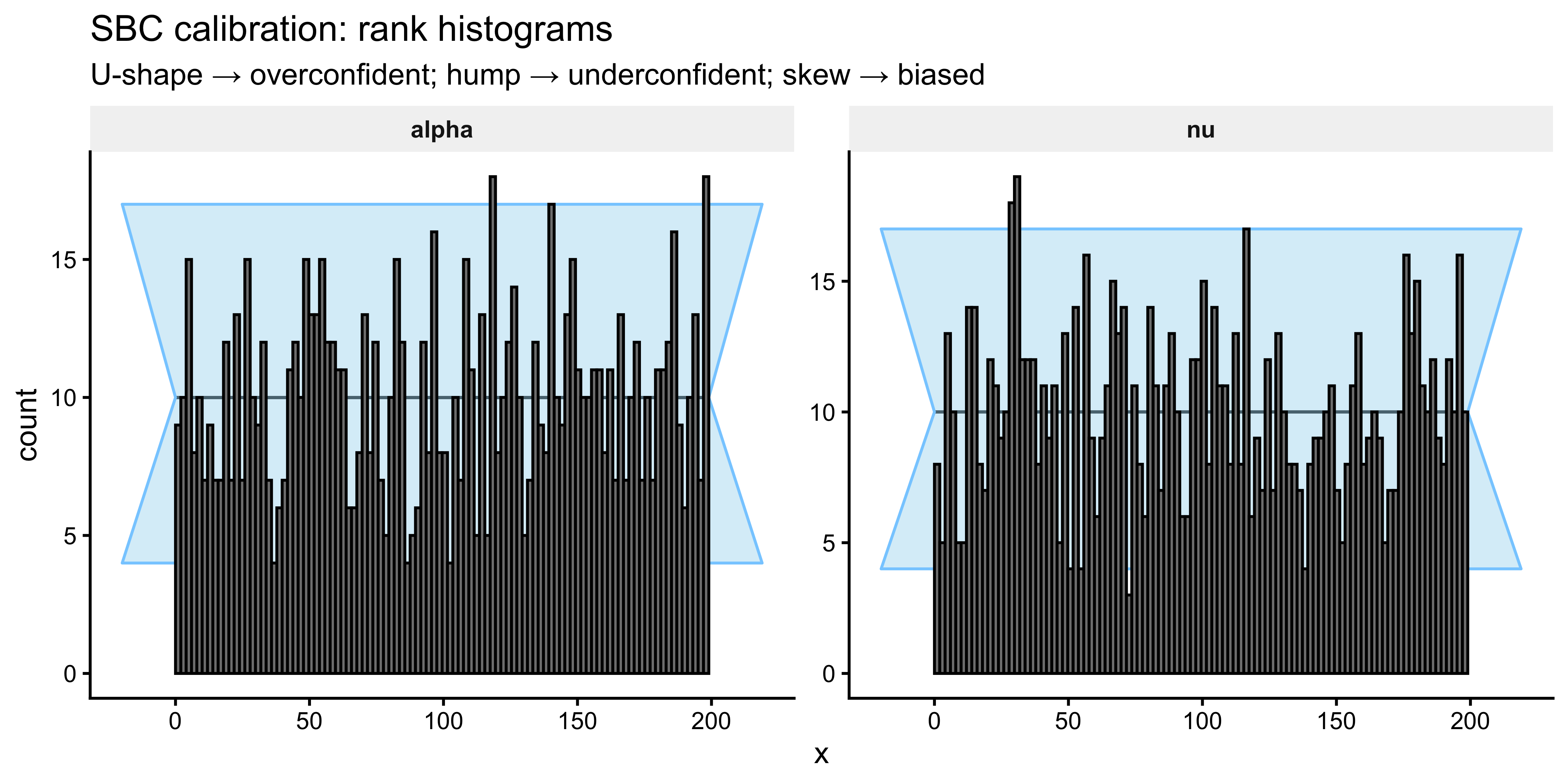 sbc_file <-"simmodels/ch09_sbc_results.RDS"if (regenerate_simulations ||!file.exists(sbc_file)) { future::plan(future::multisession, workers =max(1, parallel::detectCores() -2))# S = 1000 certifies the rank statistic at the 95 % level.# For development, reduce to 200. sbc_datasets <- SBC::generate_datasets(sbc_generator, n_sims =1000) sbc_results <- SBC::compute_SBC(sbc_datasets, sbc_backend) future::plan(future::sequential)saveRDS(sbc_results, sbc_file)} else { sbc_results <-readRDS(sbc_file)}