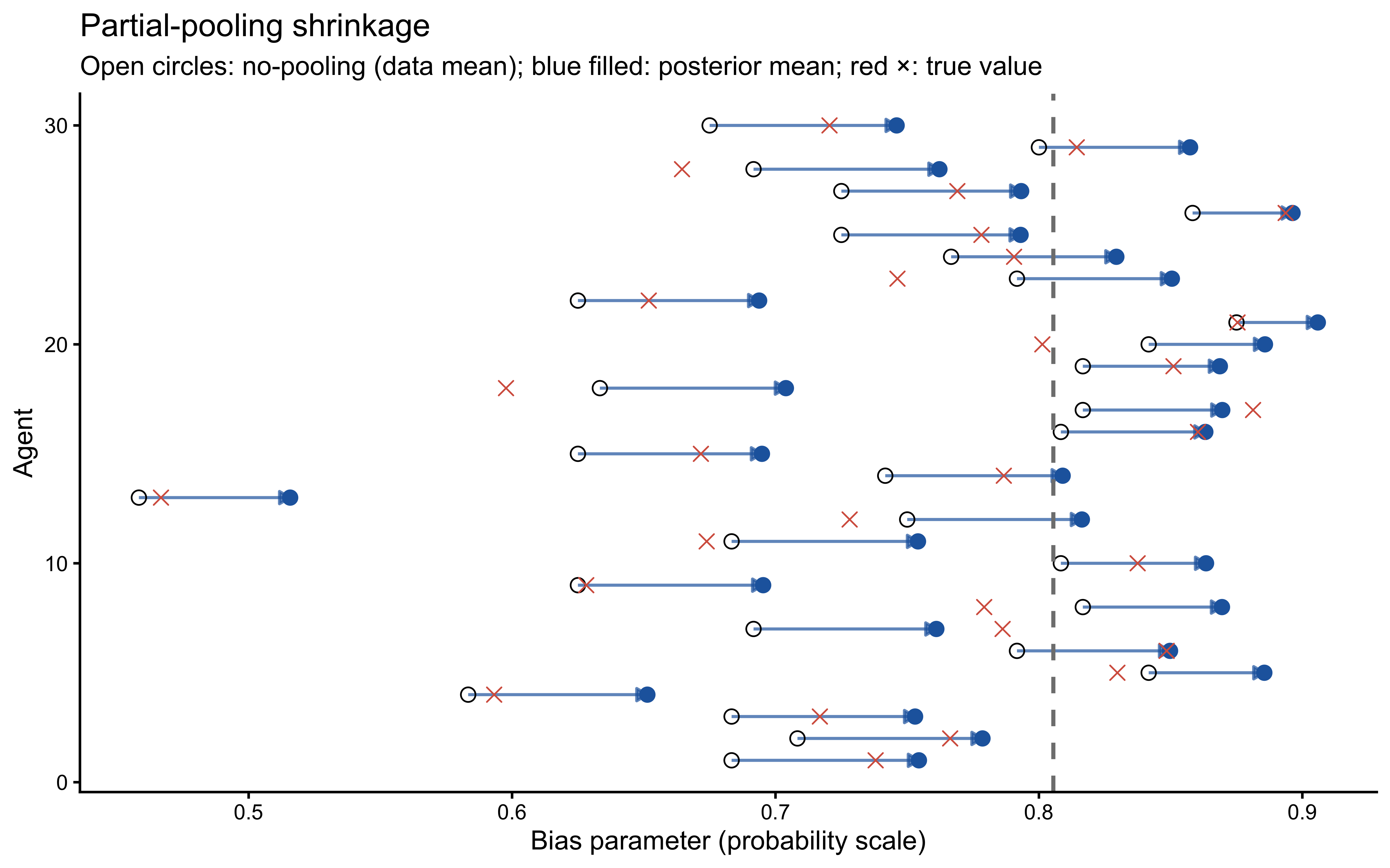 Agents whose raw data means are far from the group mean are pulled back more strongly — they are more likely to be statistical outliers than genuinely extreme individuals. Note also that the posterior means are systematically closer to the true values (red crosses) than the raw data means, confirming that partial pooling improves estimation accuracy.