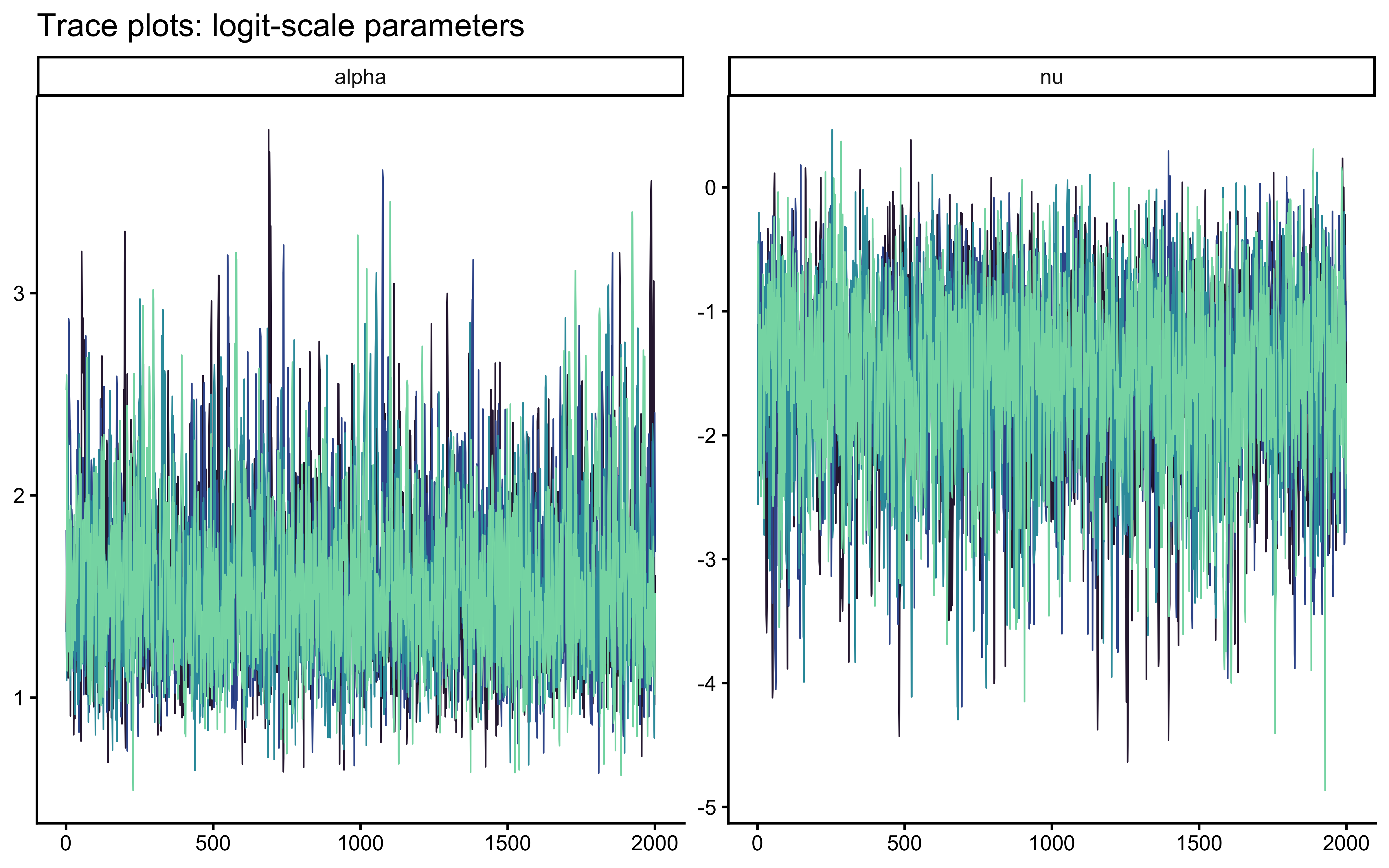 # Trace plots for the two sampled parametersmcmc_trace(draws_single, pars =c("alpha", "nu")) +ggtitle("Trace plots: logit-scale parameters") +scale_colour_viridis_d(option ="mako", begin =0.15, end =0.85, guide ="none")