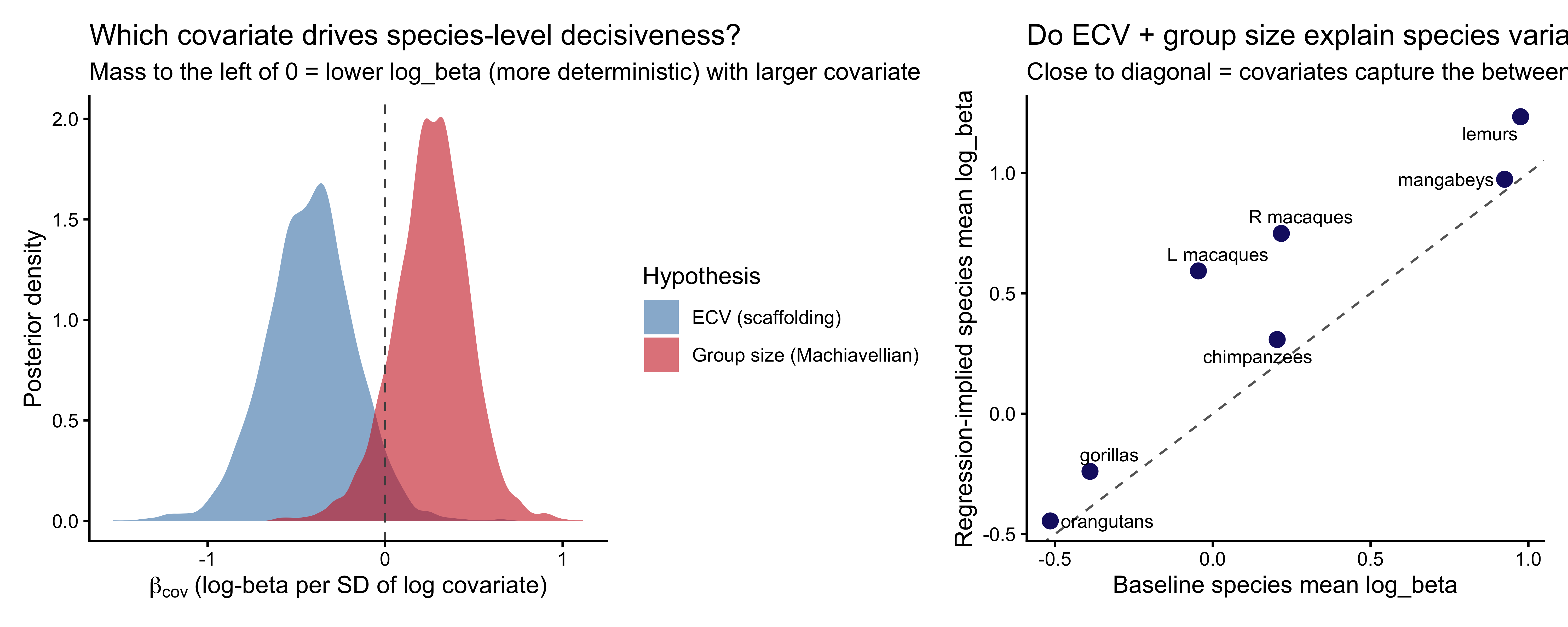 coef_draws <- fit_reg$draws(c("b_ecv","b_group","alpha_logbeta","tau_sp"),format ="df") |>as_tibble()p_coef <- coef_draws |> dplyr::select(b_ecv, b_group) |>pivot_longer(everything(), names_to ="coef", values_to ="value") |>ggplot(aes(x = value, fill = coef)) +geom_density(alpha =0.6, color =NA) +geom_vline(xintercept =0, linetype ="dashed", color ="gray30") +scale_fill_manual(values =c("b_ecv"="steelblue", "b_group"="firebrick3"),labels =c("b_ecv"="ECV (scaffolding)","b_group"="Group size (Machiavellian)")) +labs(x =expression(beta[cov]~"(log-beta per SD of log covariate)"),y ="Posterior density",fill ="Hypothesis",title ="Which covariate drives species-level decisiveness?",subtitle ="Mass to the left of 0 = lower log_beta (more deterministic) with larger covariate")# Compare implied mu_log_beta from regression vs. baseline hier fitbaseline_mu <- fit_hier$draws("mu_log_beta", format ="df") |>as_tibble() |>summarize(across(starts_with("mu_log_beta"), mean)) |>pivot_longer(everything(), names_to ="param", values_to ="baseline_mean") |>mutate(species_id =as.integer(str_extract(param, "\\d+"))) |>left_join(species_cov |> dplyr::select(species_id, species), by ="species_id")reg_mu <- fit_reg$draws("mu_log_beta", format ="df") |>as_tibble() |>summarize(across(starts_with("mu_log_beta"), mean)) |>pivot_longer(everything(), names_to ="param", values_to ="reg_mean") |>mutate(species_id =as.integer(str_extract(param, "\\d+")))compare_df <- baseline_mu |>left_join(reg_mu, by ="species_id")p_compare <-ggplot(compare_df, aes(x = baseline_mean, y = reg_mean, label = species)) +geom_abline(slope =1, intercept =0, linetype ="dashed", color ="gray40") +geom_point(size =3, color ="midnightblue") + ggrepel::geom_text_repel(size =3) +labs(x ="Baseline species mean log_beta",y ="Regression-implied species mean log_beta",title ="Do ECV + group size explain species variation?",subtitle ="Close to diagonal = covariates capture the between-species signal")p_coef + p_compare +plot_layout(widths =c(1, 1))