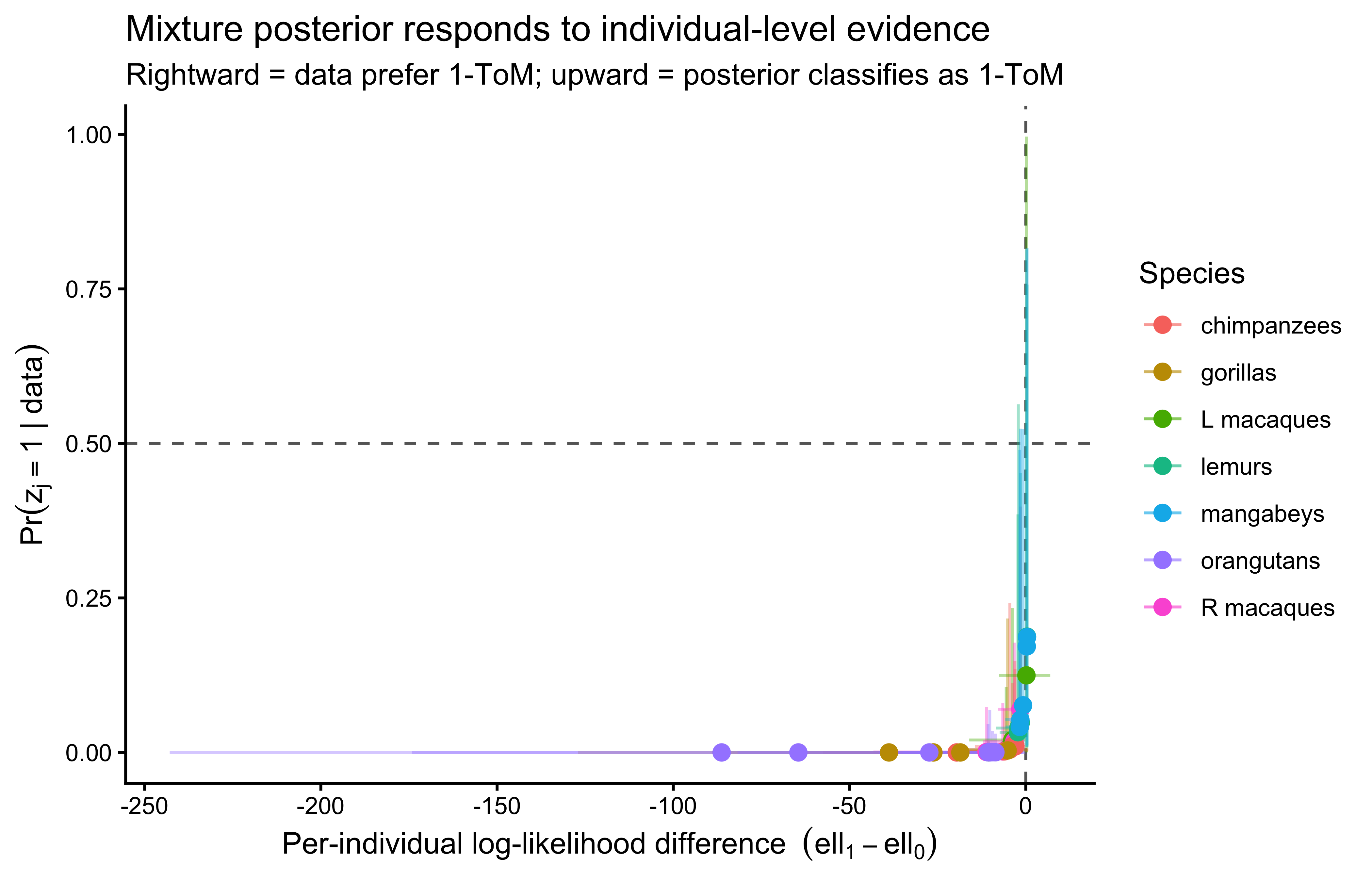 Per-individual posterior architecture probability (y) vs. per-individual 1-ToM minus 0-ToM log-likelihood difference (x), both extracted from the mixture fit. Posterior-mean points, colored by species. A monotone rising curve confirms the mixture is actually responsive to the structural evidence in each individual’s choices; flat clouds would indicate the posterior is driven entirely by the species-level prior.