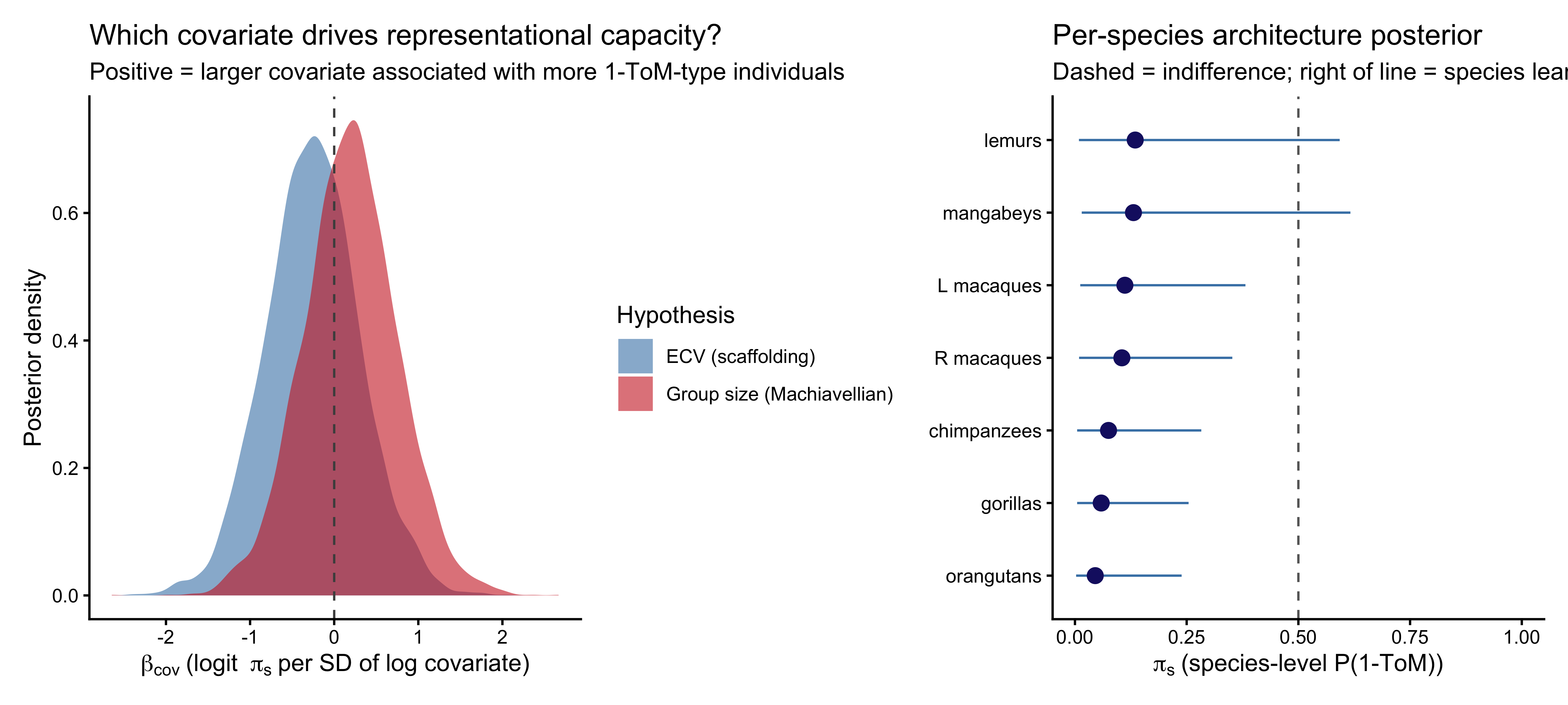 mix_coef <- fit_mix$draws(c("alpha_pi","b_ecv","b_group","tau_sp_pi"),format ="df") |>as_tibble()p_mix_coef <- mix_coef |> dplyr::select(b_ecv, b_group) |>pivot_longer(everything(), names_to ="coef", values_to ="value") |>ggplot(aes(x = value, fill = coef)) +geom_density(alpha =0.6, color =NA) +geom_vline(xintercept =0, linetype ="dashed", color ="gray30") +scale_fill_manual(values =c("b_ecv"="steelblue","b_group"="firebrick3"),labels =c("b_ecv"="ECV (scaffolding)","b_group"="Group size (Machiavellian)")) +labs(x =expression(beta[cov]~"(logit "~pi[s]~"per SD of log covariate)"),y ="Posterior density", fill ="Hypothesis",title ="Which covariate drives representational capacity?",subtitle ="Positive = larger covariate associated with more 1-ToM-type individuals")pi_s_summary <- fit_mix$draws("pi_s", format ="df") |>as_tibble() |> dplyr::select(starts_with("pi_s")) |>pivot_longer(everything(), names_to ="param", values_to ="value") |>mutate(species_id =as.integer(str_extract(param, "\\d+"))) |>group_by(species_id) |>summarize(med =median(value),lo =quantile(value, 0.05),hi =quantile(value, 0.95),.groups ="drop") |>left_join(species_cov |> dplyr::select(species_id, species),by ="species_id") |>arrange(med) |>mutate(species =factor(species, levels = species))p_pi_s <-ggplot(pi_s_summary, aes(x = med, y = species)) +geom_errorbarh(aes(xmin = lo, xmax = hi), height =0, color ="steelblue") +geom_point(size =3, color ="midnightblue") +geom_vline(xintercept =0.5, linetype ="dashed", color ="gray40") +scale_x_continuous(limits =c(0, 1)) +labs(x =expression(pi[s]~"(species-level P(1-ToM))"),y =NULL,title ="Per-species architecture posterior",subtitle ="Dashed = indifference; right of line = species leans 1-ToM")p_mix_coef + p_pi_s +plot_layout(widths =c(1, 1))