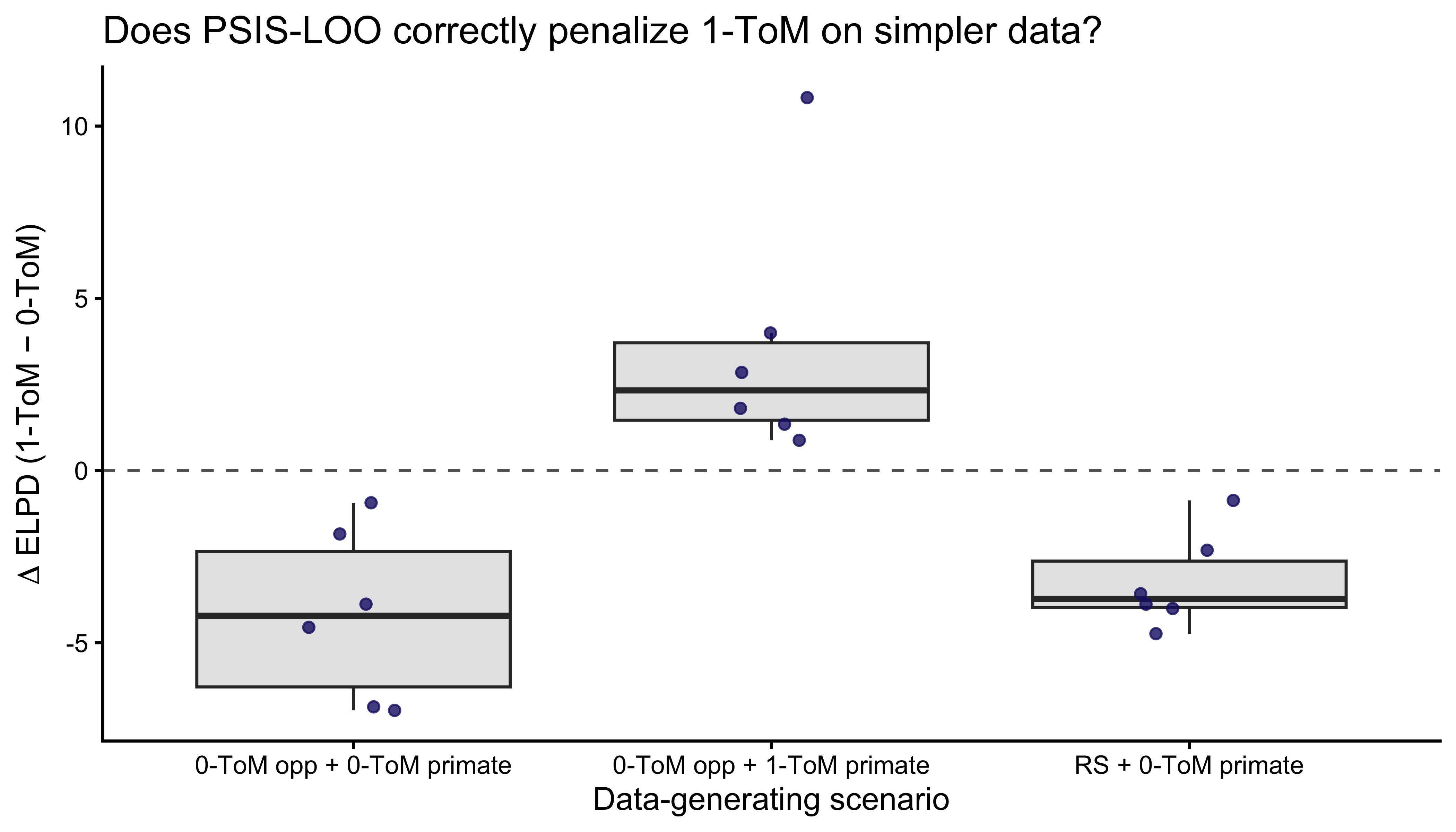ggplot(occam_res, aes(x = scenario, y = delta)) +geom_hline(yintercept =0, linetype ="dashed", color ="gray40") +geom_boxplot(outlier.shape =NA, fill ="gray90") +geom_jitter(width =0.12, alpha =0.8, color ="midnightblue") +scale_x_discrete(labels =c("RS_0tom"="RS + 0-ToM primate","0tom_0tom"="0-ToM opp + 0-ToM primate","0tom_1tom"="0-ToM opp + 1-ToM primate")) +labs(x ="Data-generating scenario",y =expression(Delta *" ELPD (1-ToM − 0-ToM)"),title ="Does PSIS-LOO correctly penalize 1-ToM on simpler data?")