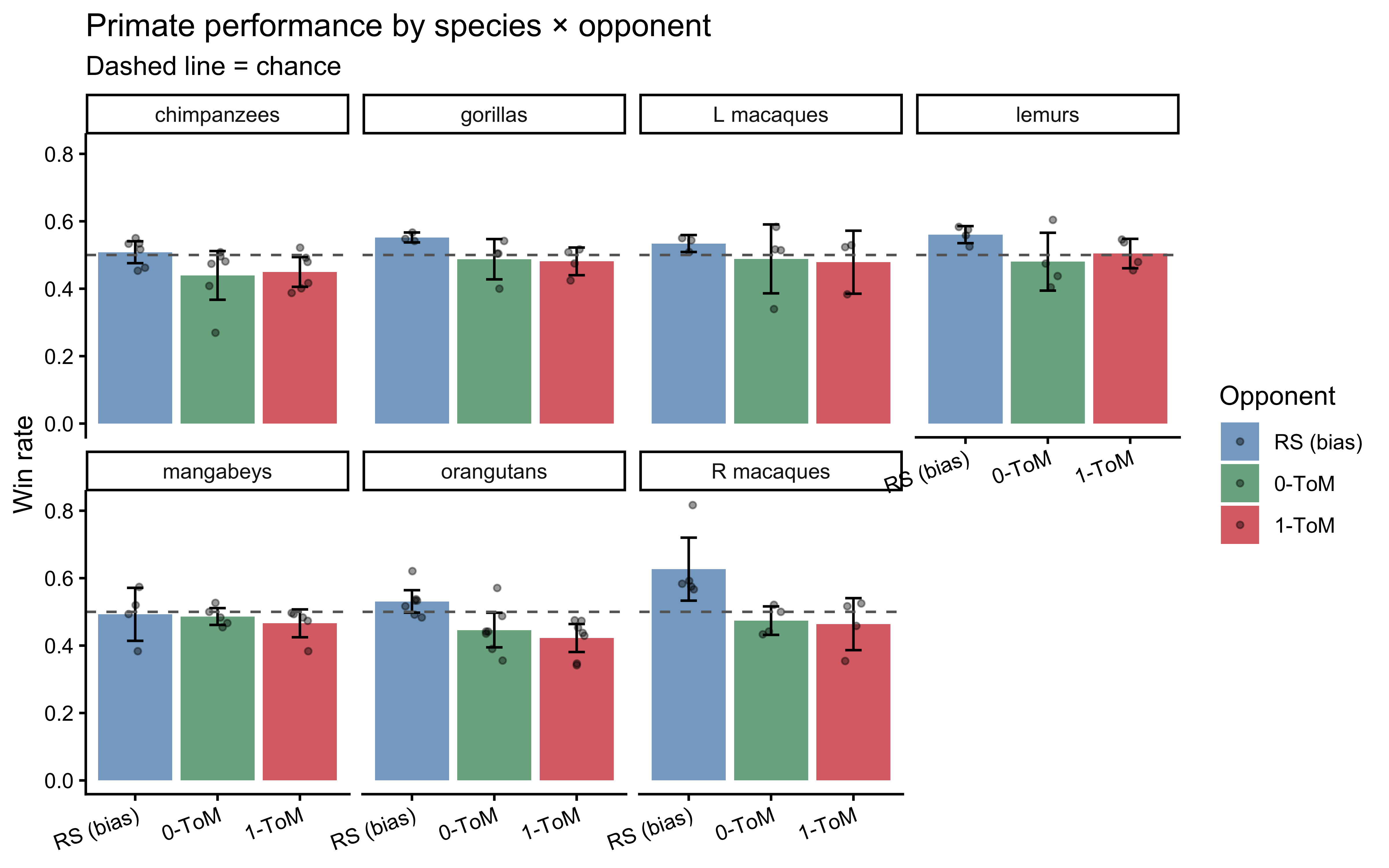 Two things are already visible. First, against the biased RS opponent most species clear chance, confirming they have grasped the choice-reward contingency. Second, against the two interactive opponents win rates cluster near or slightly below \(0.5\) — consistent with Devaine et al.’s (2017) interpretation that the primates have partially read the interaction as cooperative and that their mentalizing, if present, is directed at a different goal than winning. This is a useful early warning: performance alone cannot tell us whether an individual is mentalizing. That distinction has to come from the trial-by-trial structure of their choices — which is exactly what \(k\)-ToM lets us measure.