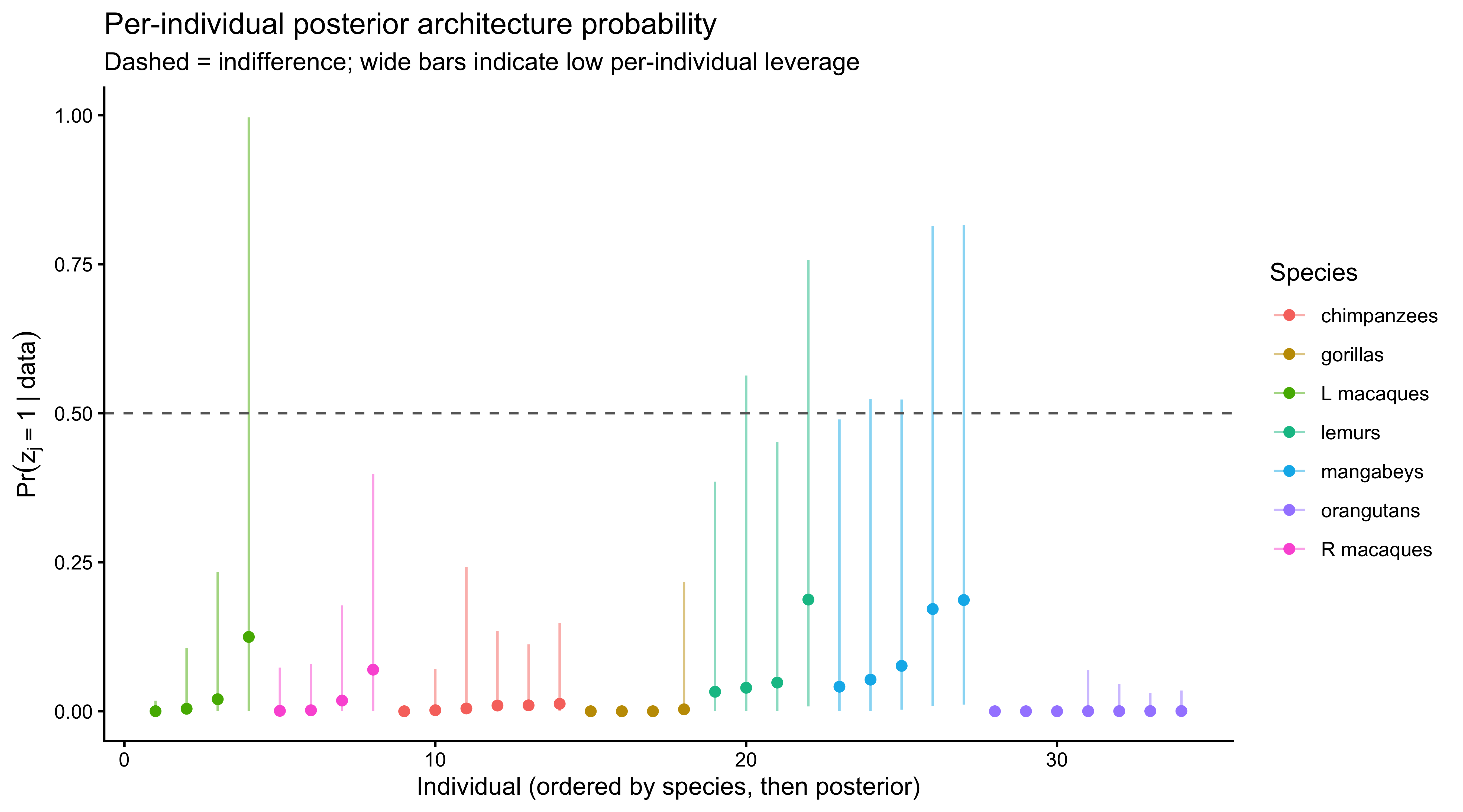 The mixture also delivers per-individual posterior probabilities \(\Pr(z_j = 1 \mid \text{data})\). Individuals whose data pull their probability away from the species prior are those whose choice sequences decisively fit one architecture over the other; those whose posteriors return to the species prior \(\pi_{s(j)}\) are predictively indistinguishable under the two models, consistent with the Occam’s-razor evidence that matching pennies has limited leverage at the single-individual scale.