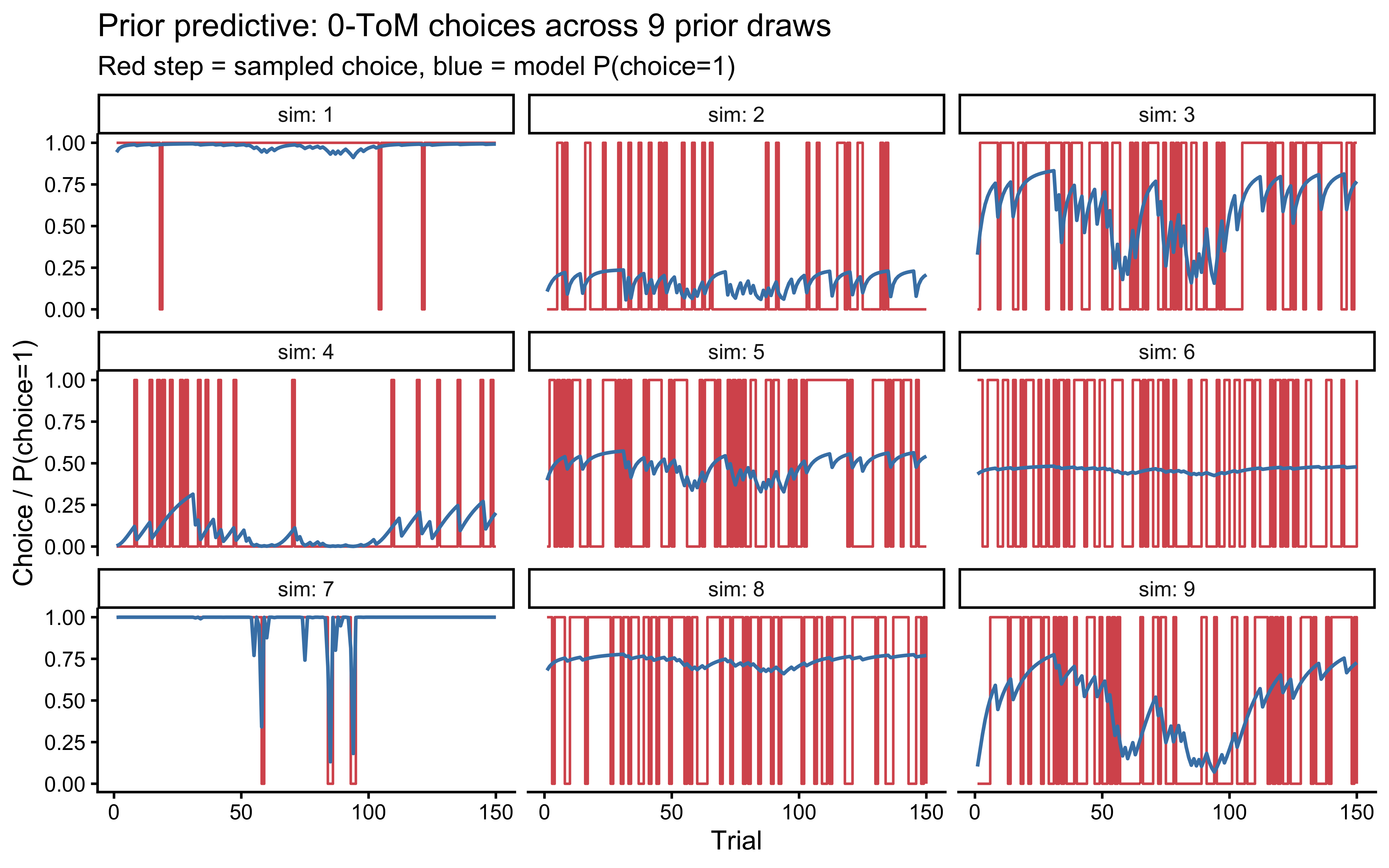 Prior predictive check for 0-ToM. Each panel shows one simulated agent against a 70/30 biased opponent. Priors should produce heterogeneous but non-pathological choice sequences.