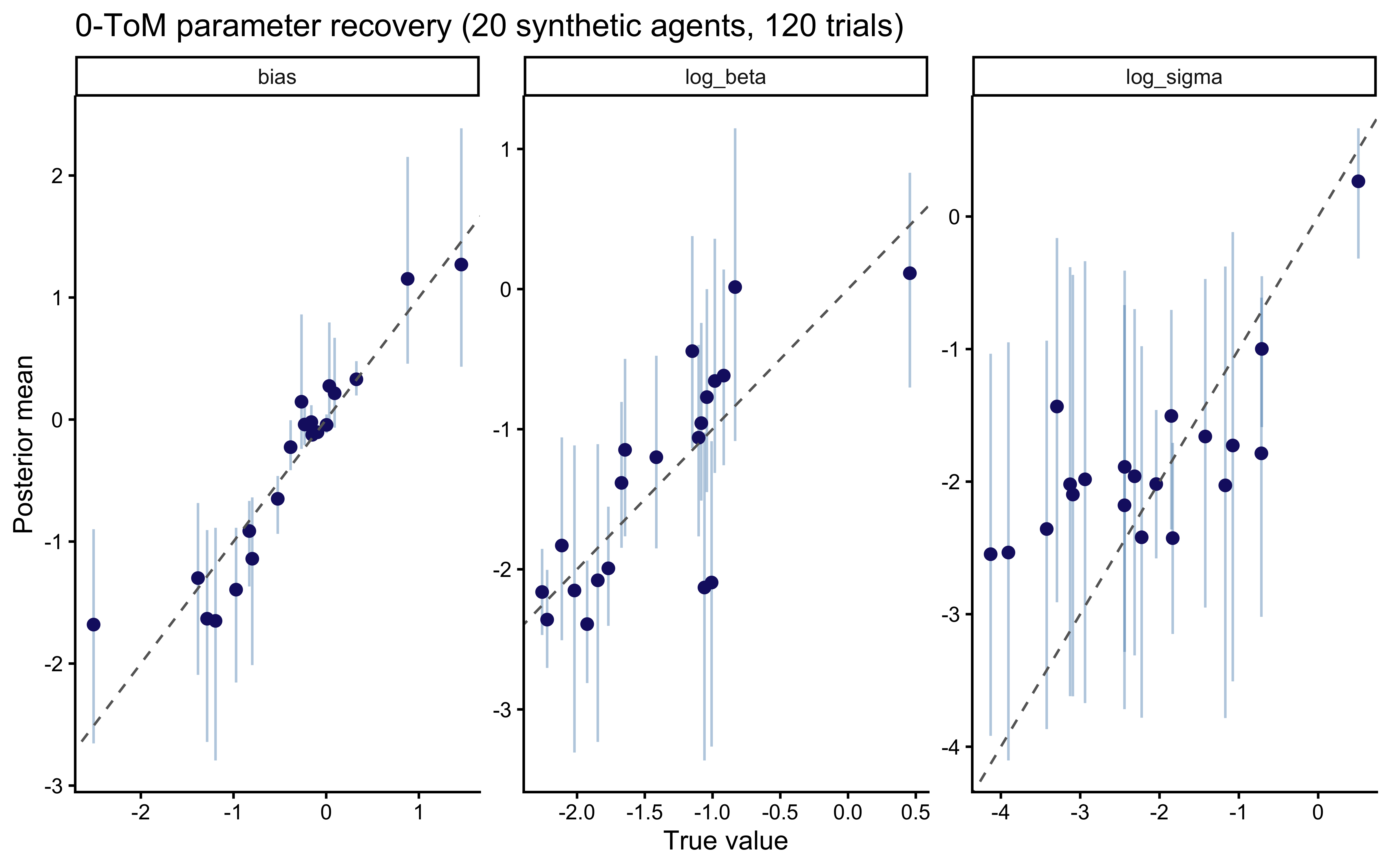 0-ToM parameter recovery. Points = posterior means, bars = 90% CIs, dashed line = identity. Recovery is clean for bias and log_beta; log_sigma is noisier with mild shrinkage to the prior at 120 trials — a design finding we will confirm under the more rigorous SBC next.