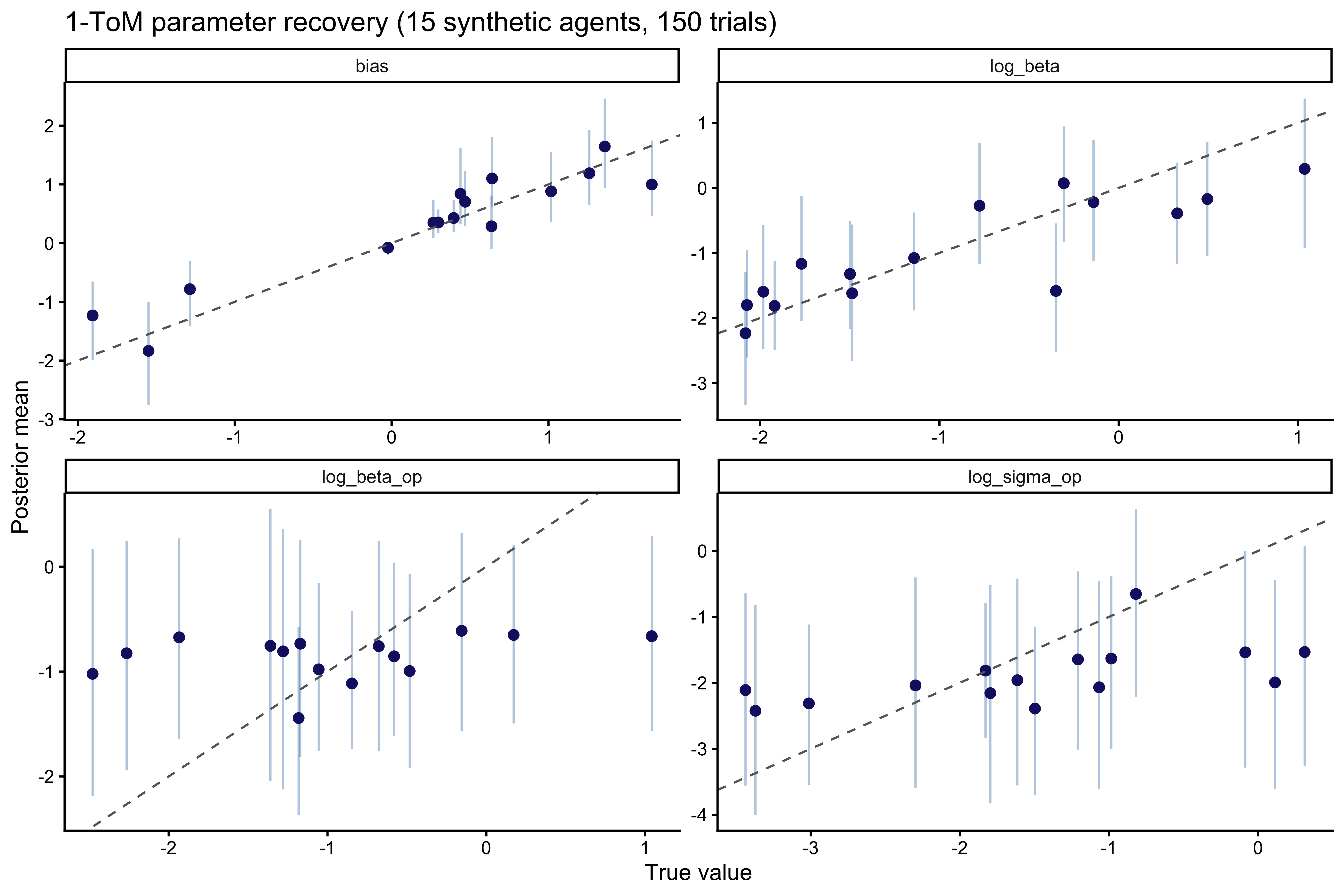 1-ToM parameter recovery. The agent’s own log_beta and bias are well recovered. The opponent-model parameters log_sigma_op and log_beta_op are noisier — they enter the likelihood only through the recursion, and a 150-trial sequence only weakly constrains them.