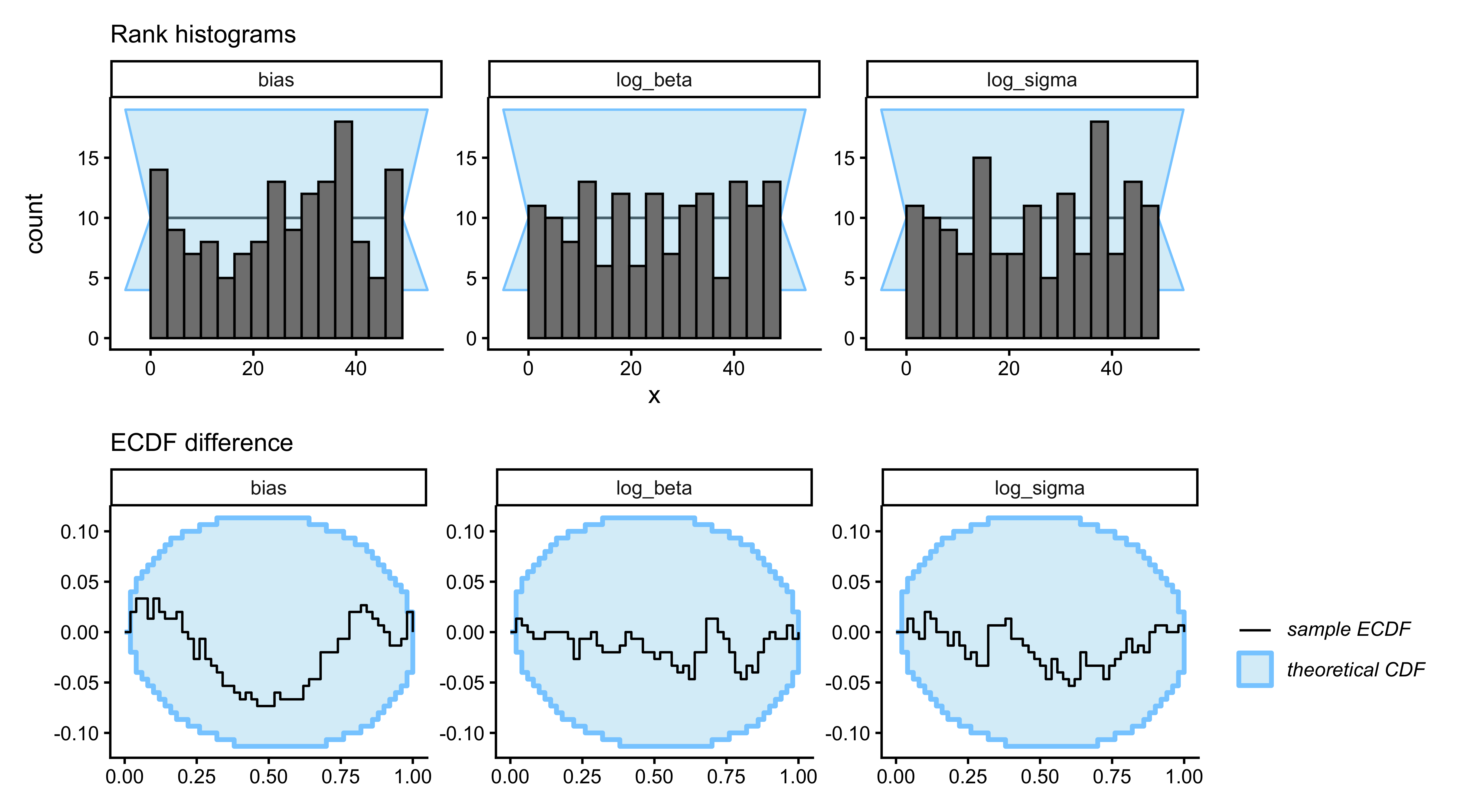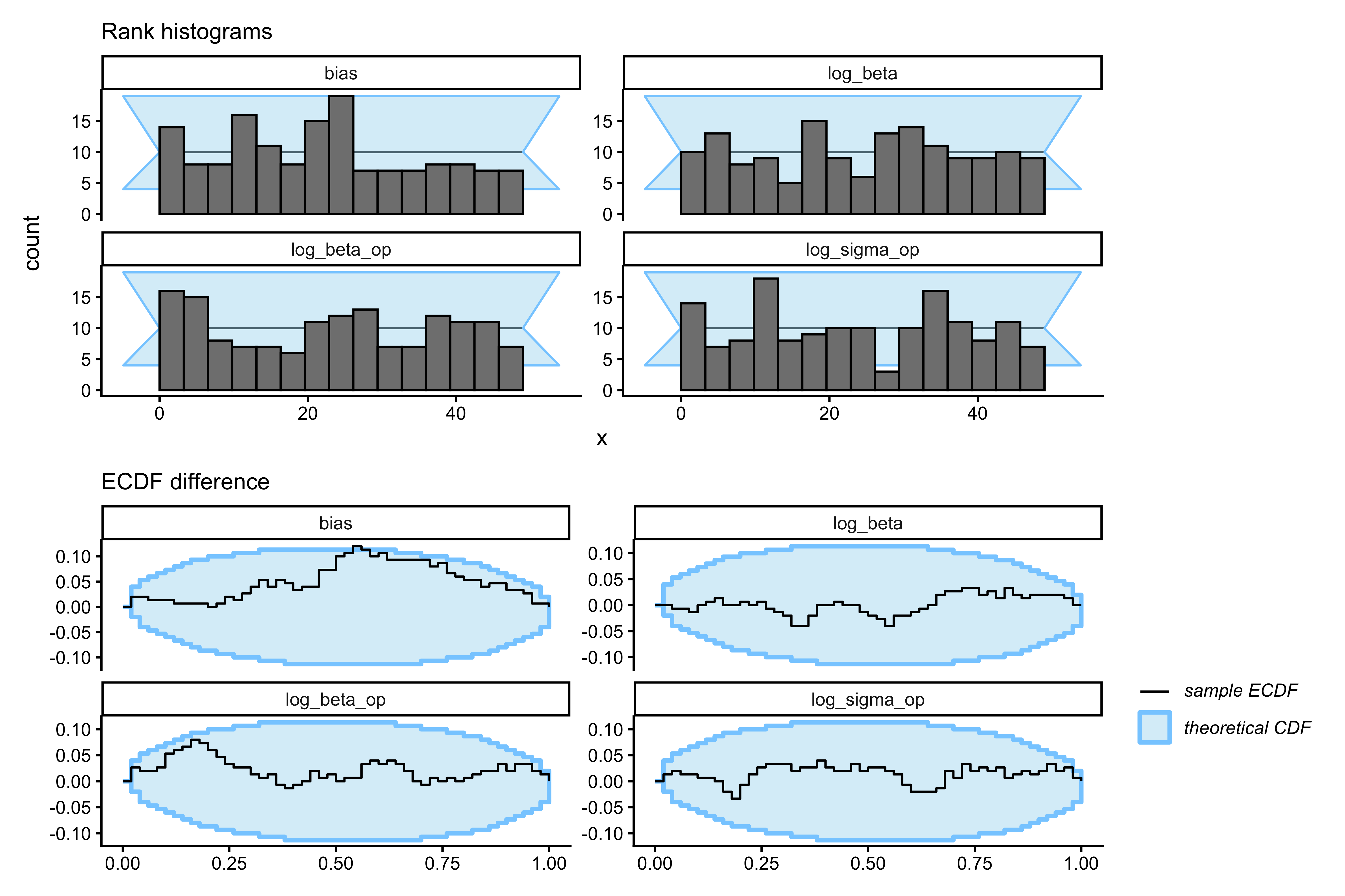 The pattern is exactly what we should expect from the theory. The agent’s own decision parameters (log_beta, bias) are identified directly from the choice likelihood and recover cleanly. The opponent-model parameters (log_sigma_op, log_beta_op) are identified only through the recursive belief update that feeds into \(\Delta V\), and their recovery is correspondingly weaker. But a single recovery study cannot say how weak — recovery evaluated at the prior mode can look fine even when the posterior is grossly miscalibrated elsewhere in parameter space. That is what SBC is for.