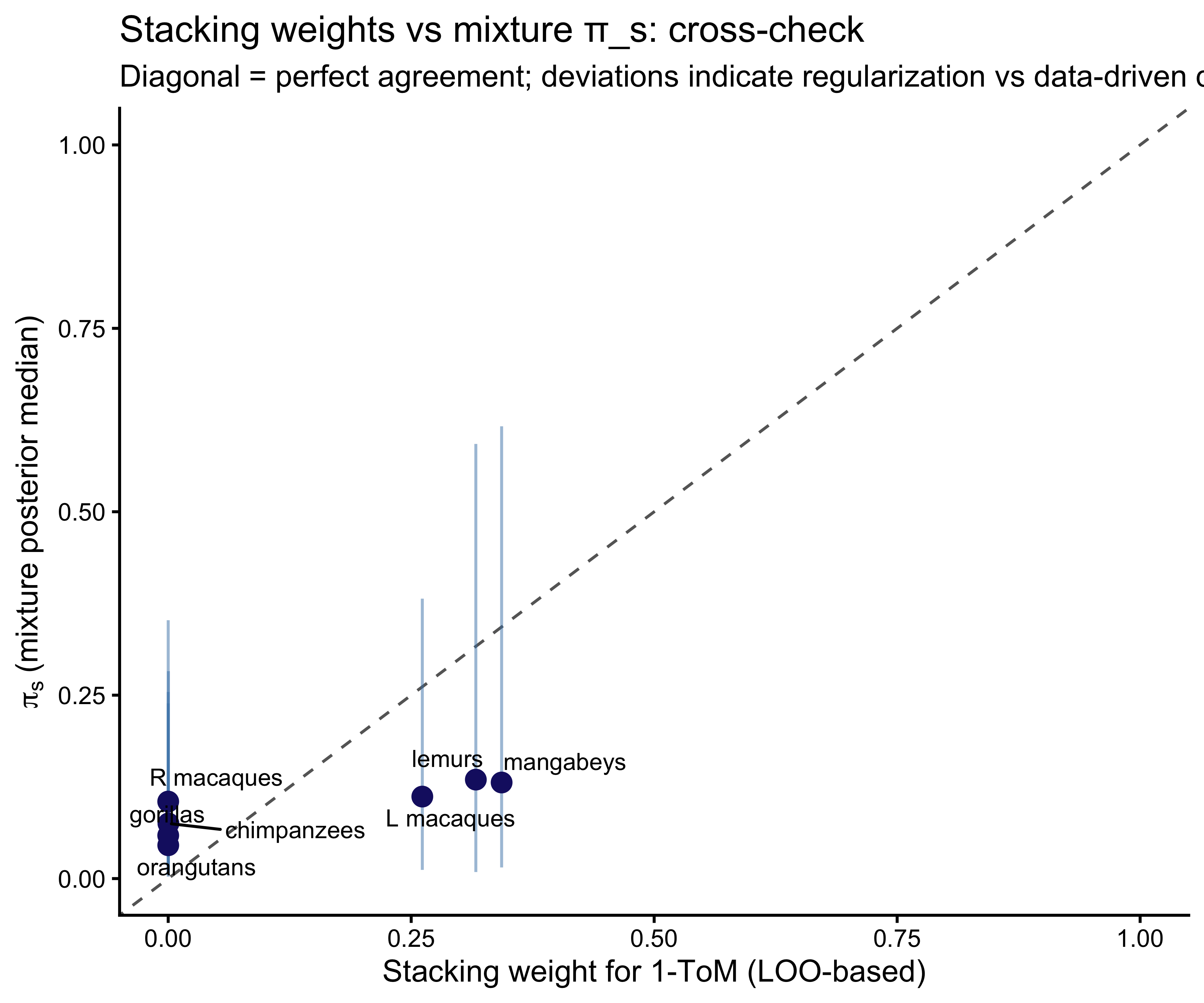 The mixture model delivered species-level architecture probabilities \(\pi_s\) as parameters, with full posterior propagation. As a methodological cross-check, we can compare those against species-level PSIS stacking weights computed from two separately-fit hierarchical models (a pure-0-ToM hier and a pure-1-ToM hier). The two estimators are answering related but formally distinct questions — \(\pi_s\) is a prior mixing proportion inside a joint generative model, while stacking weights are frequentist-flavored pseudo-BMA weights for out-of-sample predictive averaging — so exact agreement is not expected, but gross divergence would be concerning.