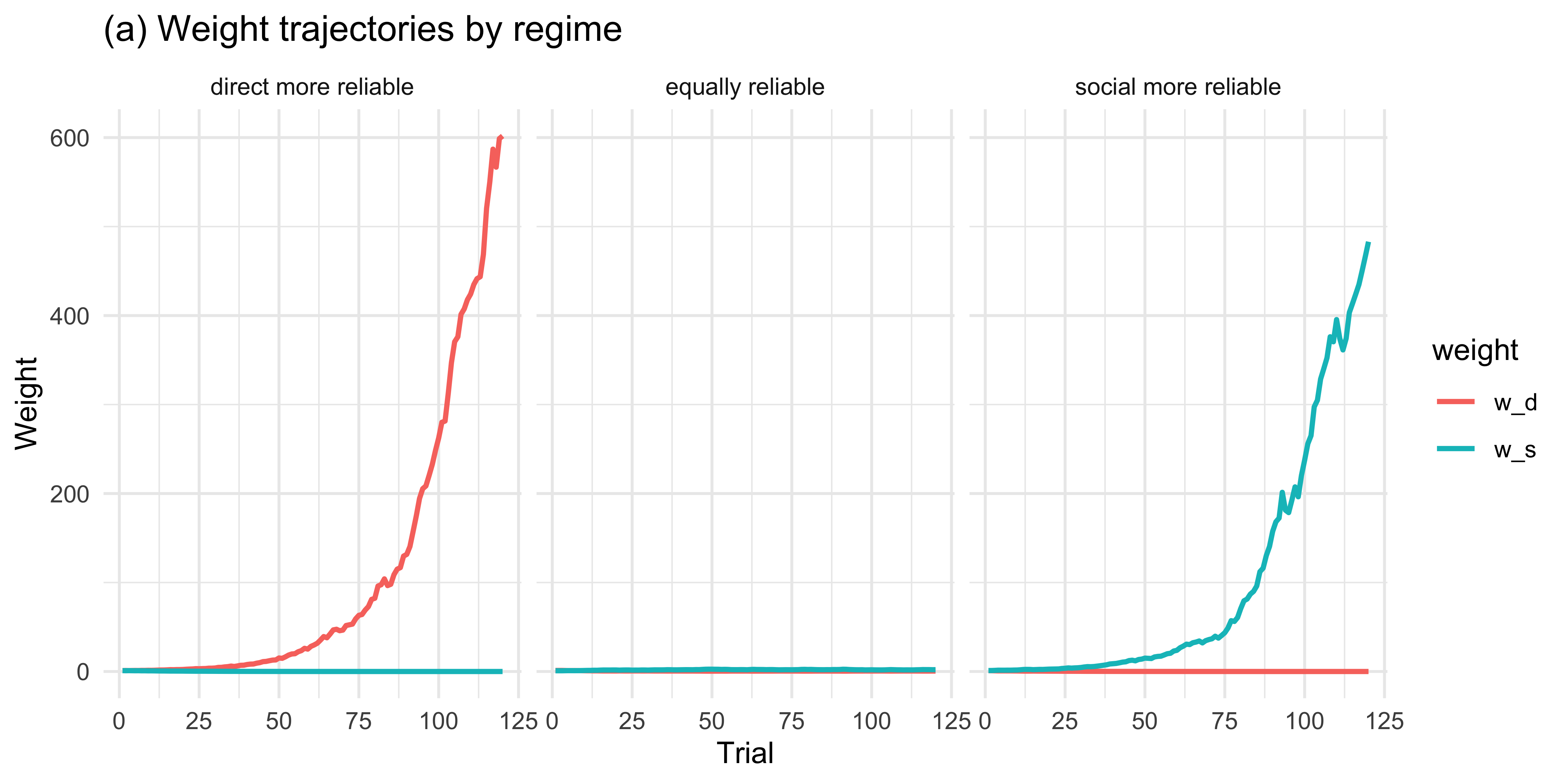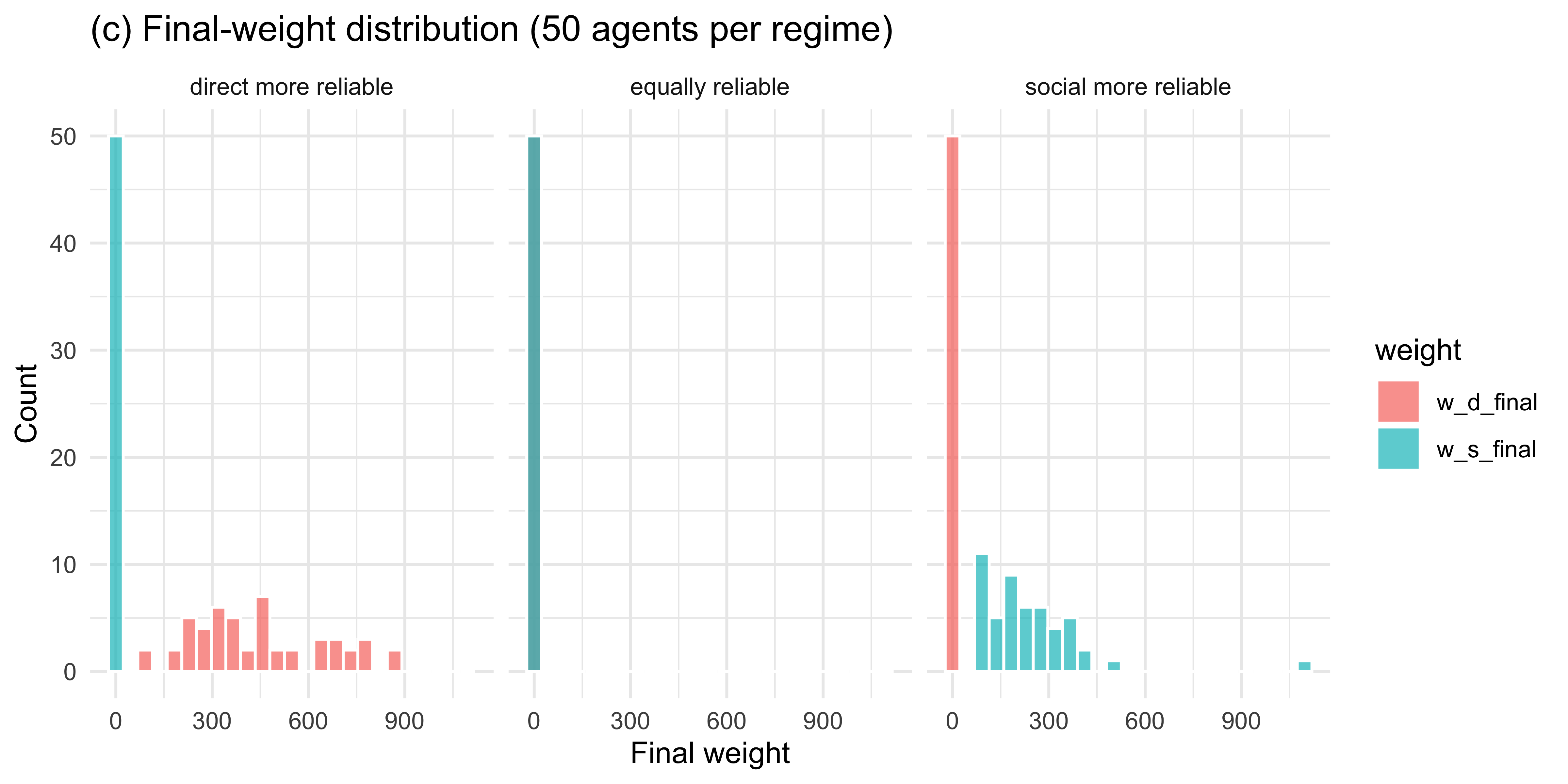 Across 50 simulated agents the weights track the true reliability asymmetry: when direct evidence is more reliable, \(w_d\) grows and \(w_s\) shrinks; the pattern reverses when social evidence is more reliable; and when the two are matched, weights drift modestly in either direction without systematic asymmetry.