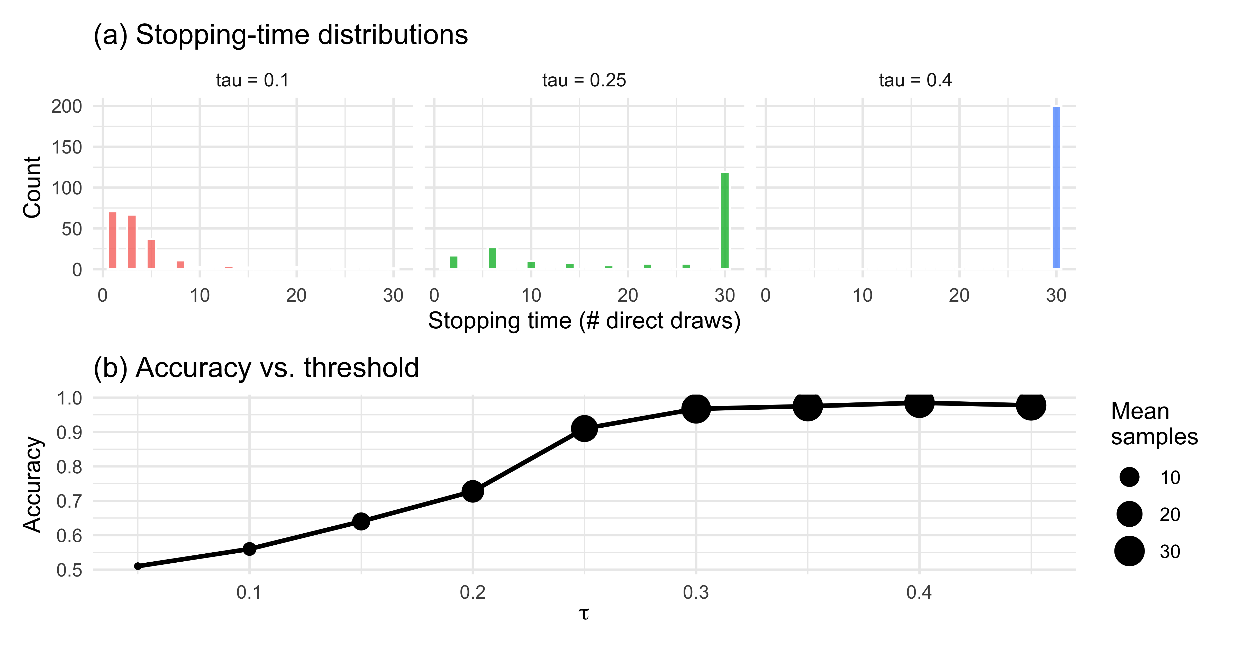 The agents in Ch. 10 are committed decision-makers: evidence arrives, they integrate it, and they respond. In many real tasks — clinical diagnosis, foraging, perceptual decision-making under time pressure — the agent instead chooses when to stop sampling. A cautious agent keeps observing marbles until confident; an impulsive one guesses after the first draw. The trade-off is classical: more samples mean better accuracy but higher cost (time, effort, missed opportunities). This family of policies connects the Bayesian-cognition literature to sequential-sampling models of reaction time (e.g., the drift-diffusion model) and to metacognition, where confidence gates commitment.
