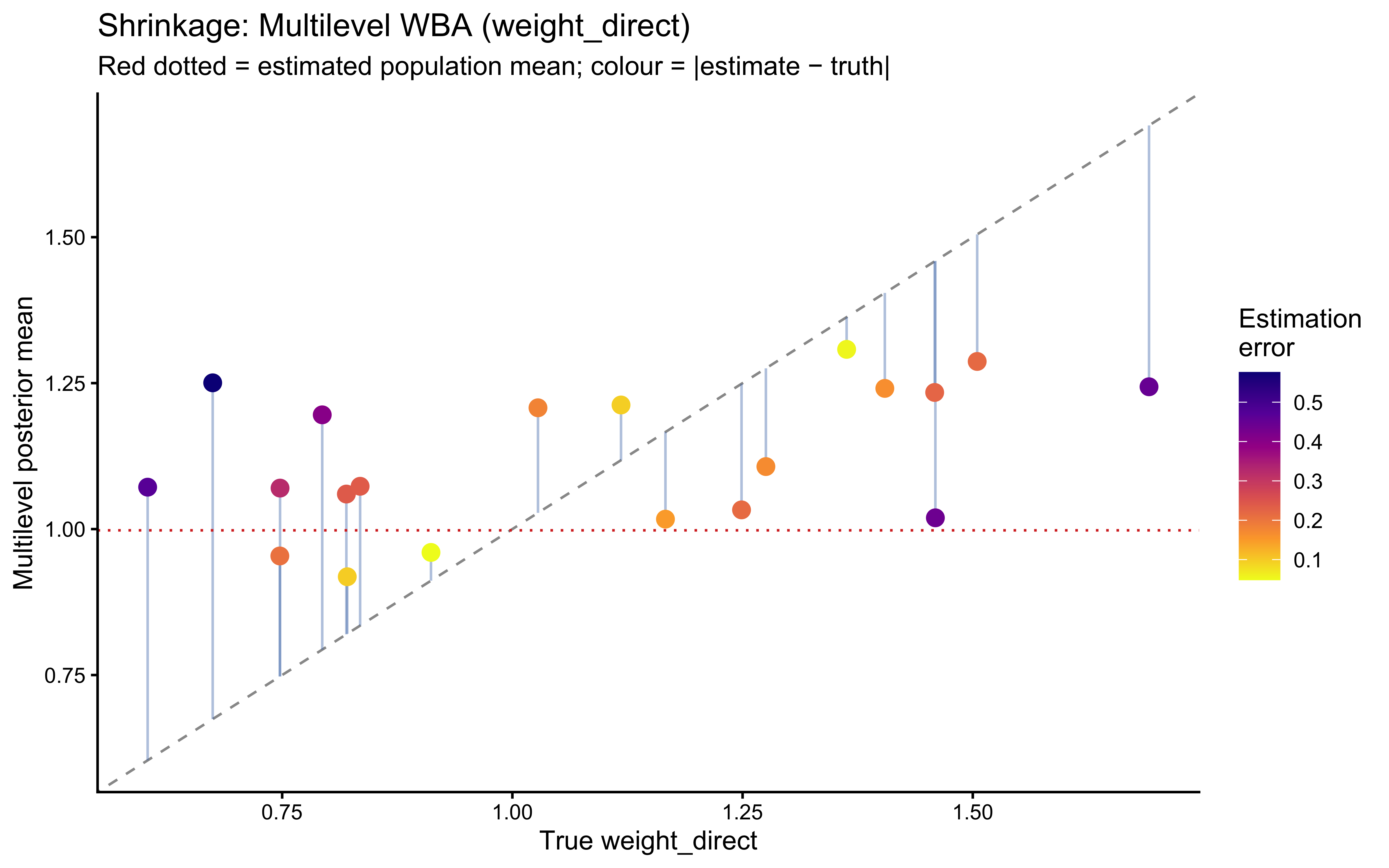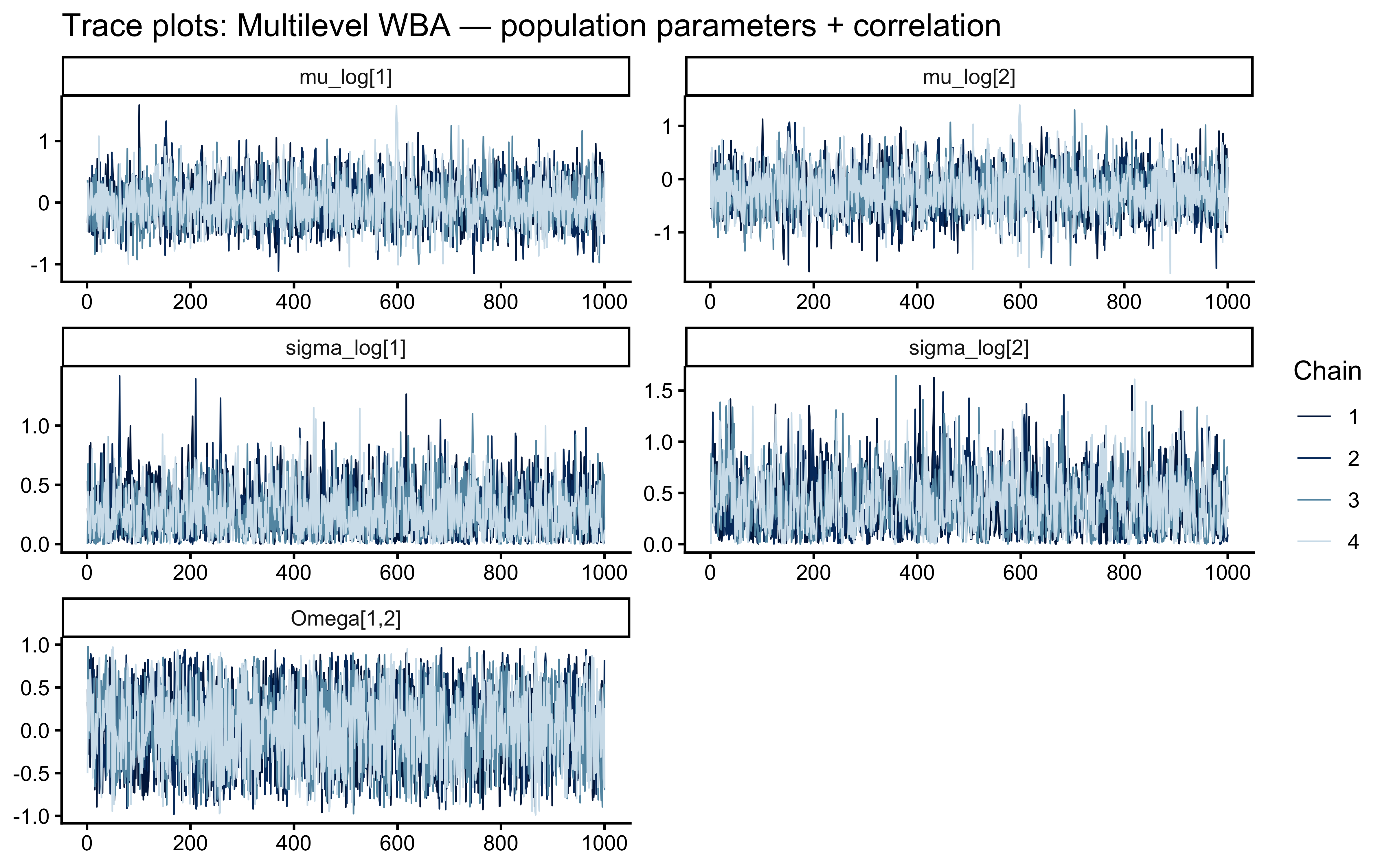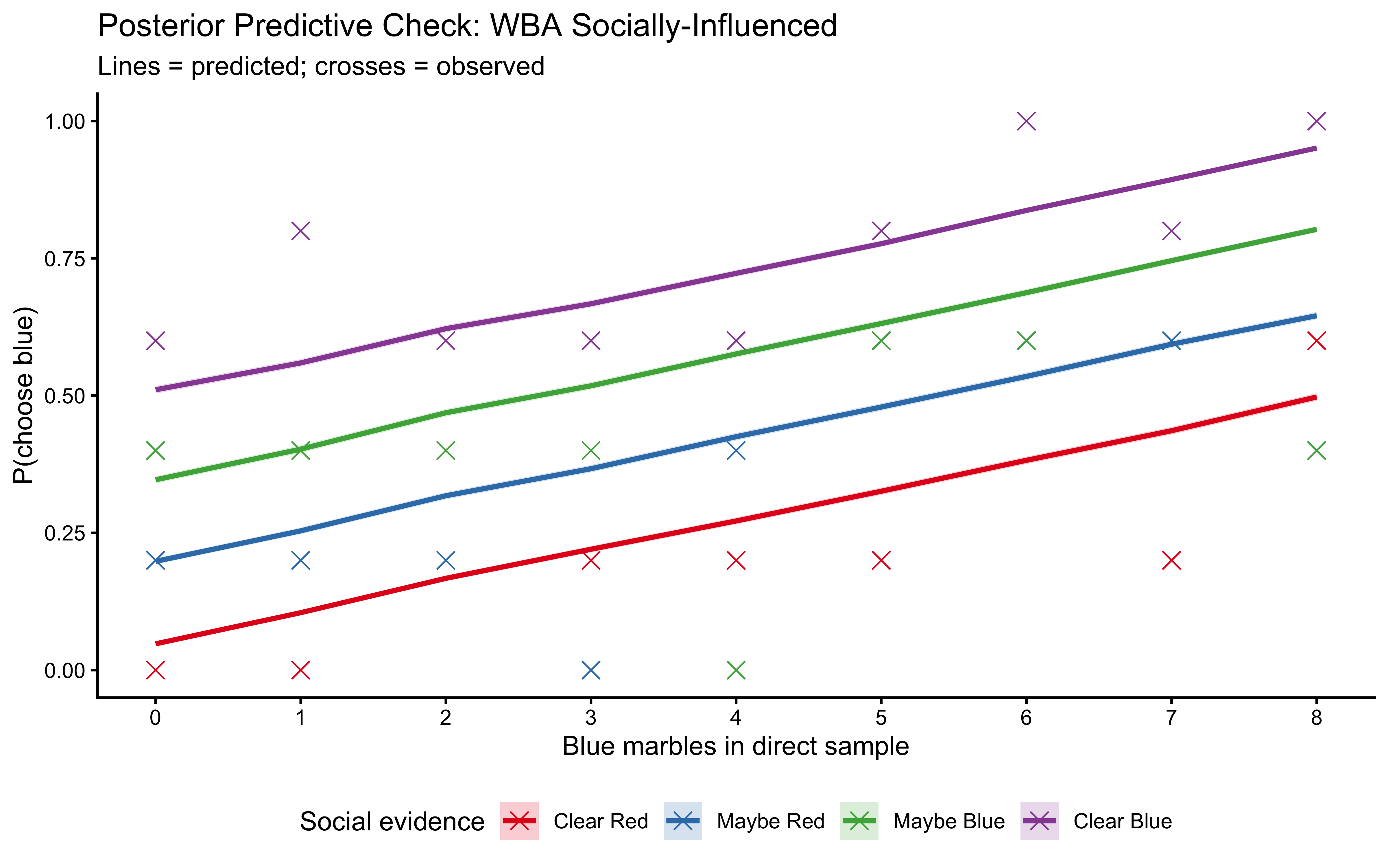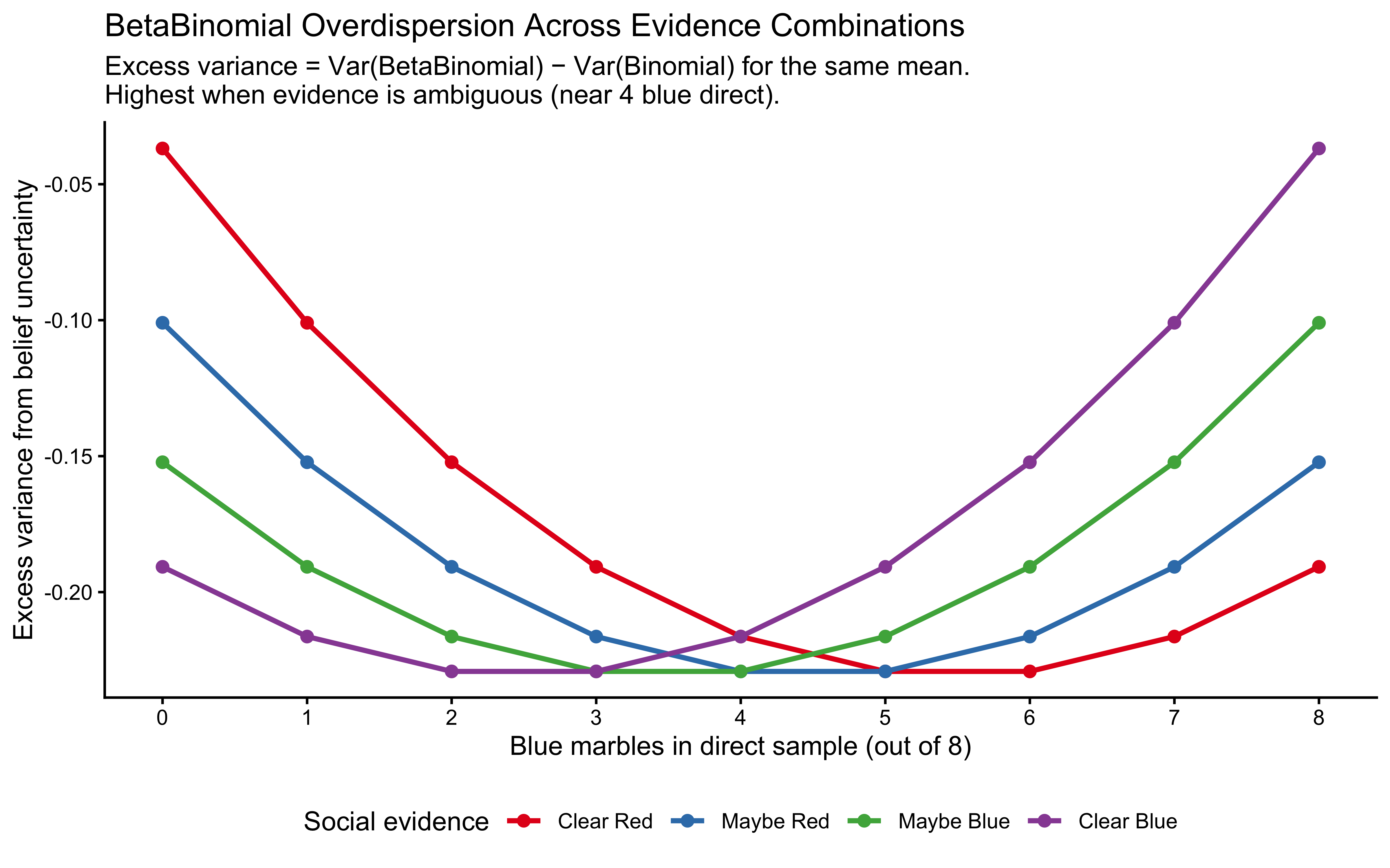 total2 = 3, one can treat the effective social sample size \(n_s > 0\) as a free parameter and let the data determine how many marble-equivalents the social signal is worth. Keeping \(k_{2,i}\) as the ordinal level (0–3) and floating \(n_s\) as the denominator, the WBA becomes: \[\alpha_i = 0.5 + w_d \cdot k_{1,i} + w_s \cdot k_{2,i}\] \[\beta_i = 0.5 + w_d \cdot (8 - k_{1,i}) + w_s \cdot (n_s - k_{2,i})\] with, for example, \(n_s \sim \text{Half-Normal}(0, 8)\), reflecting that the other person’s true sample was at most 8 marbles. In Stan,n_sis declared asreal<lower=3>(lower-bounded to prevent \(n_s < k_{2,i} = 3\)) and its log-prior added totarget. One practical caution: \(n_s\) and \(w_s\) are partially collinear — only the products \(w_s \cdot k_{2,i}\) and \(w_s \cdot (n_s - k_{2,i})\) appear in the likelihood. A strong prior on \(n_s\), or fixing it and freeing only \(w_s\), is advisable unless the evidence grid is sufficiently dense to separate them via SBC.