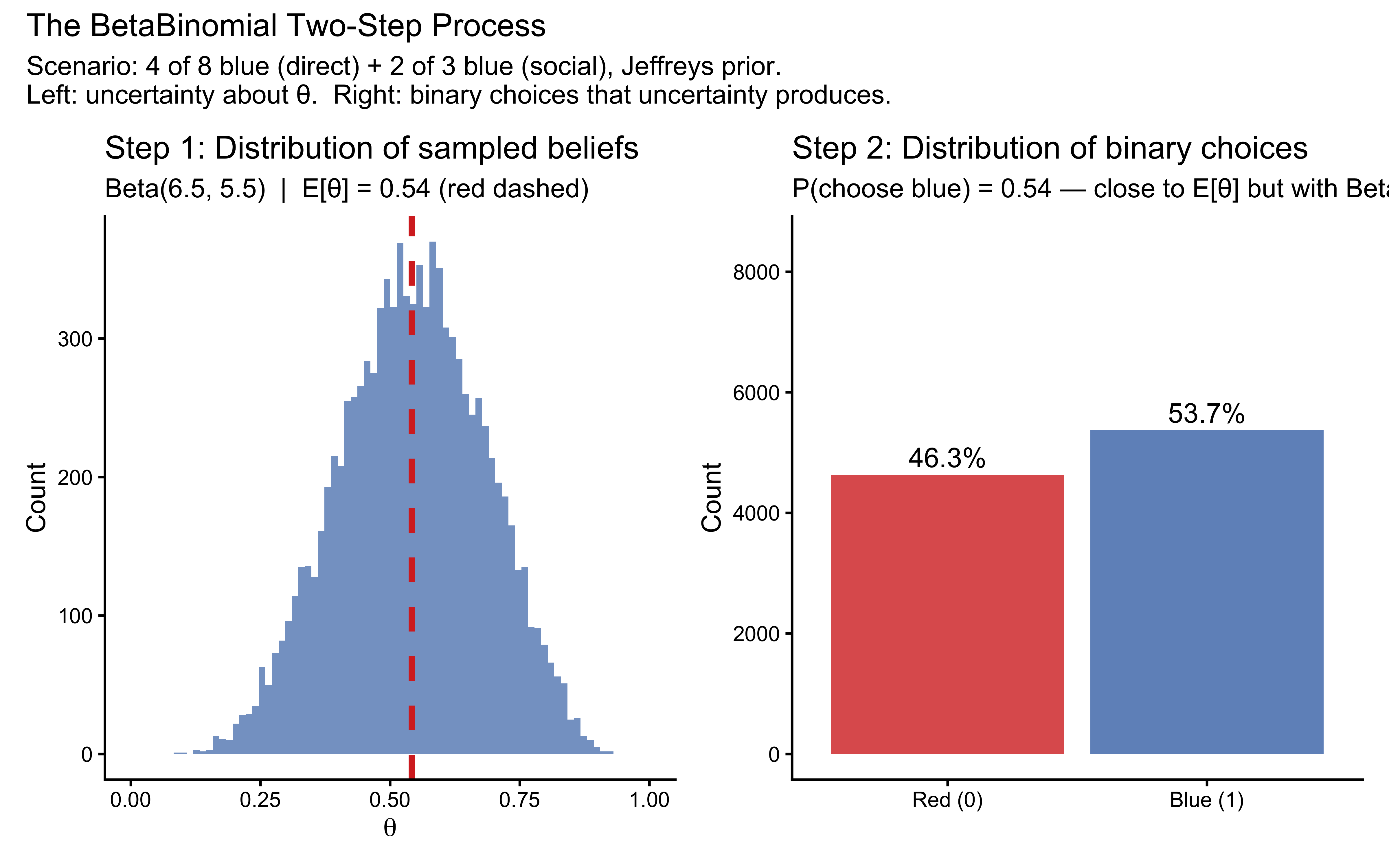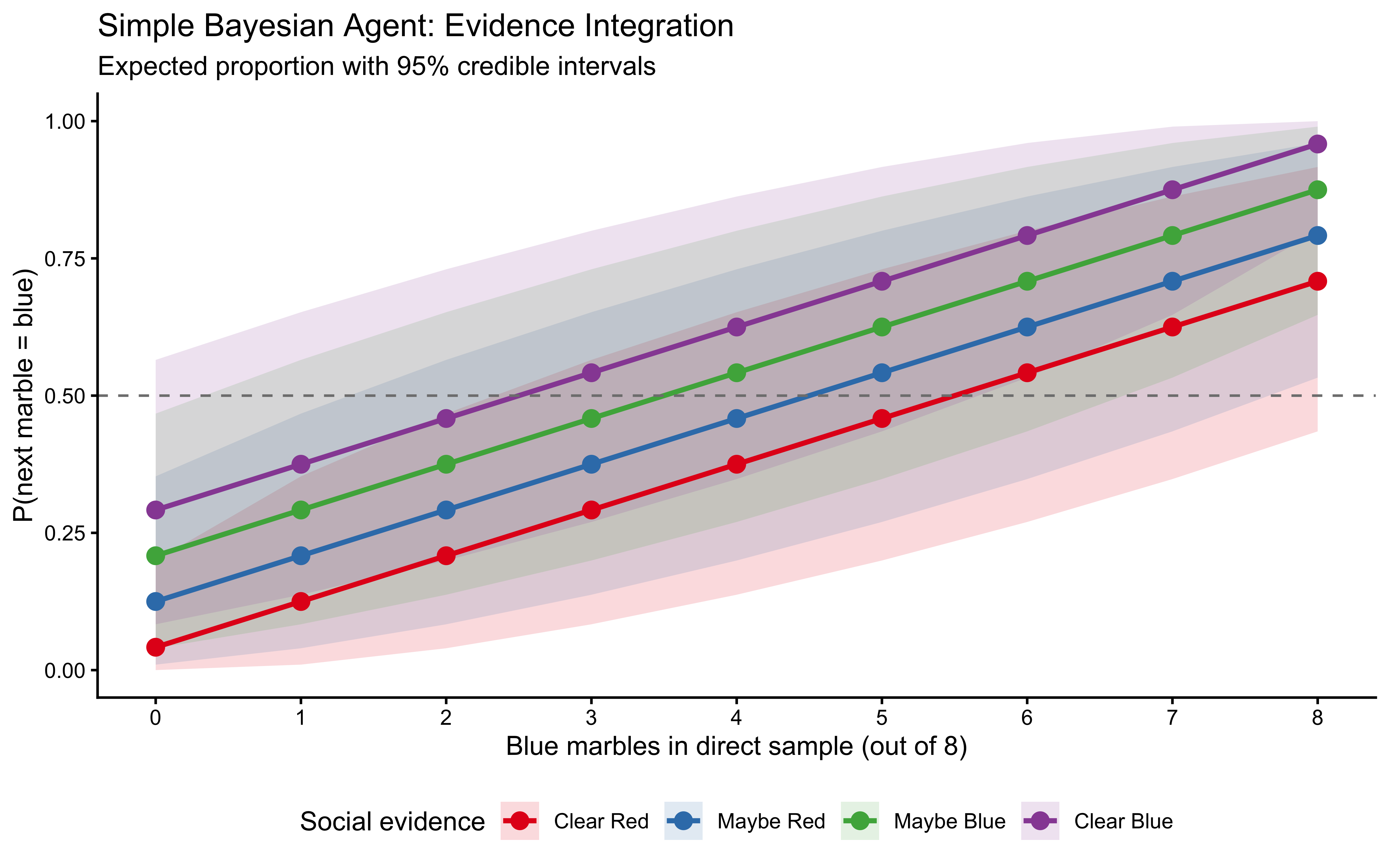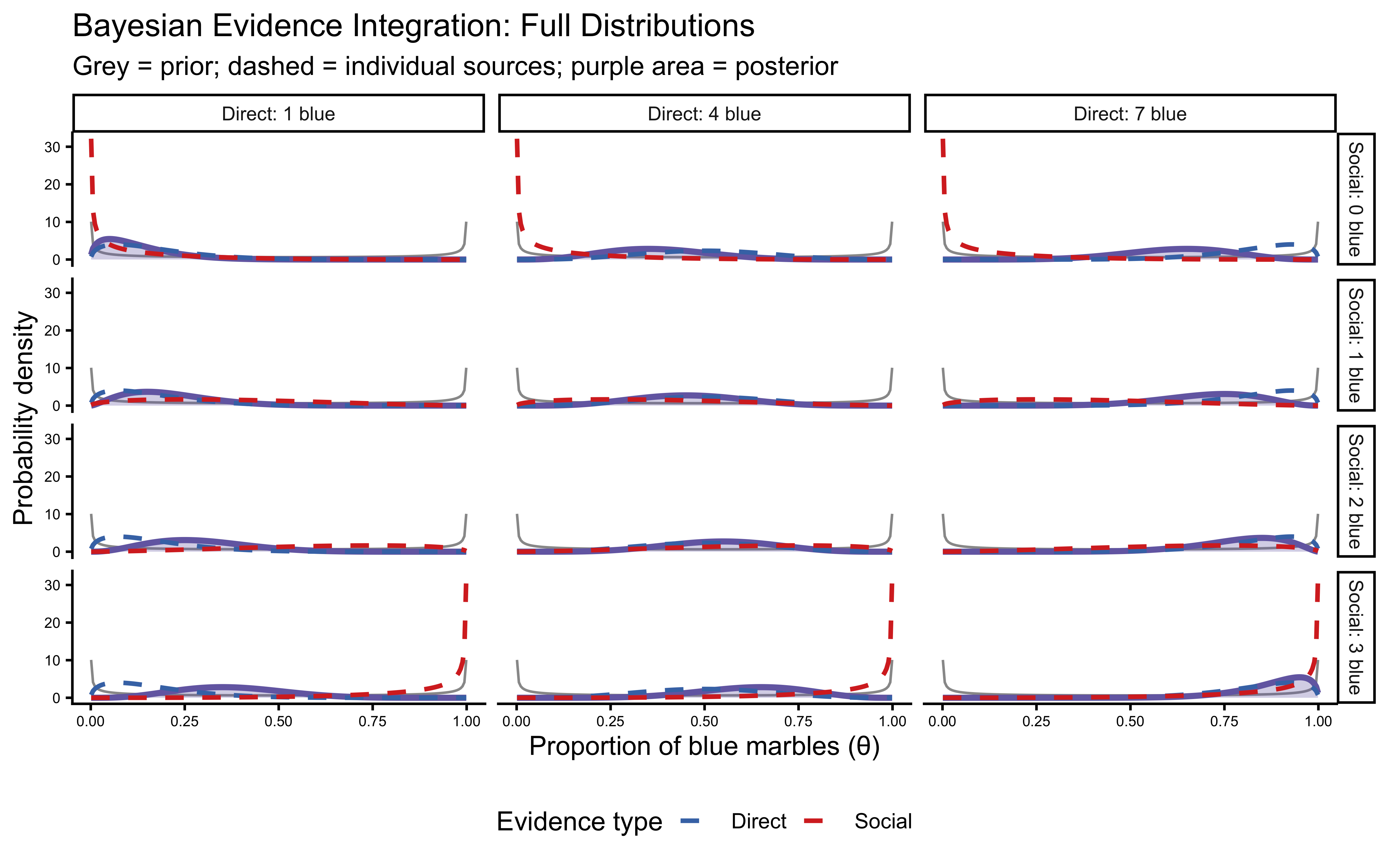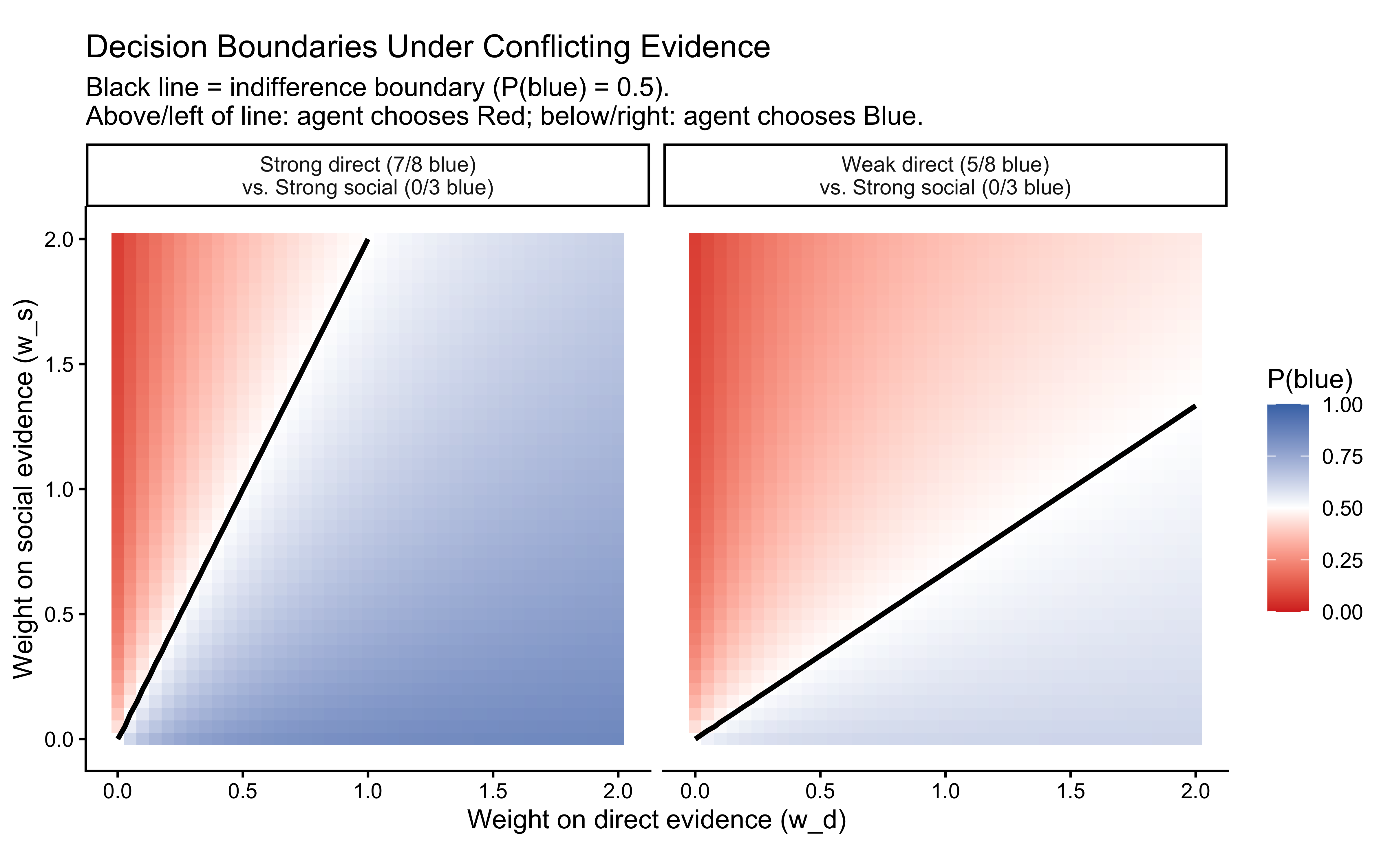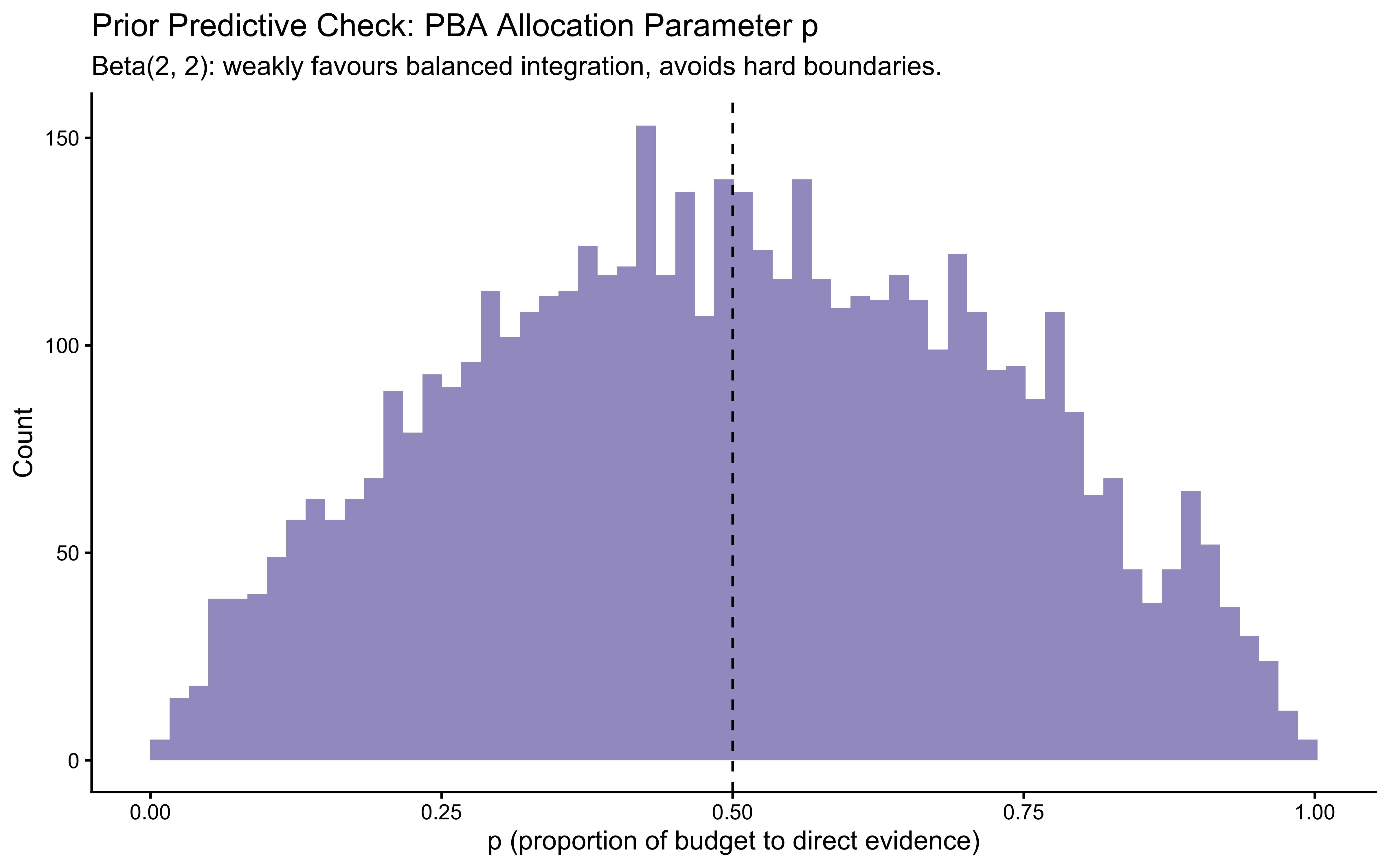where \(p \to 1\) means social evidence is ignored; \(p \to 0\) means direct evidence is ignored. The PBA has one free parameter: \(p\). Note that \(p = 0.5\) does not produce equal influence from both sources, because the two pools have different sizes: at \(p = 0.5\), direct evidence contributes up to \(0.5 \times 8 = 4\) pseudocounts while social evidence contributes at most \(0.5 \times 3 = 1.5\). True equal maximum contribution from both sources would require \(p \cdot 8 = (1-p) \cdot 3\), yielding \(p \approx 0.27\). While \(p = 0.5\) does recover behaviour structurally close to the SBA (preserving proportional weighting within each source), it should not be read as “balanced” integration.