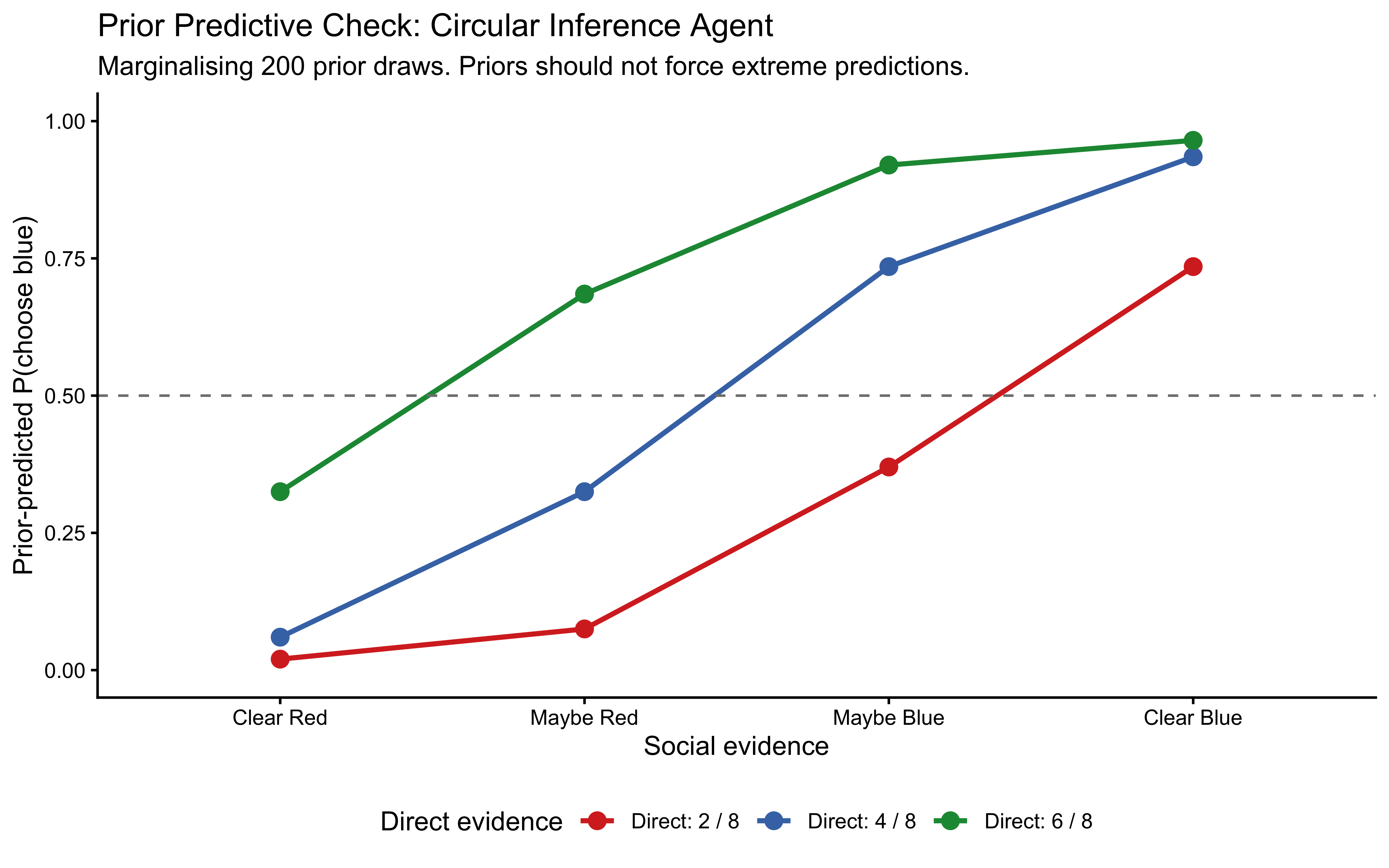 Identifiability note — Circular Inference: Separating \(w_\text{self}\) from \(\alpha_\text{self}\) requires trials where evidence is neither at ceiling nor floor: a sample of 0 or 8 produces the same log-likelihood ratio regardless of \(\alpha\), because \(\alpha \times 0 = 0\). Trials with intermediate evidence (3–5 blue of 8) are most informative for the loop parameters. In the 9 × 4 evidence grid the intermediate trials are plentiful, but SBC may still show wider calibration bands for \(\alpha\) than for \(w\) — this is expected and not a failure of the model.