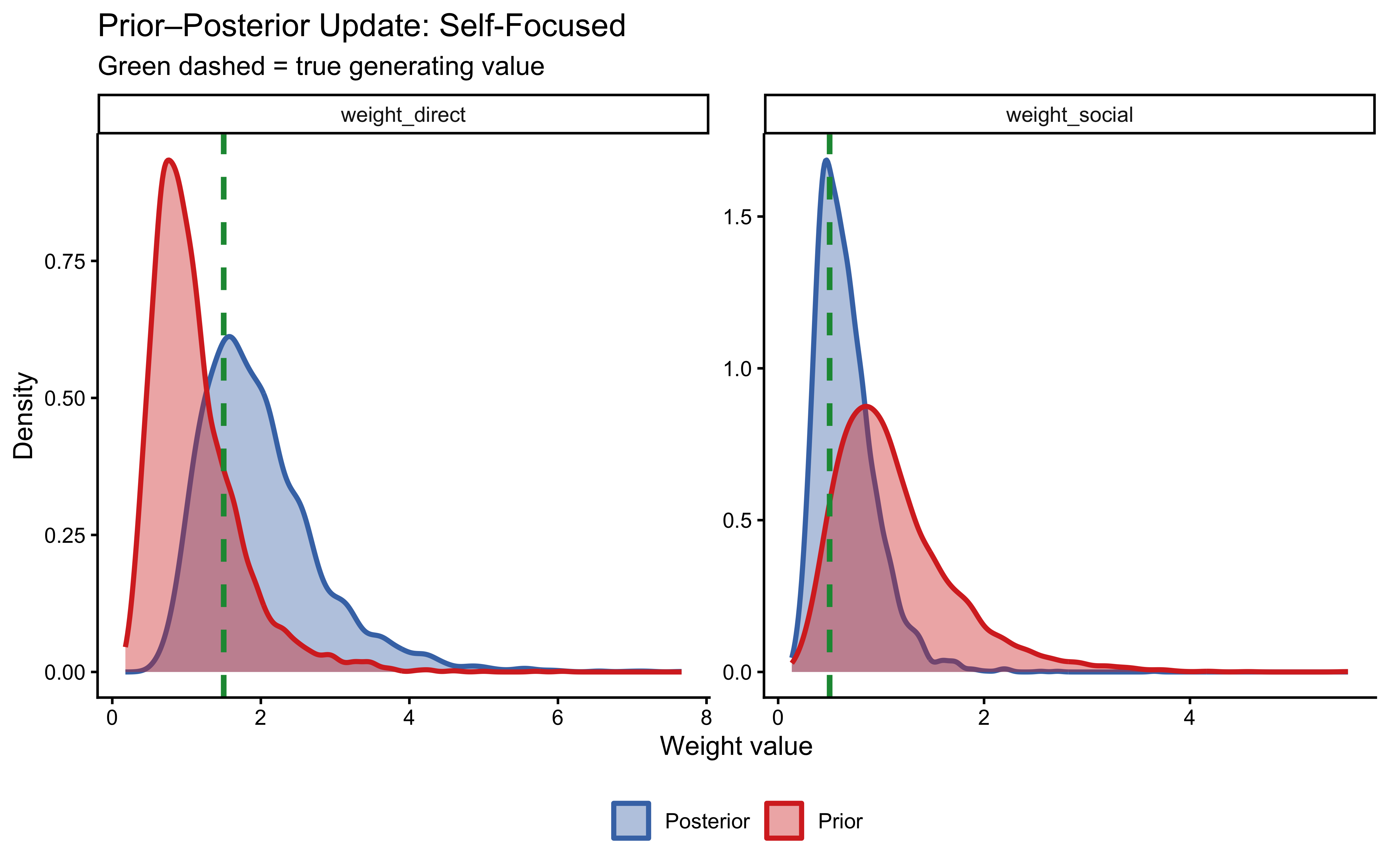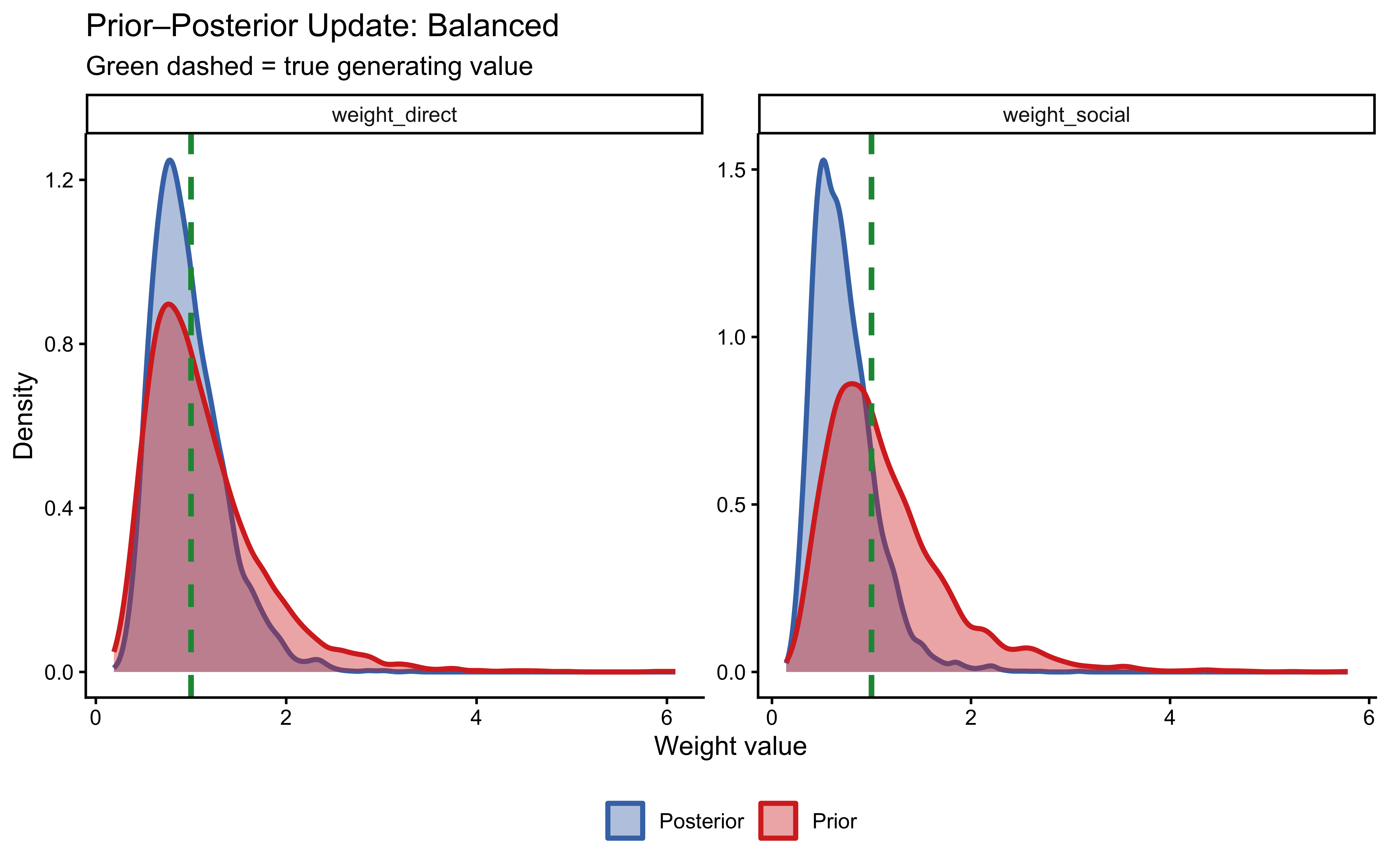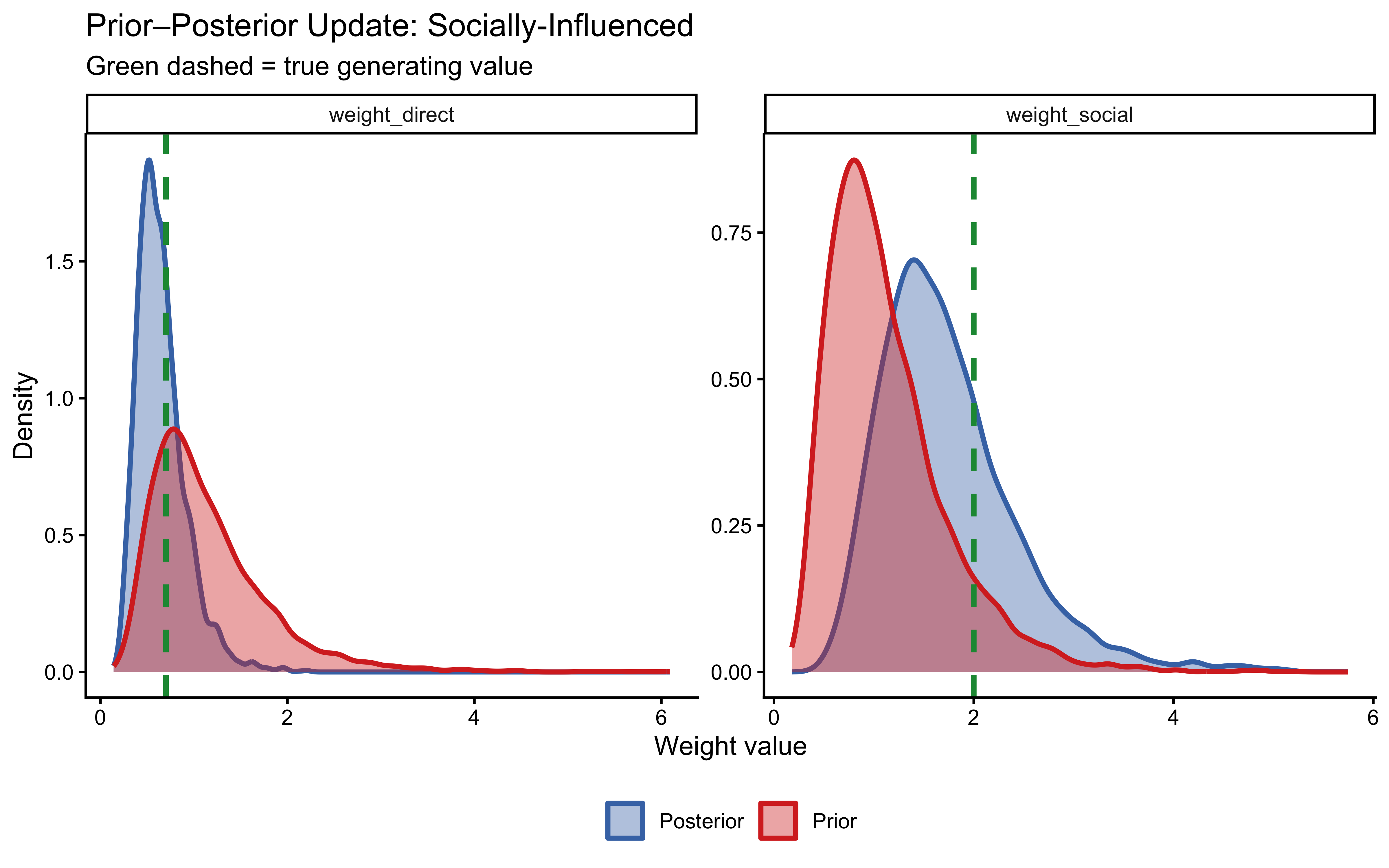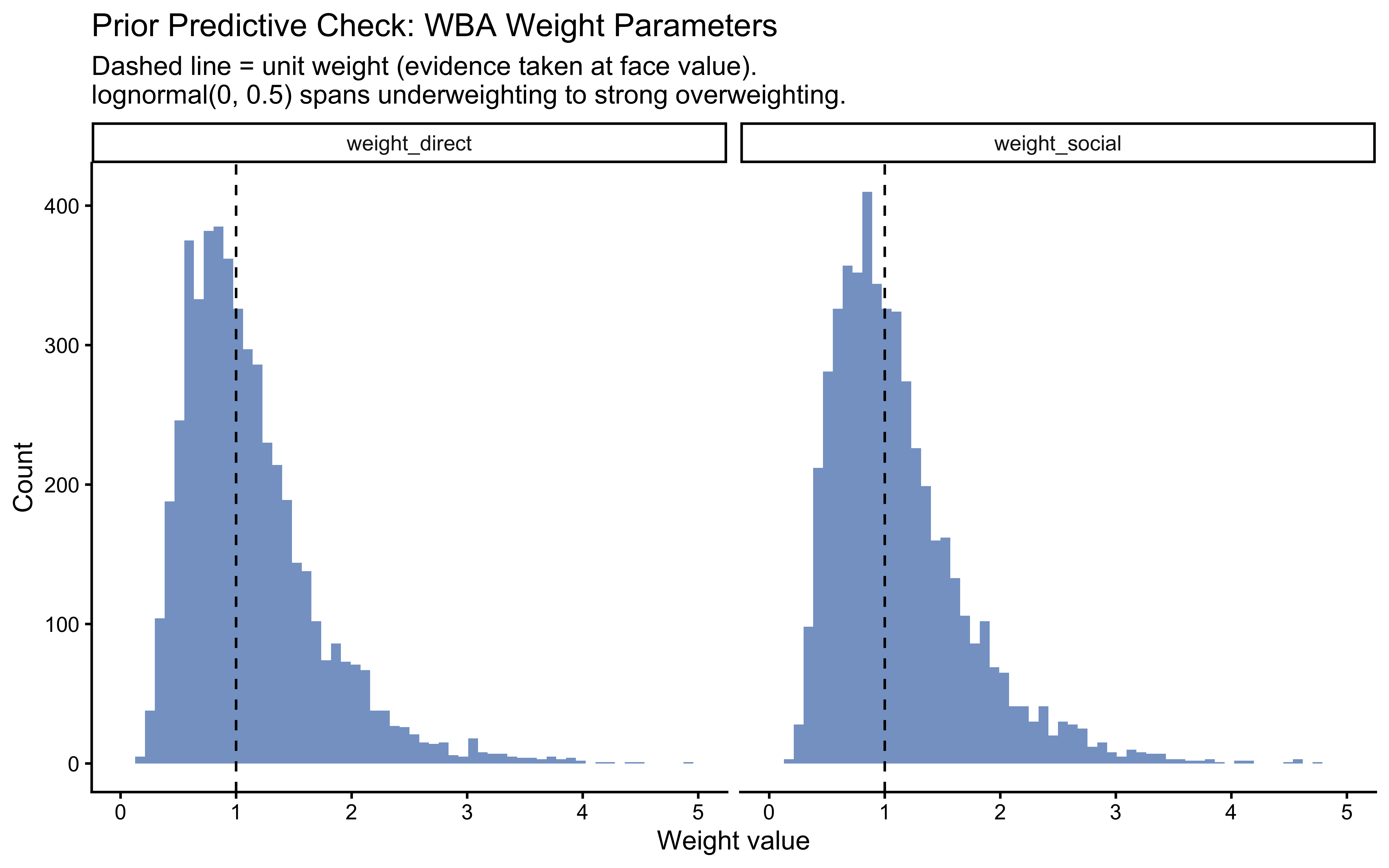 A weight of 1.0 means the agent treats each pseudo-marble at face value; less than 1.0 means downweighting (scepticism); greater than 1.0 means overweighting. Negative weights are not assigned a prior — they would imply anti-correlated updating, which has no cognitive interpretation in this task. One interpretive caution: because social evidence is encoded as total2 = 3 pseudo-marbles when the actual sample was 8, a participant who correctly intuits that the other person saw 8 marbles might rationally apply \(w_s \approx 8/3 \approx 2.67\) simply to compensate for the encoding approximation, not because they genuinely over-trust the social source. Recovered \(w_s\) values should therefore be read as trust relative to the encoding, not as an absolute measure of social reliance.