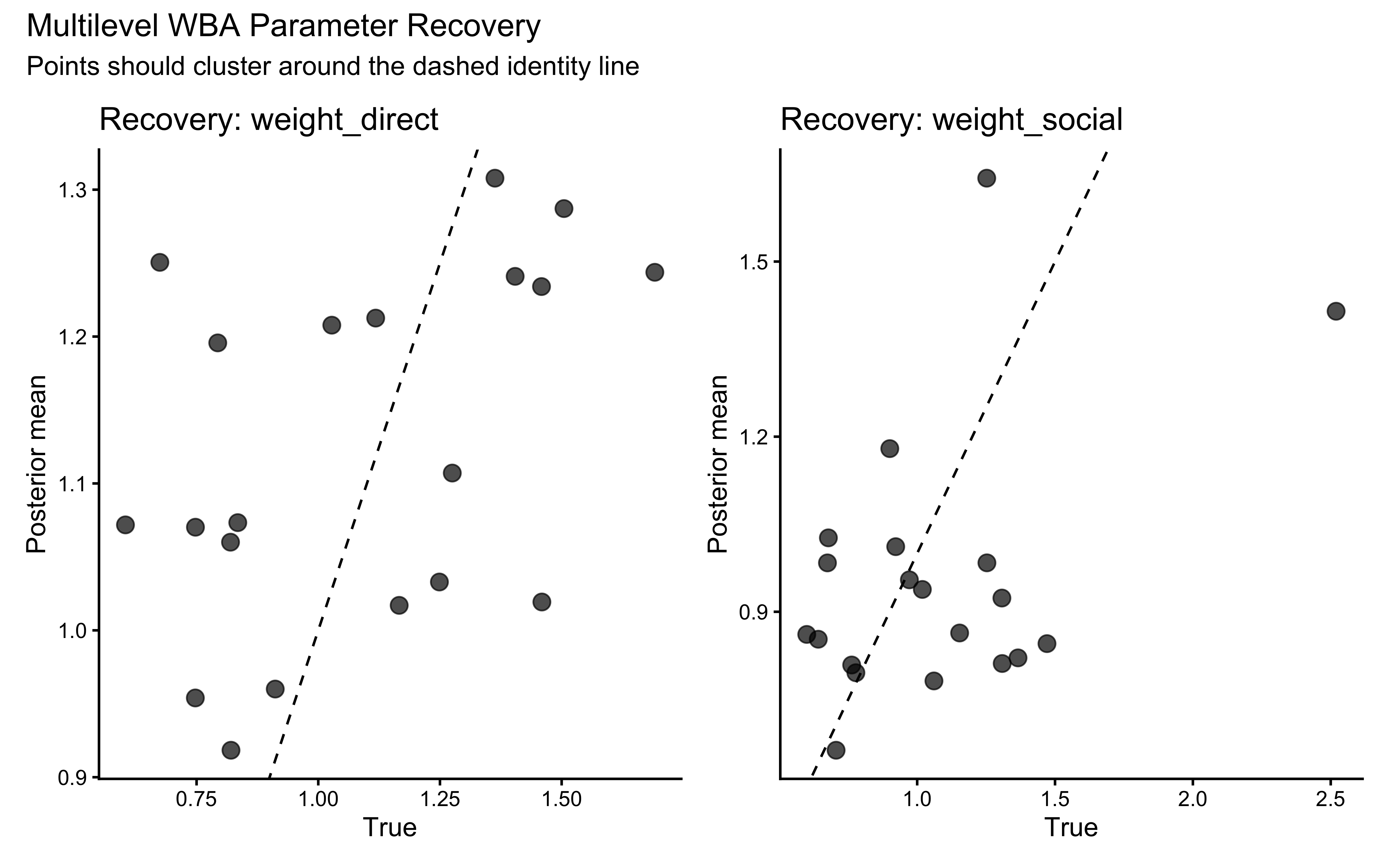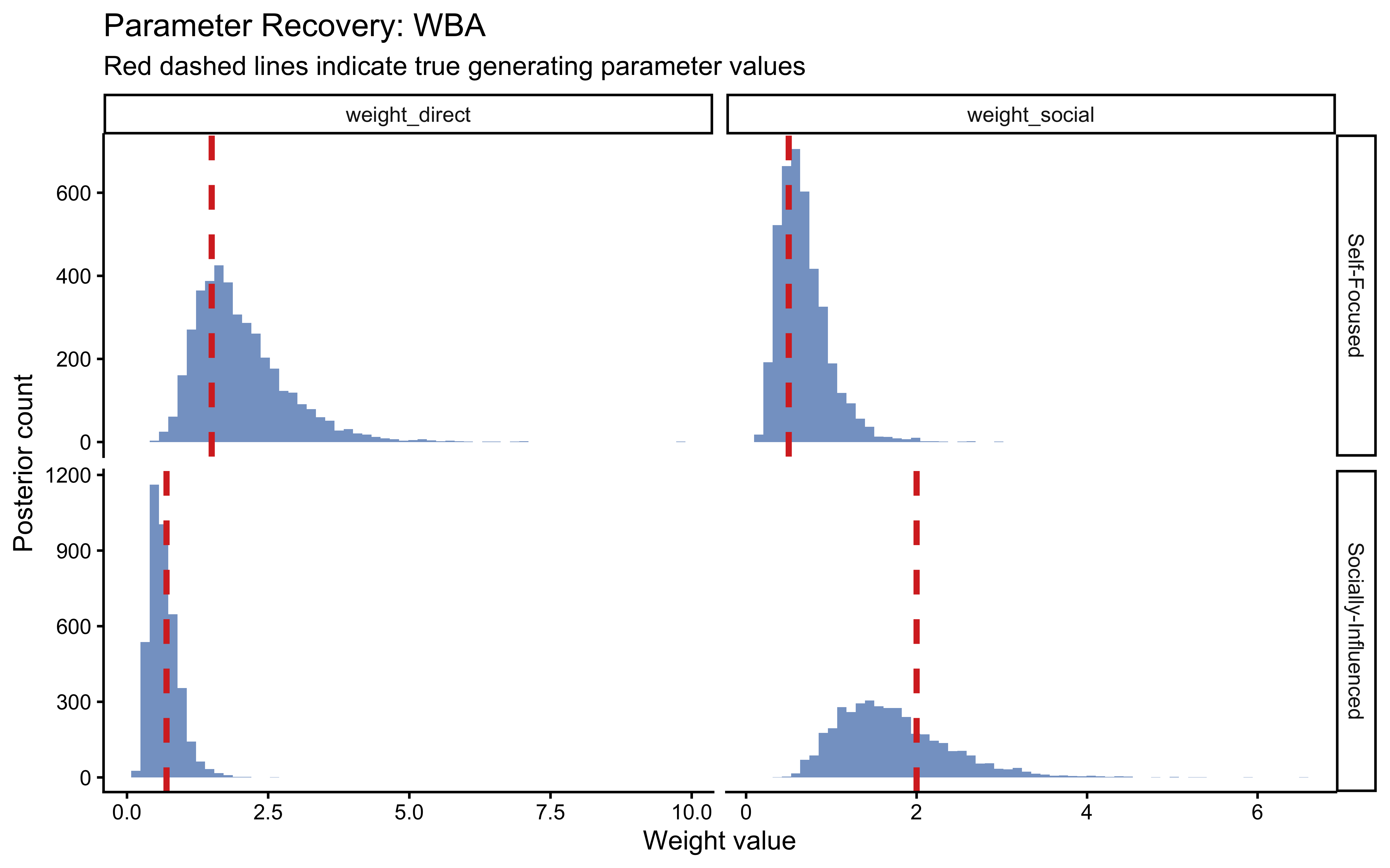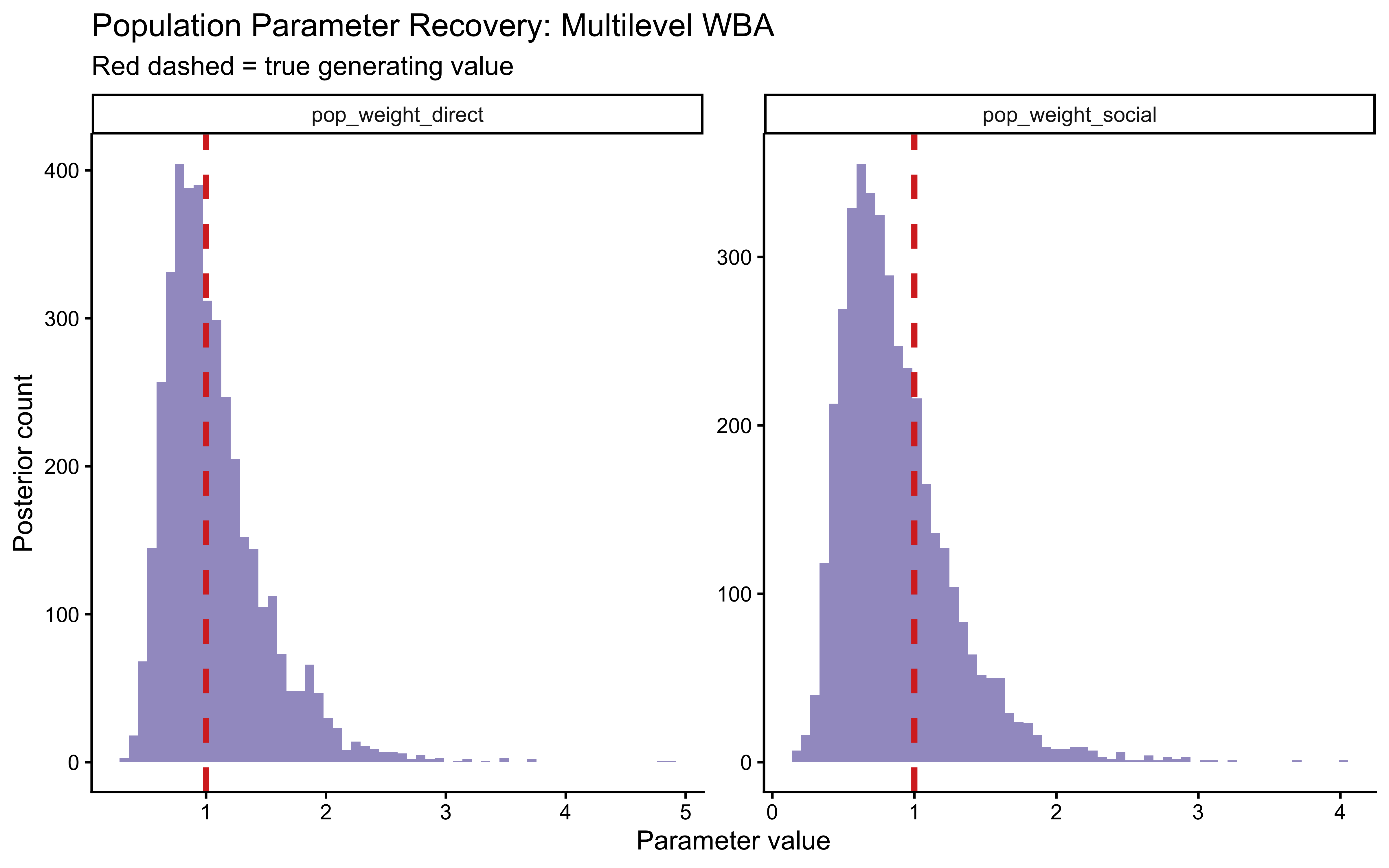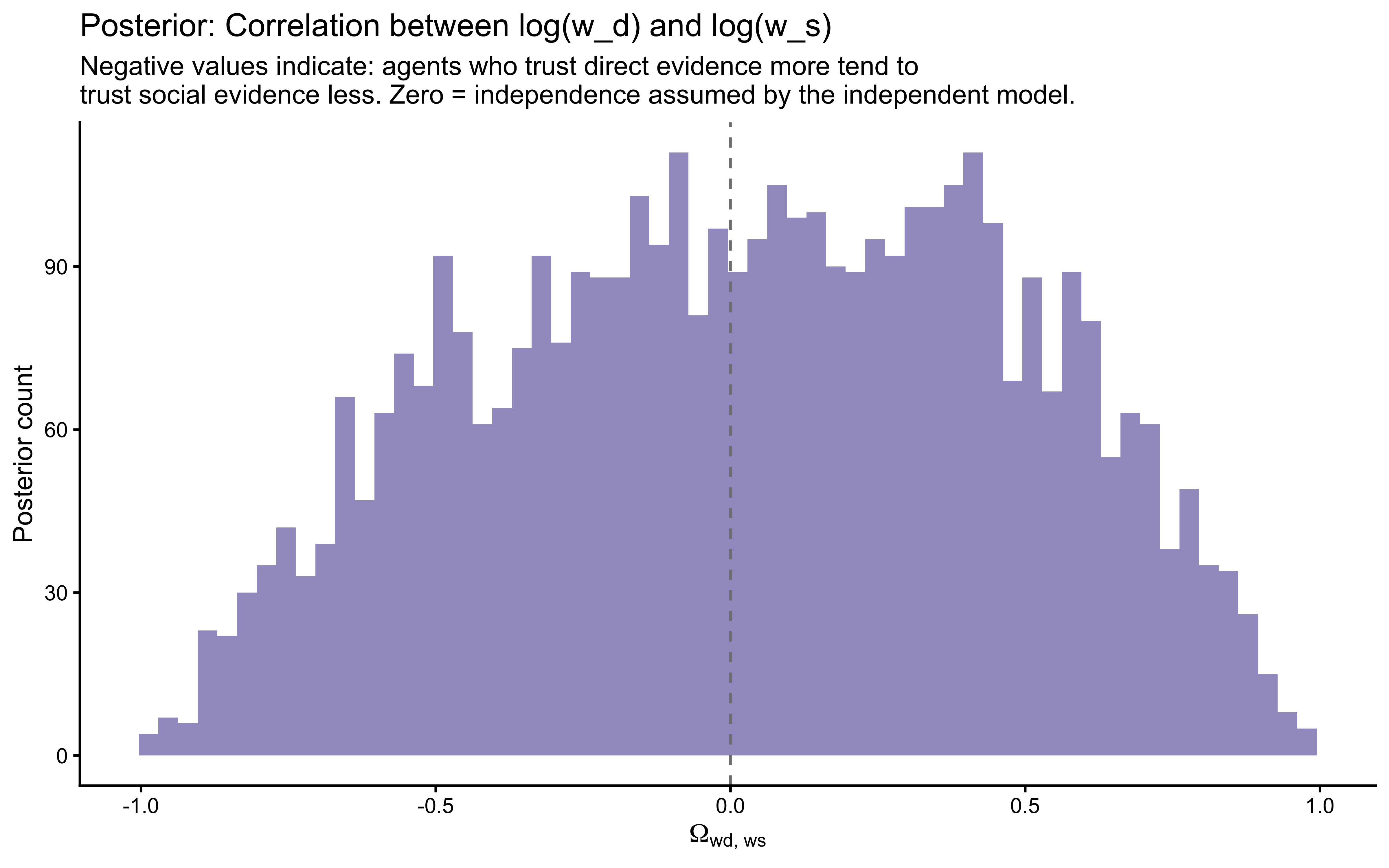 A weight of 1.0 means the agent treats each pseudo-marble at face value; less than 1.0 means downweighting (scepticism); greater than 1.0 means overweighting. Negative weights are not assigned a prior — they would imply anti-correlated updating, which has no cognitive interpretation in this task. One interpretive caution: because social evidence is encoded as total2 = 3 pseudo-marbles when the actual sample was 8, a participant who correctly intuits that the other person saw 8 marbles might rationally apply \(w_s \approx 8/3 \approx 2.67\) simply to compensate for the encoding approximation, not because they genuinely over-trust the social source. Recovered \(w_s\) values should therefore be read as trust relative to the encoding, not as an absolute measure of social reliance.