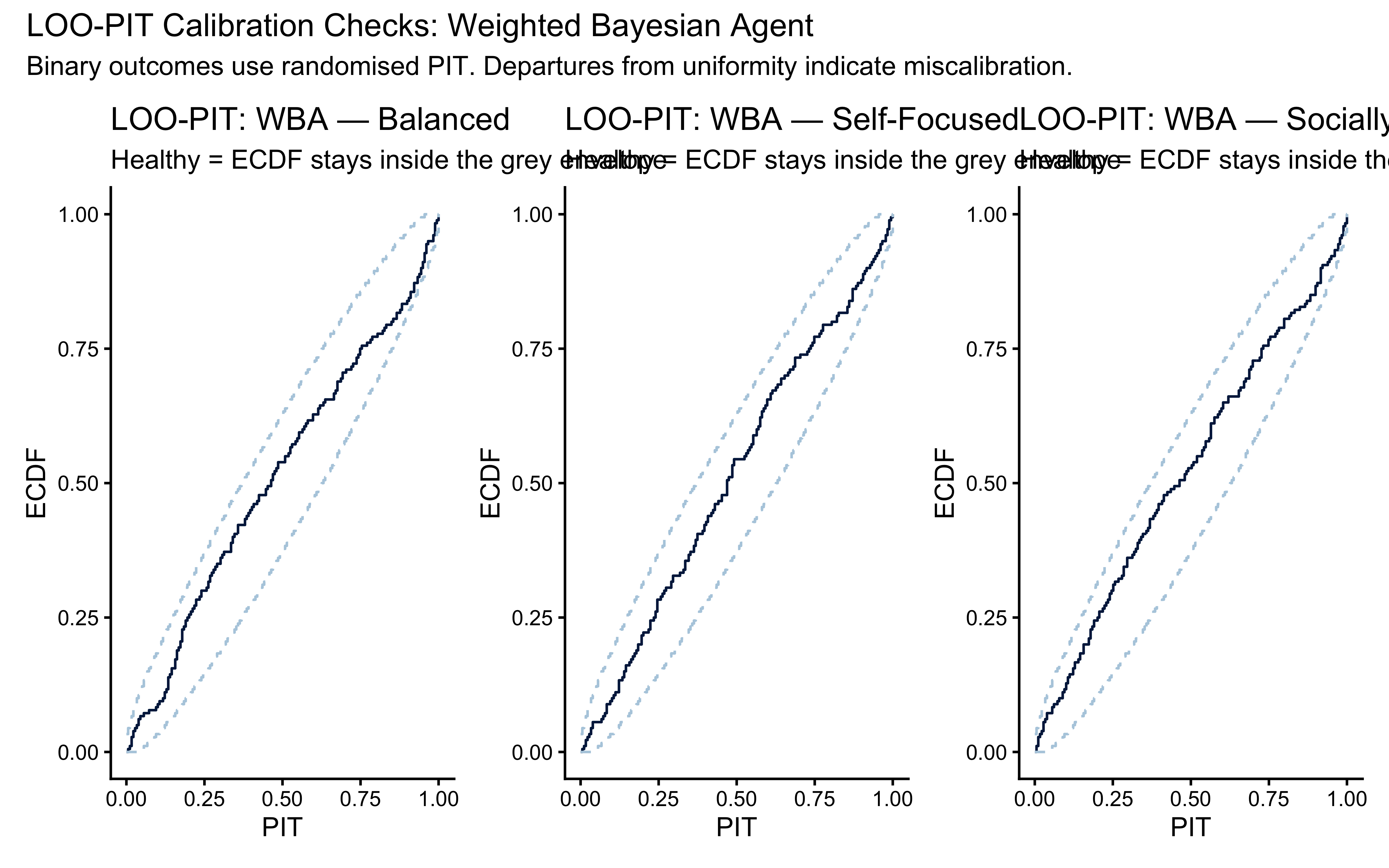 This pipeline is not bureaucracy. Without SBC, a subtle Stan implementation bug could produce attractive posteriors that are systematically biased. Without LOO-PIT, we cannot distinguish a model that fits from a model that truly predicts. Without the three-way comparison, we cannot know whether the WBA’s additional parameter reflects a real cognitive structure or mere overfitting.