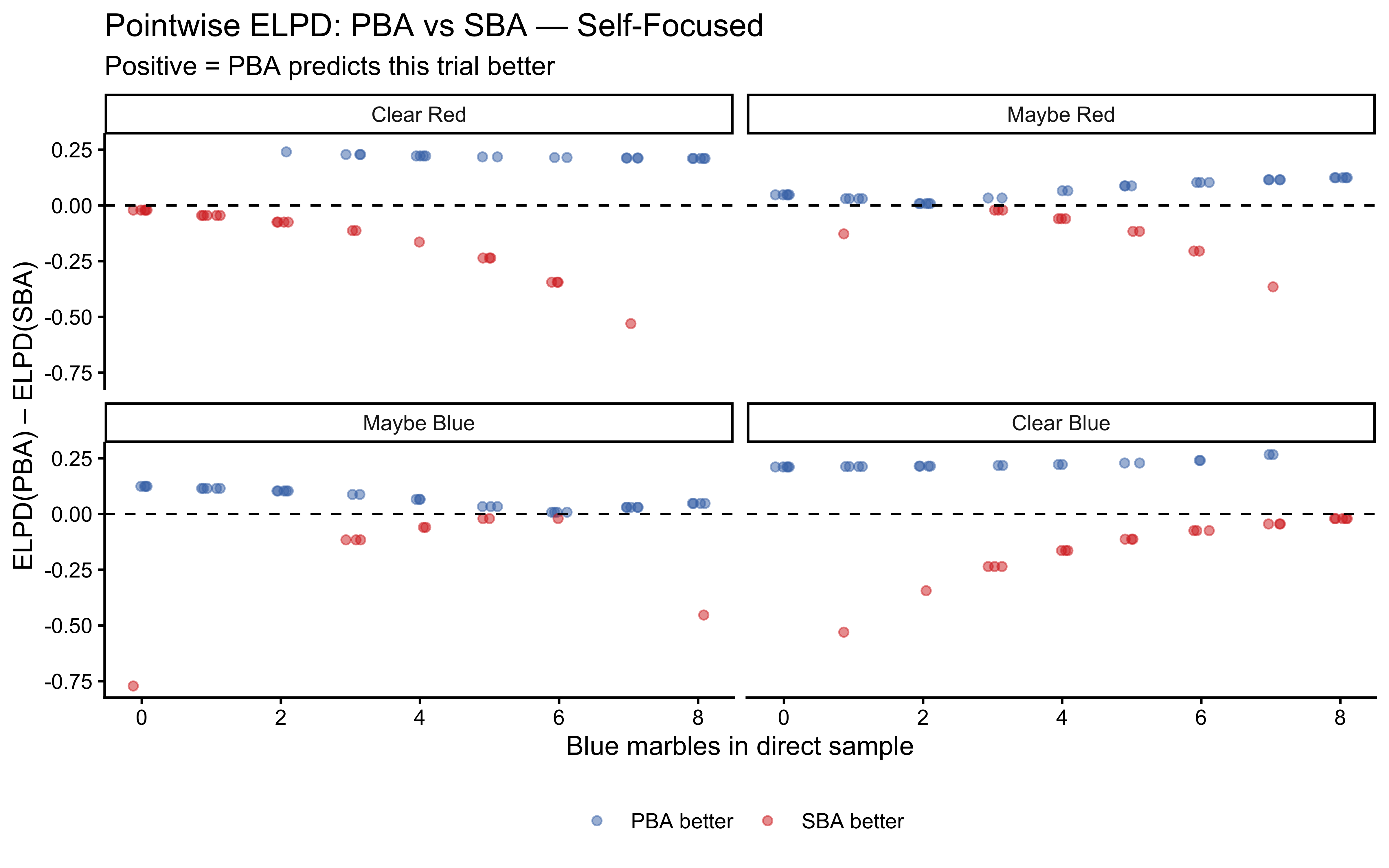The PBA’s identifiability boundary. When \(p \to 0\) or \(p \to 1\), one evidence source is entirely ignored. The Beta(2,2) prior keeps the sampler away from these boundaries, but if the true agent strongly ignores one source, the posterior will approach the boundary and ESS may degrade. In practice, check tail ESS for the PBA whenever it is fitted to strongly asymmetric agents.
