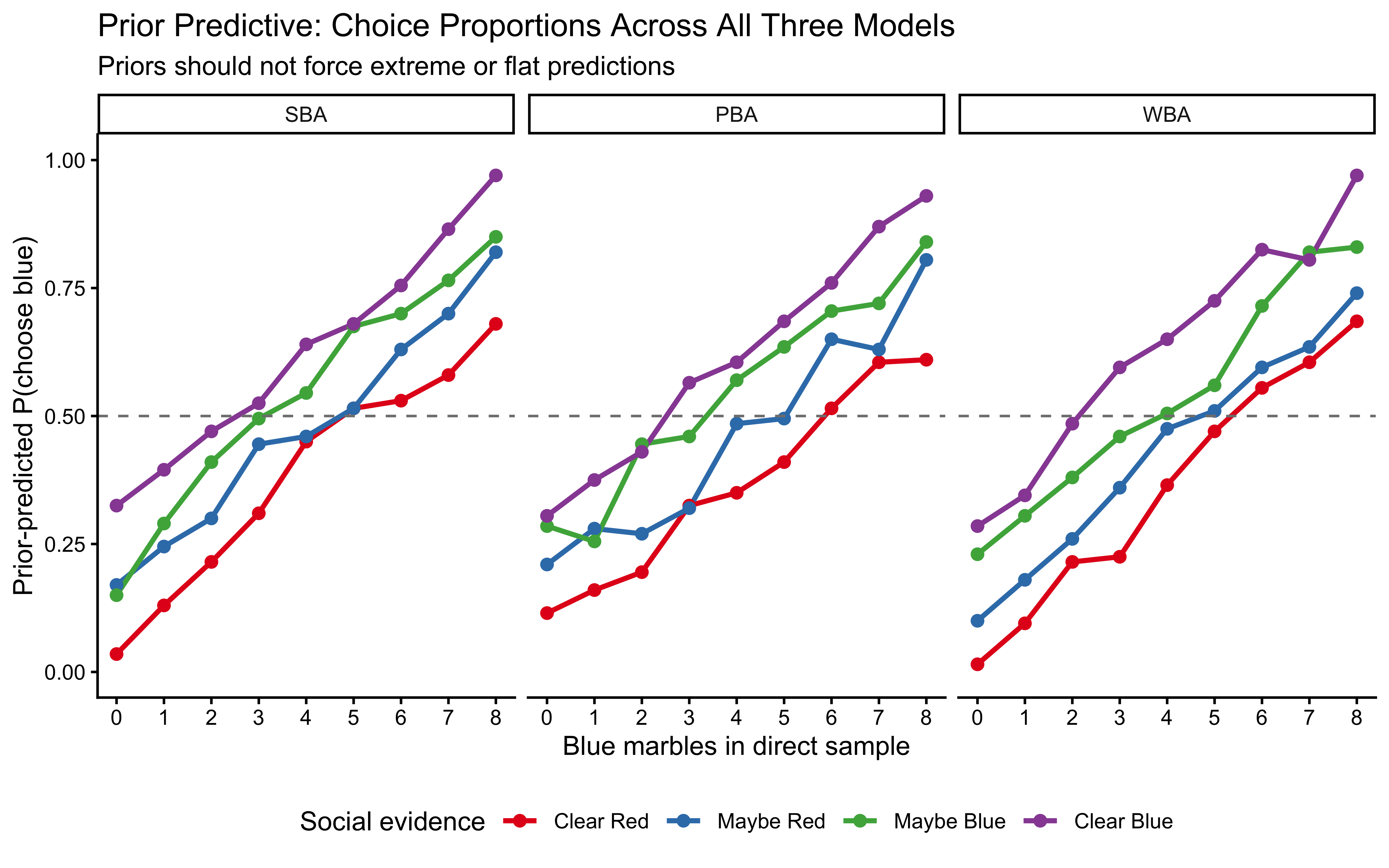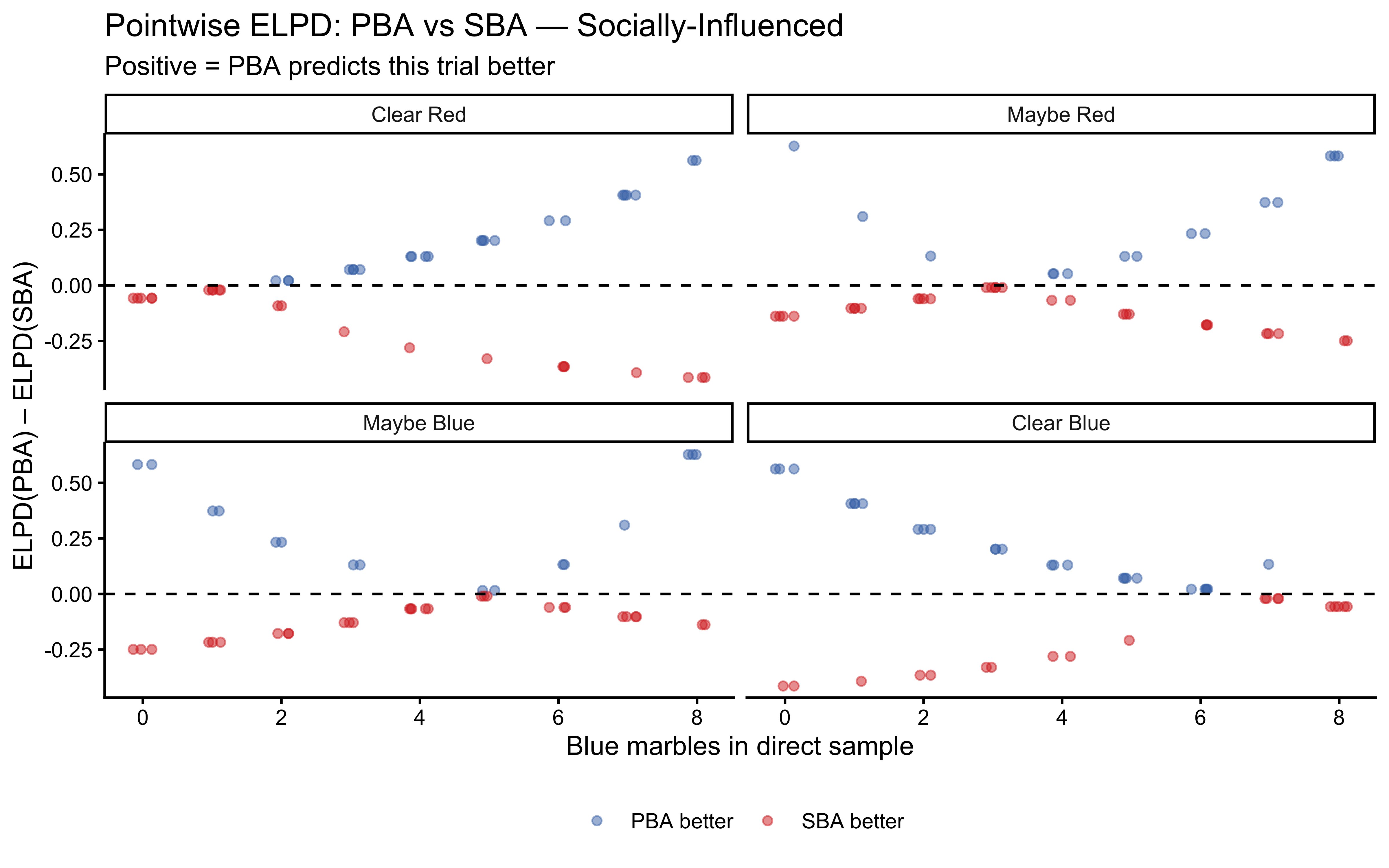 Trial independence in non-sequential models. The SBA, PBA, and WBA assume each trial involves a fresh, independent jar. This is true in Simonsen et al.’s design but is often violated in other social learning tasks. Applying these models to paradigms with across-trial structure requires the sequential extension — with LFO-CV.