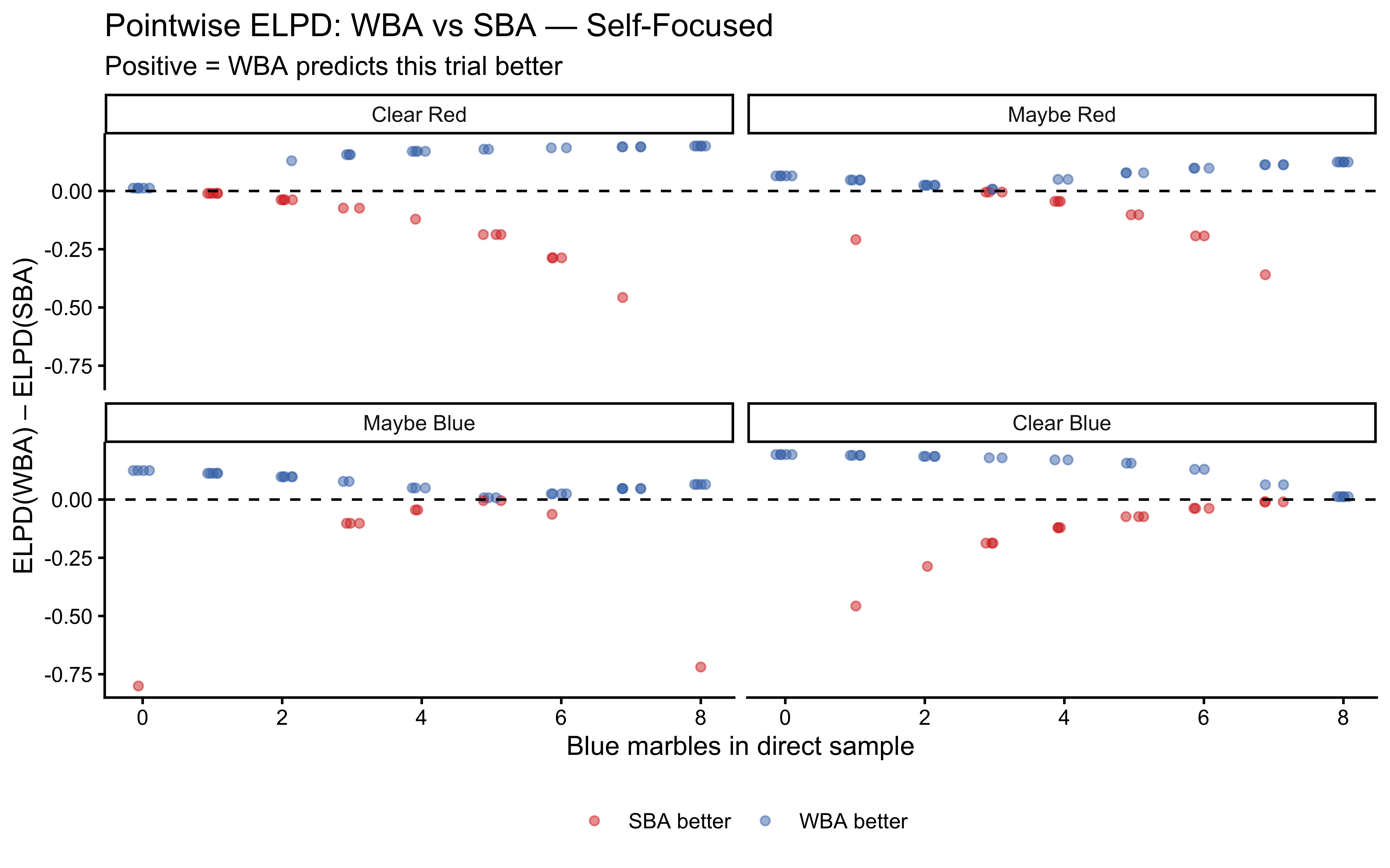 cat("=== Model Comparison: WBA vs. Circular Inference (Self-Focused agent) ===\n")## === Model Comparison: WBA vs. Circular Inference (Self-Focused agent) ===