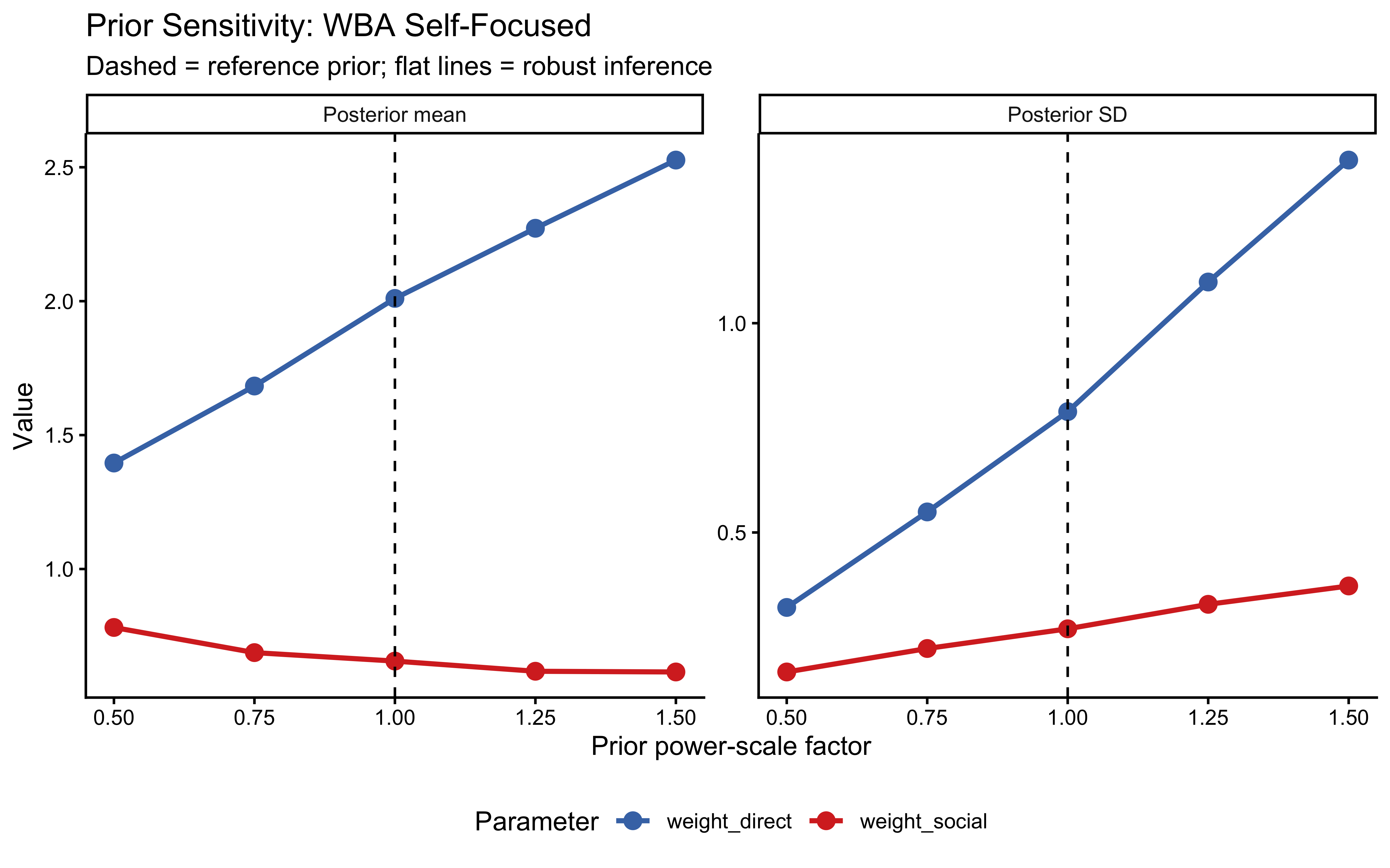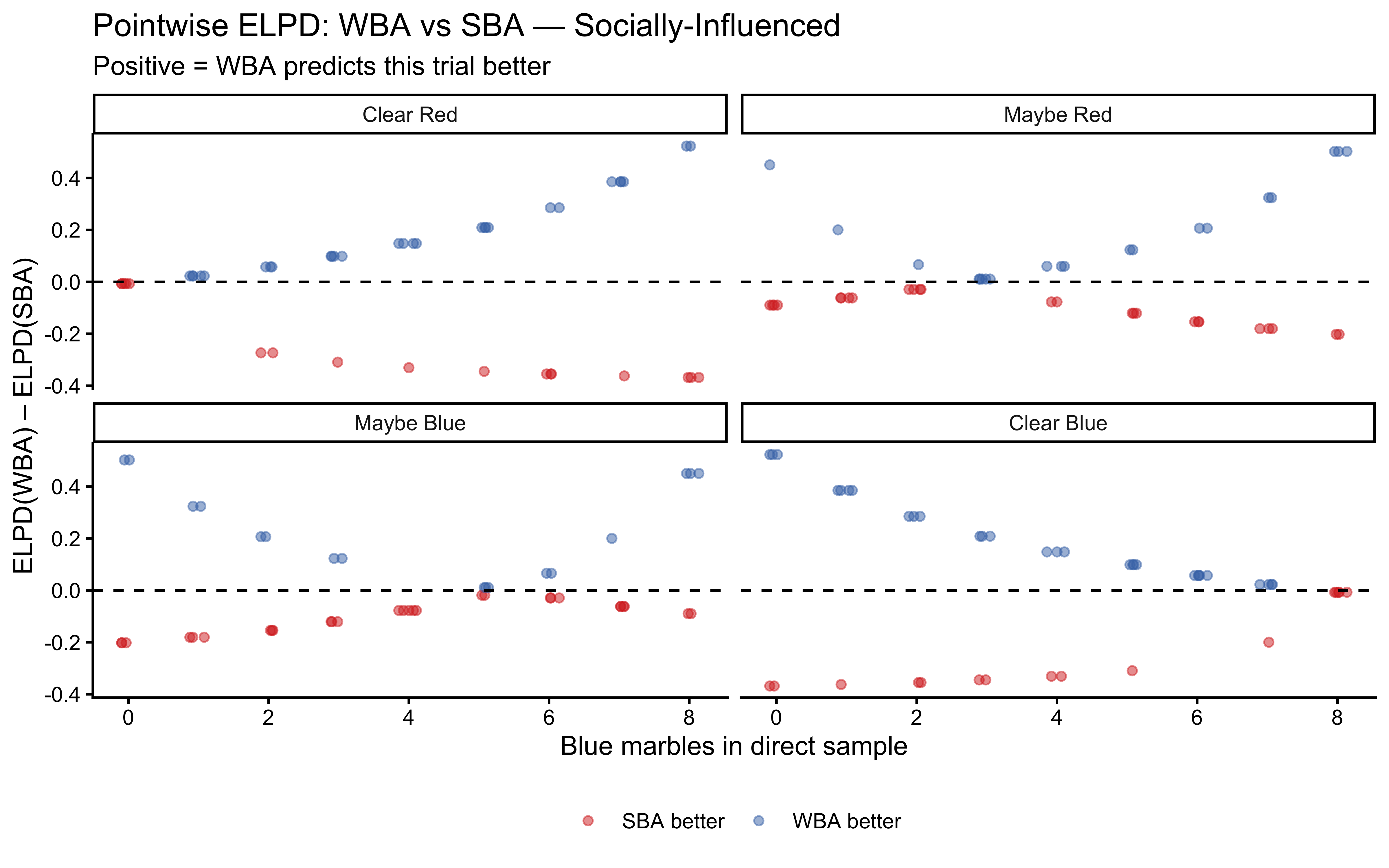 The choice between these models should be driven by the scientific question and validated by LOO model comparison. For a course task where the goal is to understand differential trust, the WBA is appropriate. For a clinical research question about whether patients overcount direct experience at a mechanistic level, circular inference is the scientifically motivated model.