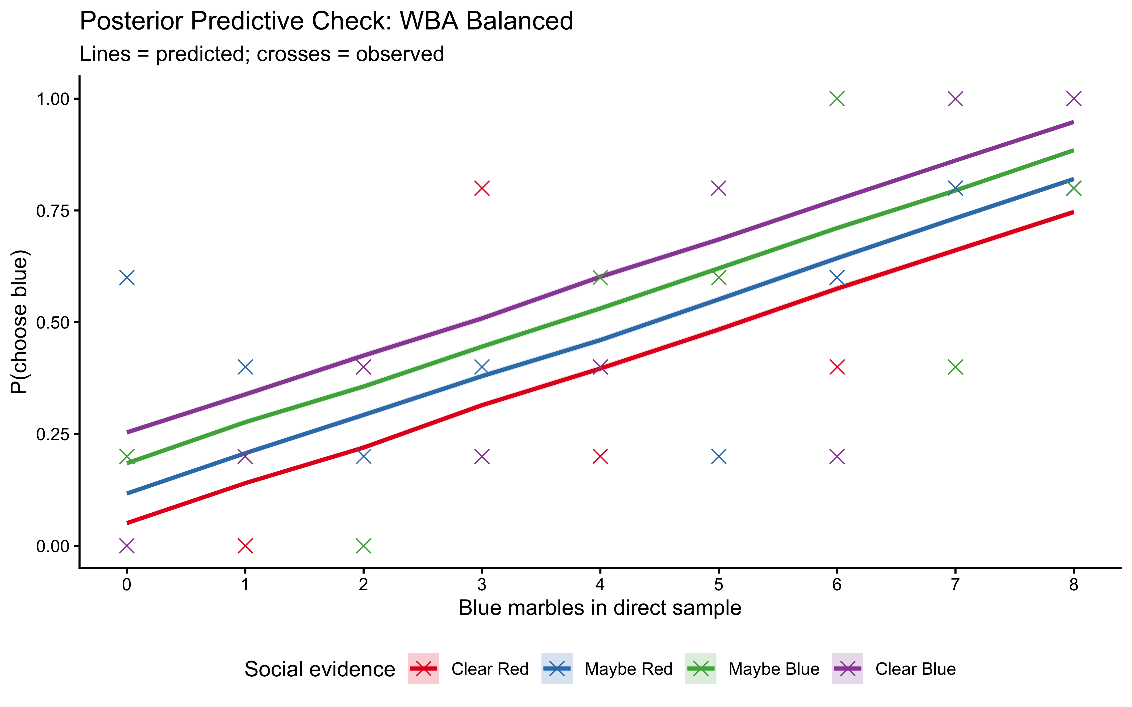 Identifiability note — WBA: \(w_d\) and \(w_s\) are jointly identified by the differential pattern of choices across trials where direct and social evidence conflict. With the full grid of 9 × 4 evidence combinations (repeated), both parameters are well-separated in the likelihood. We verify this computationally in the SBC section.