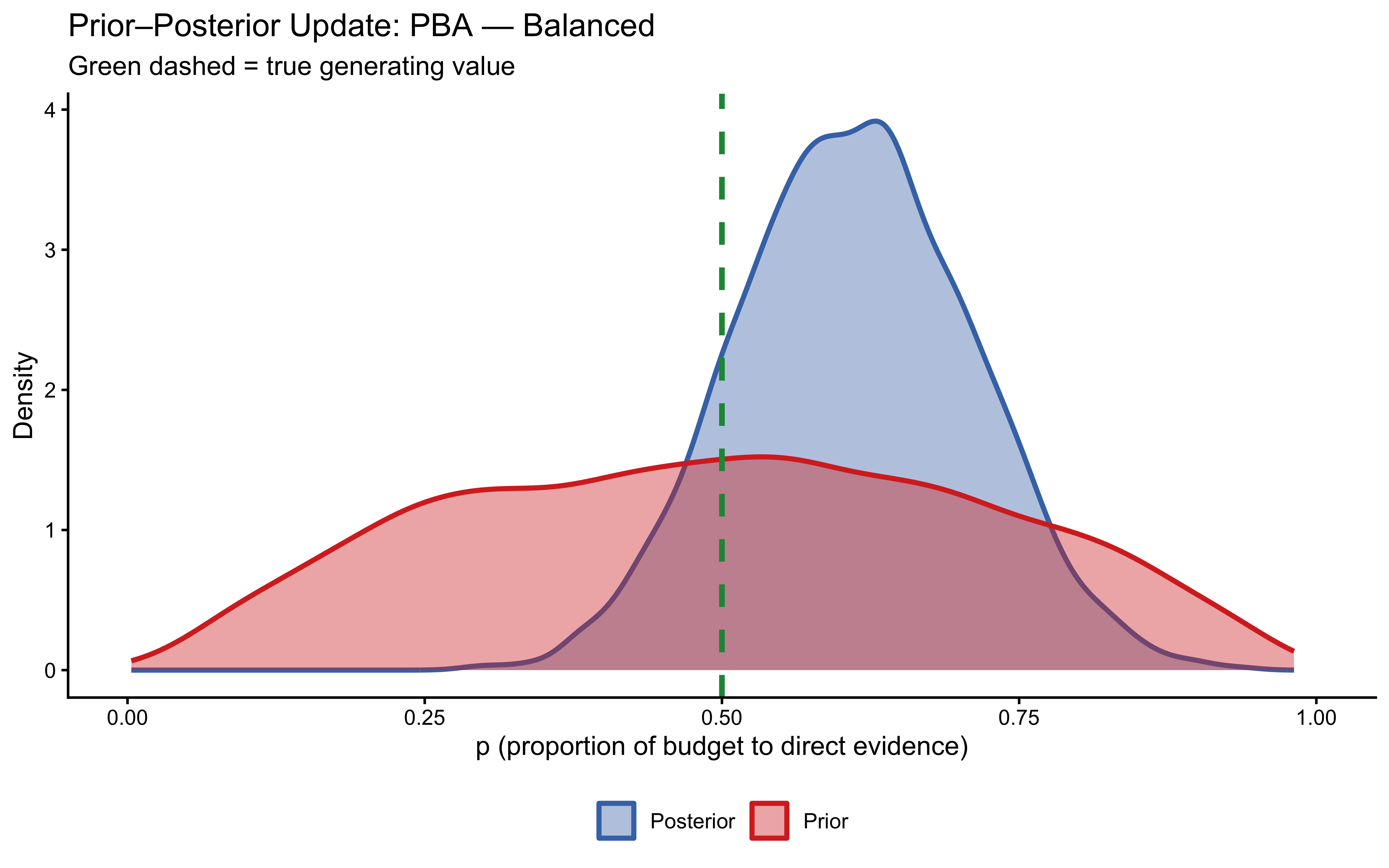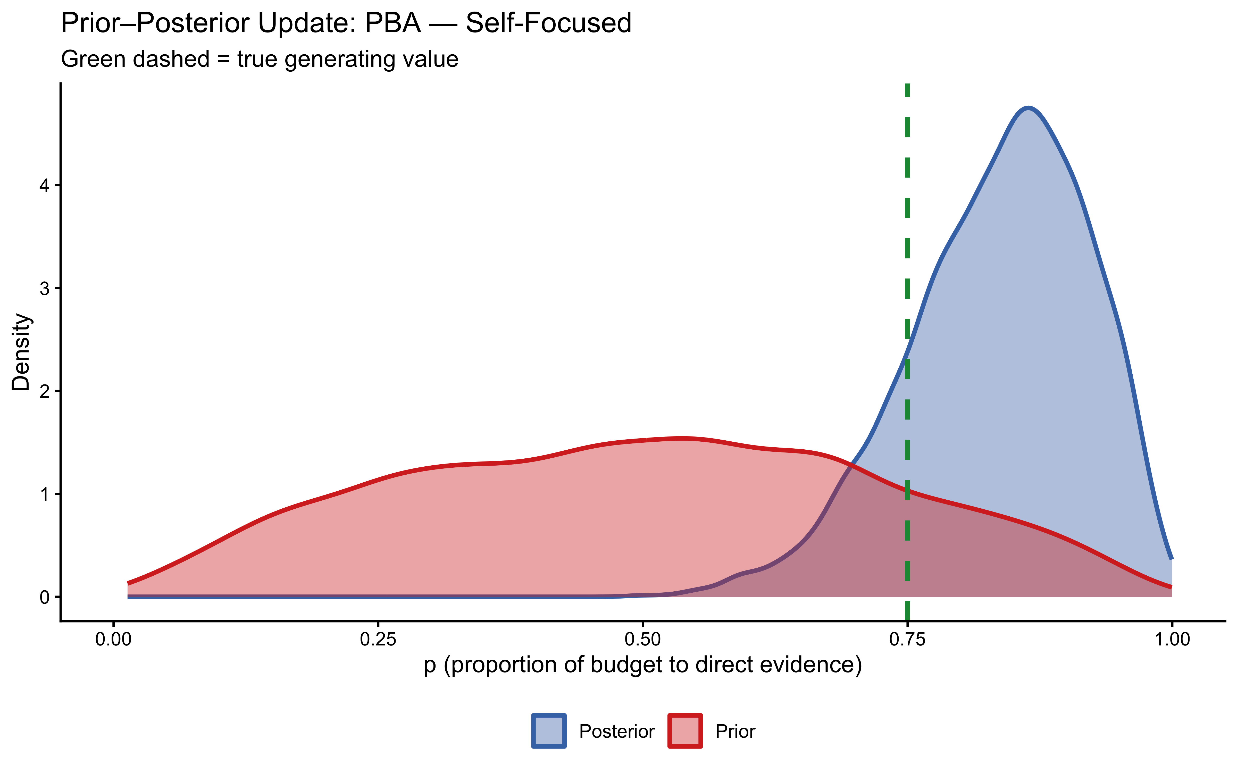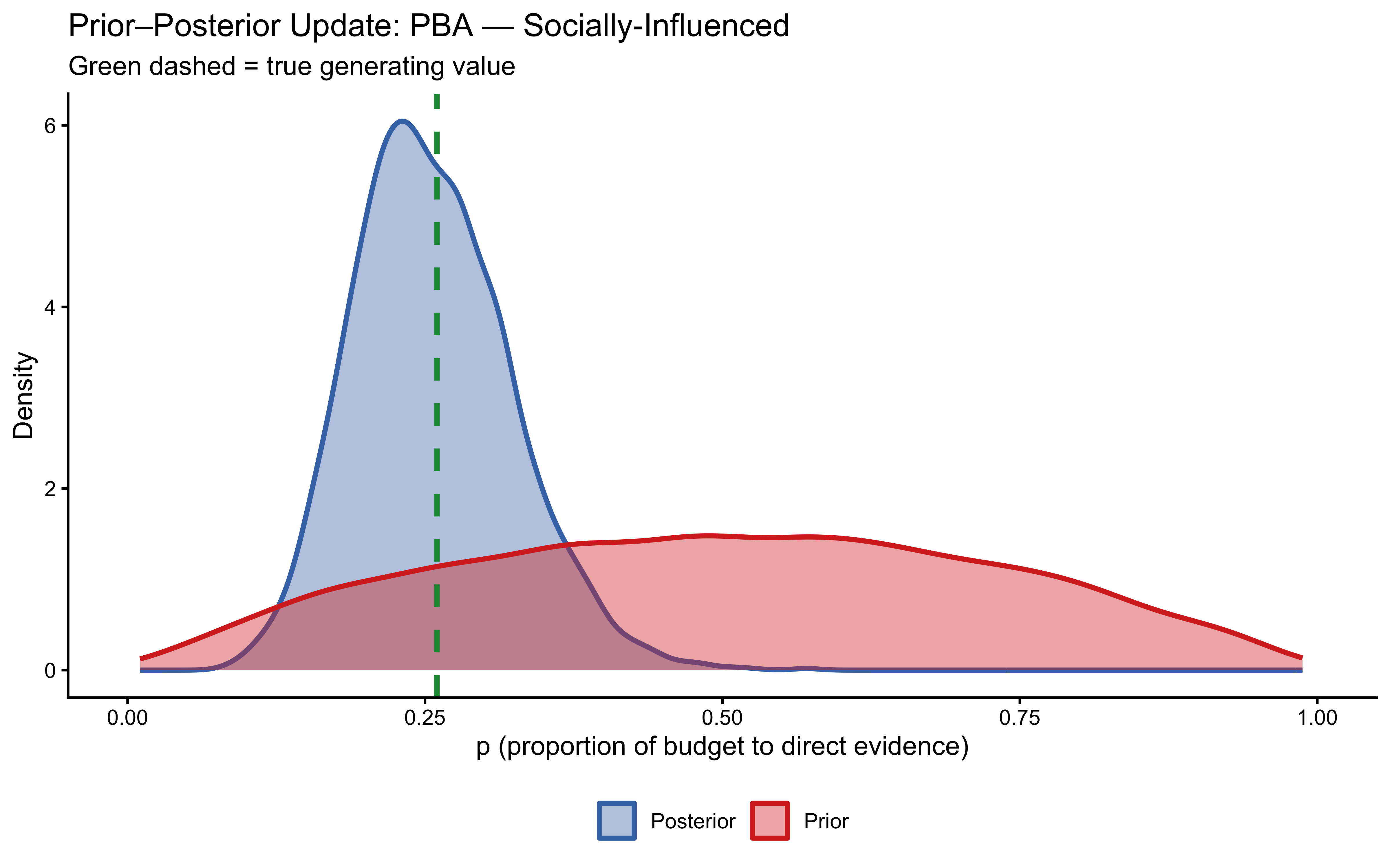 Identifiability note — PBA: \(p\) is identified whenever direct and social evidence point in conflicting directions. With 9 × 4 evidence combinations, the PBA is well identified. We verify this in SBC below.